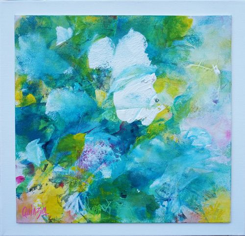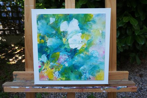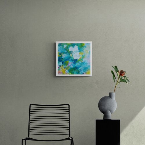 Composition réalisée sur un carton toilé 25 x 25 cm recouvert d’un vernis satiné et contrecollé sur un châssis 3D 29 x 29 cm peint en blanc. Une marge blanc mat est volontairement laissée autour du visuel et accentue sa mise en avant déjà apportée par le cadre 3D.
