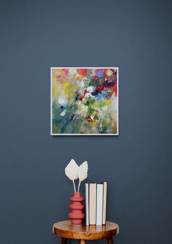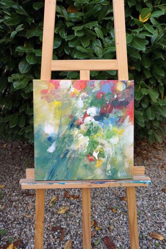 Composition florale abstraite contrastée et colorée réalisée à la peinture acrylique sur un fond préalablement structuré par différents papiers marouflés sur la toile. Format 40 x 40 x 1 cm. Les côtés sont peints en blanc, la toile est recouverte d’un vernis satinée. Elle est livrée prête à être accrochée sans encadrement.