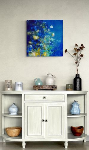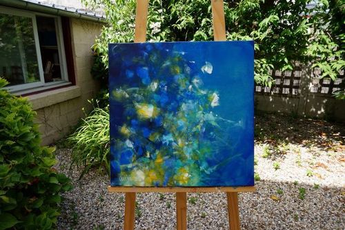 Composition florale dans des tonalités bleues travaillées en transparence à la peinture acrylique en superposition de fines couches colorées. Des touches plus épaisses dans des tonalités claires structurent et viennent rehausser l’ensemble. La toile format 50 x 50 est recouverte d’un vernis mat anti UV, les côtés sont peints en blanc, elle est livrée prête à être accrochée sans encadrement.