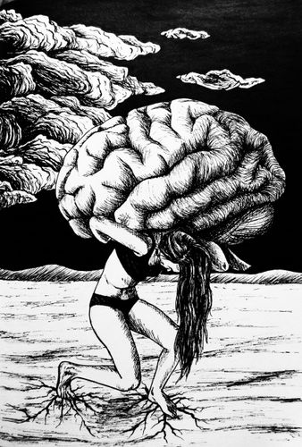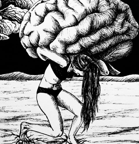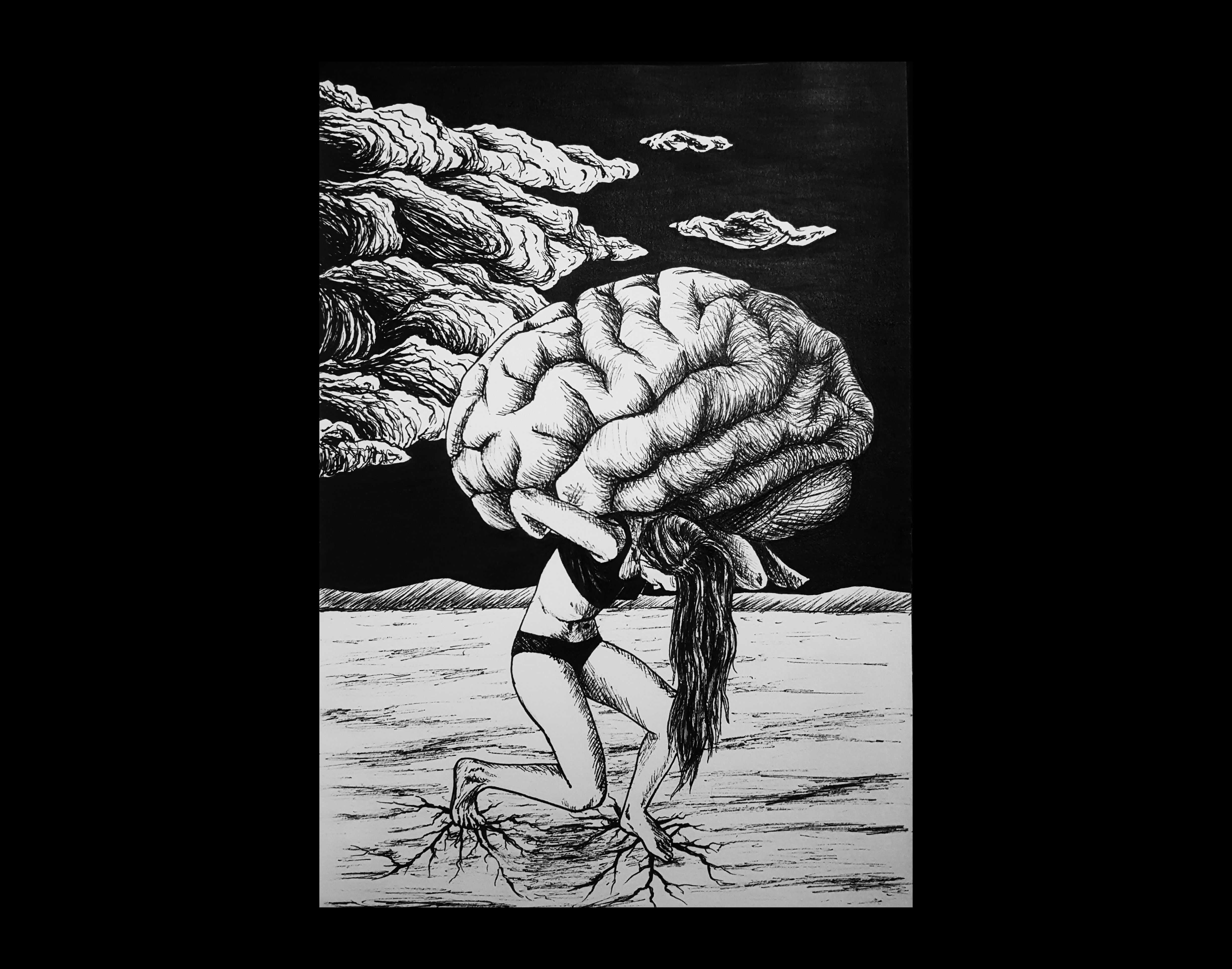 Dessin à l’encre de Chine sur papier réalisé à l’occasion du “Inktober” d’octobre 2021. Il s’agit d’un paysage intérieur illustrant le sentiment de charge mentale ou de “poids sur les épaules” que l’on peut ressentir, inspiré des représentations iconographiques d’Atlas. Il fait partie de la série “Paysages intérieurs”, série de 3 dessins à l’encre de Chine sur papier, au format A5.
