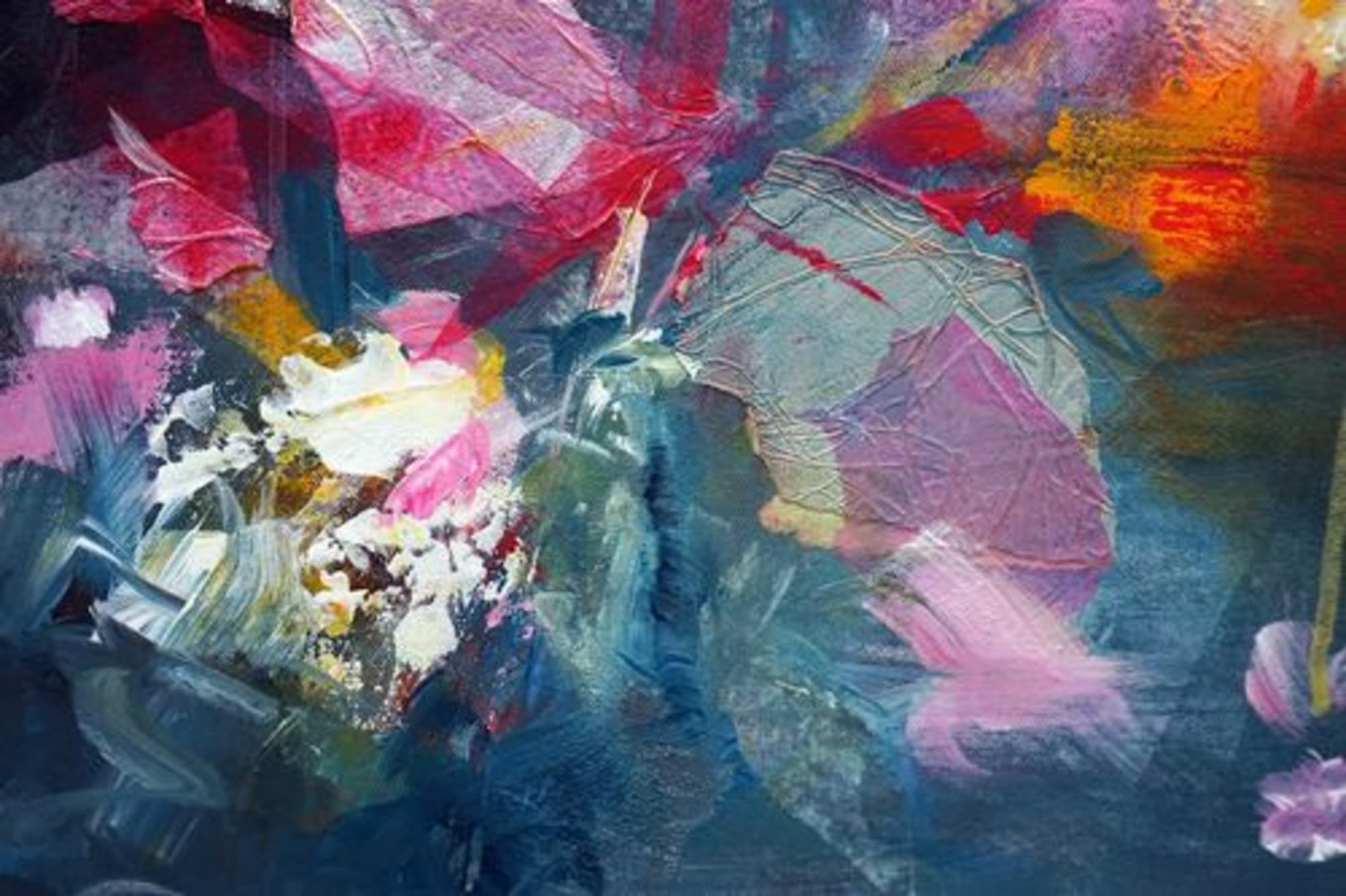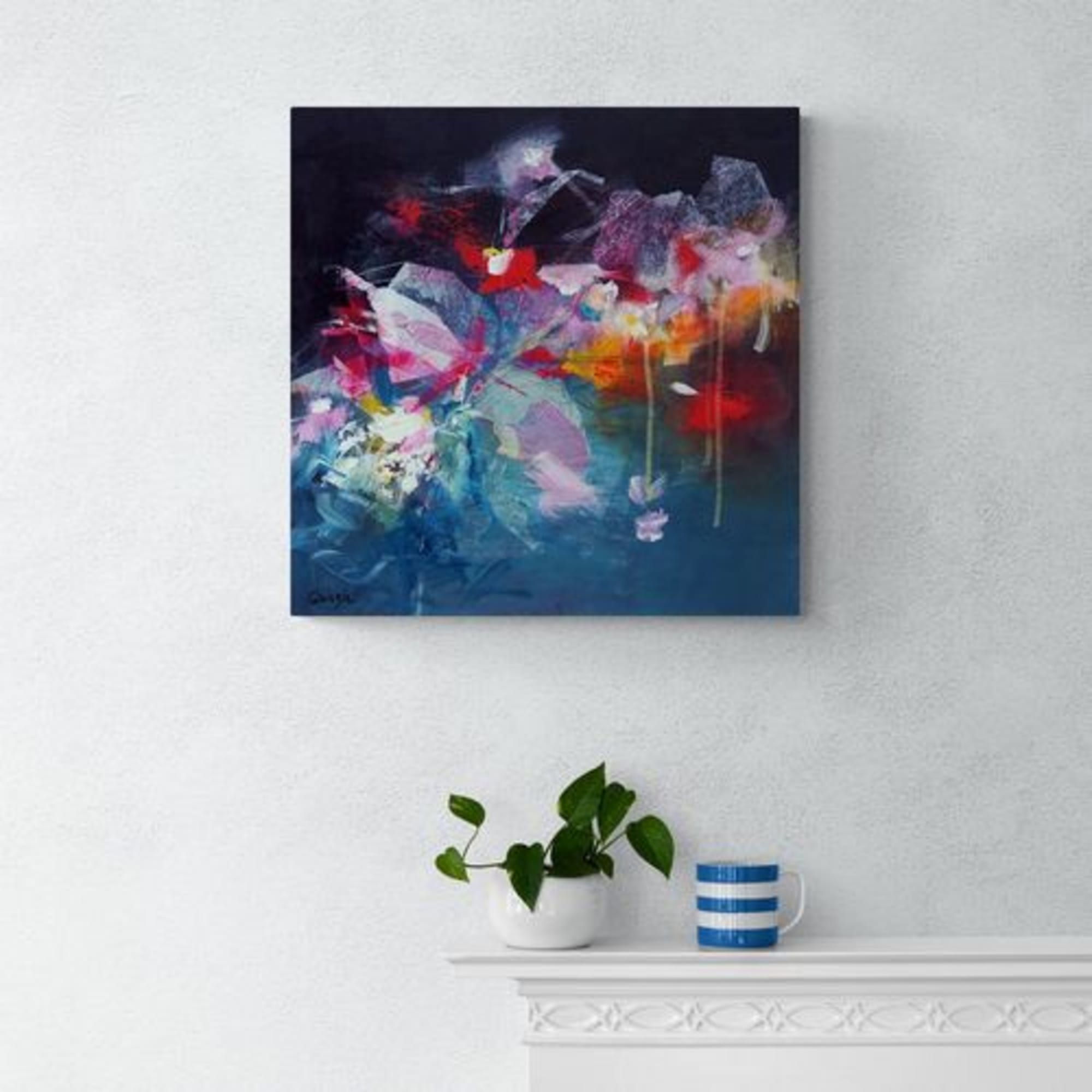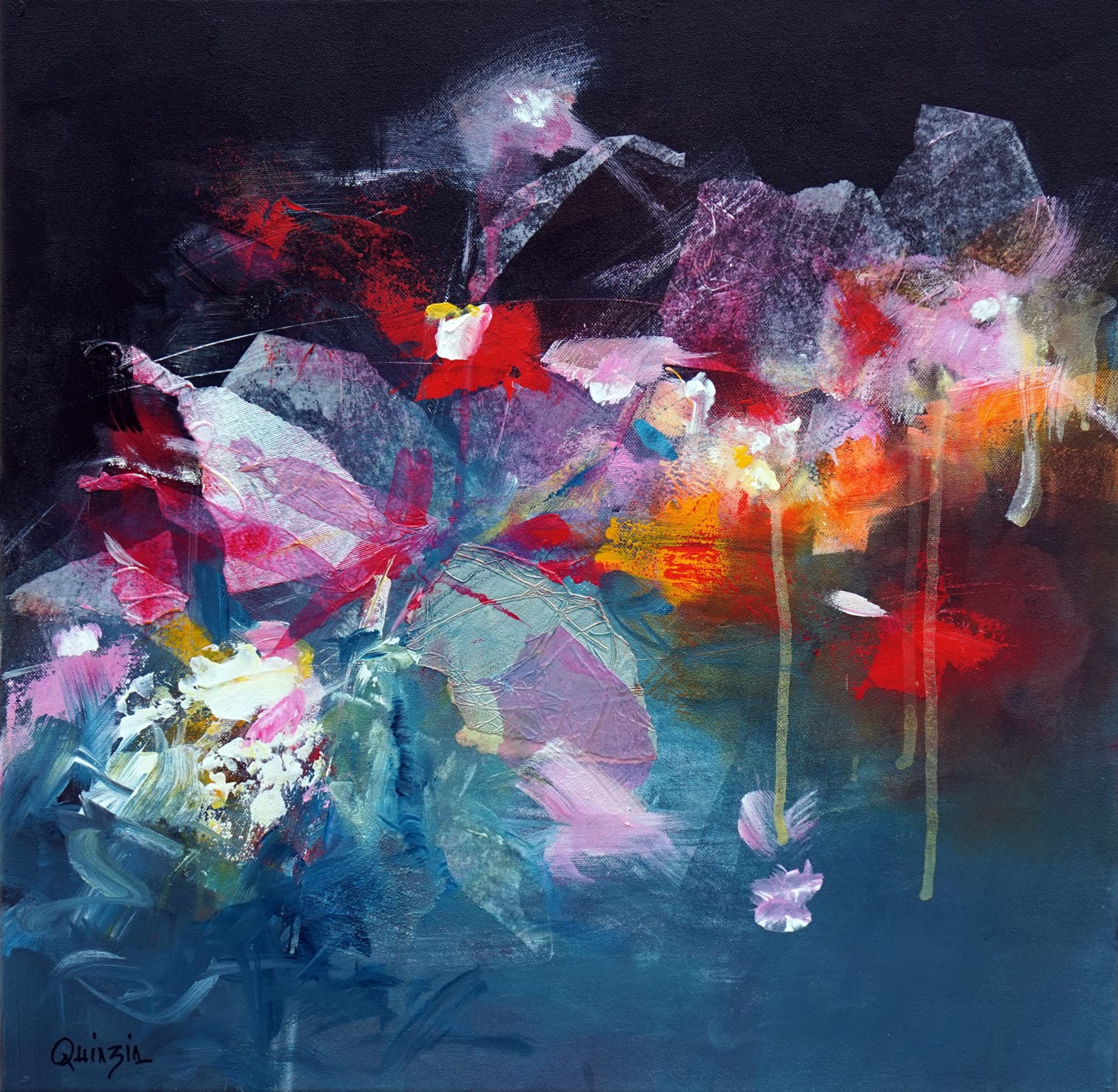 Des fleurs “lucioles” qui éclairent la nuit. Mélanges de papiers marouflés sur la toile pour structurer la composition et de peinture acrylique utilisée en à la fois au couteau et en jus très fluides pour la lumière. Le tableau est recouvert d’un vernis mat anti uv, les bords sont peints en noir. La toile est livrée prête à être accrochée.