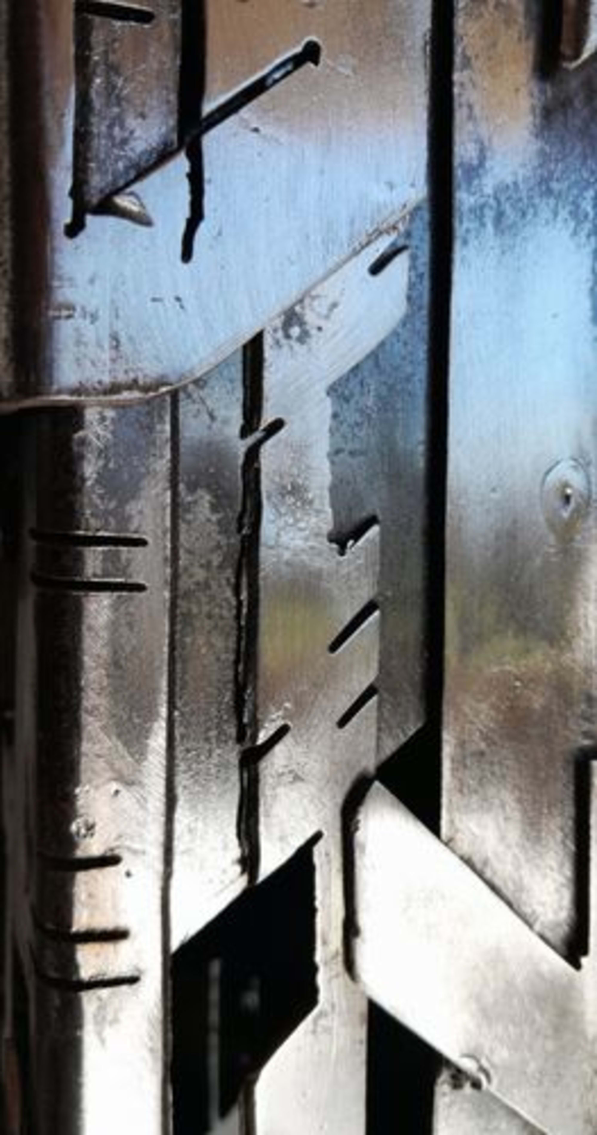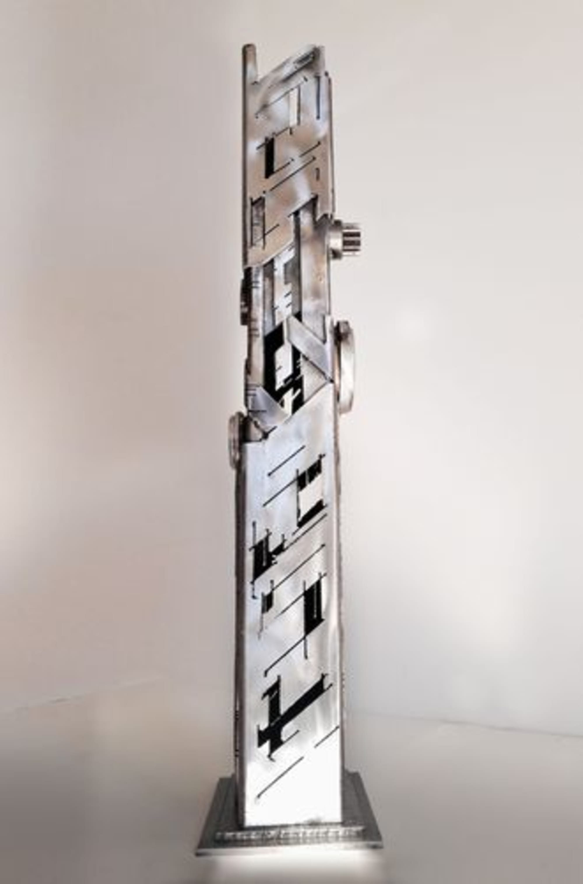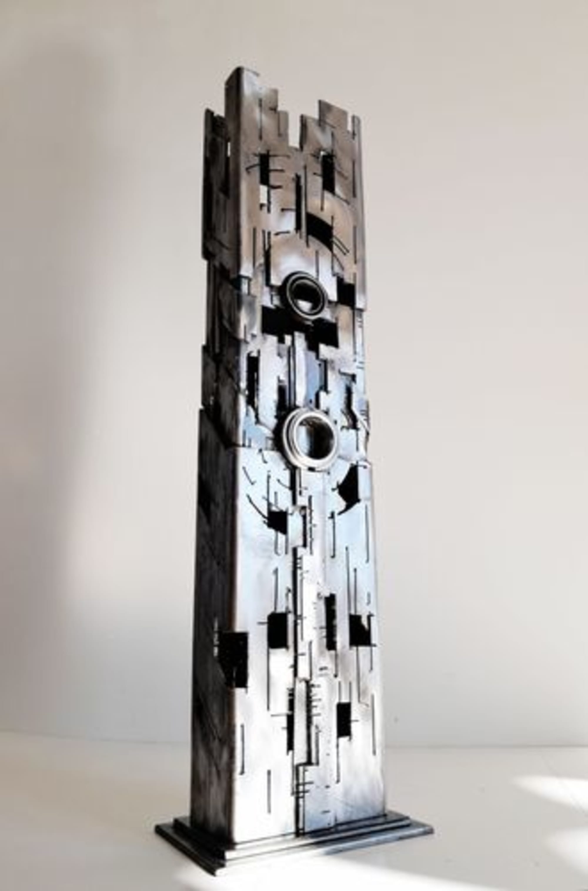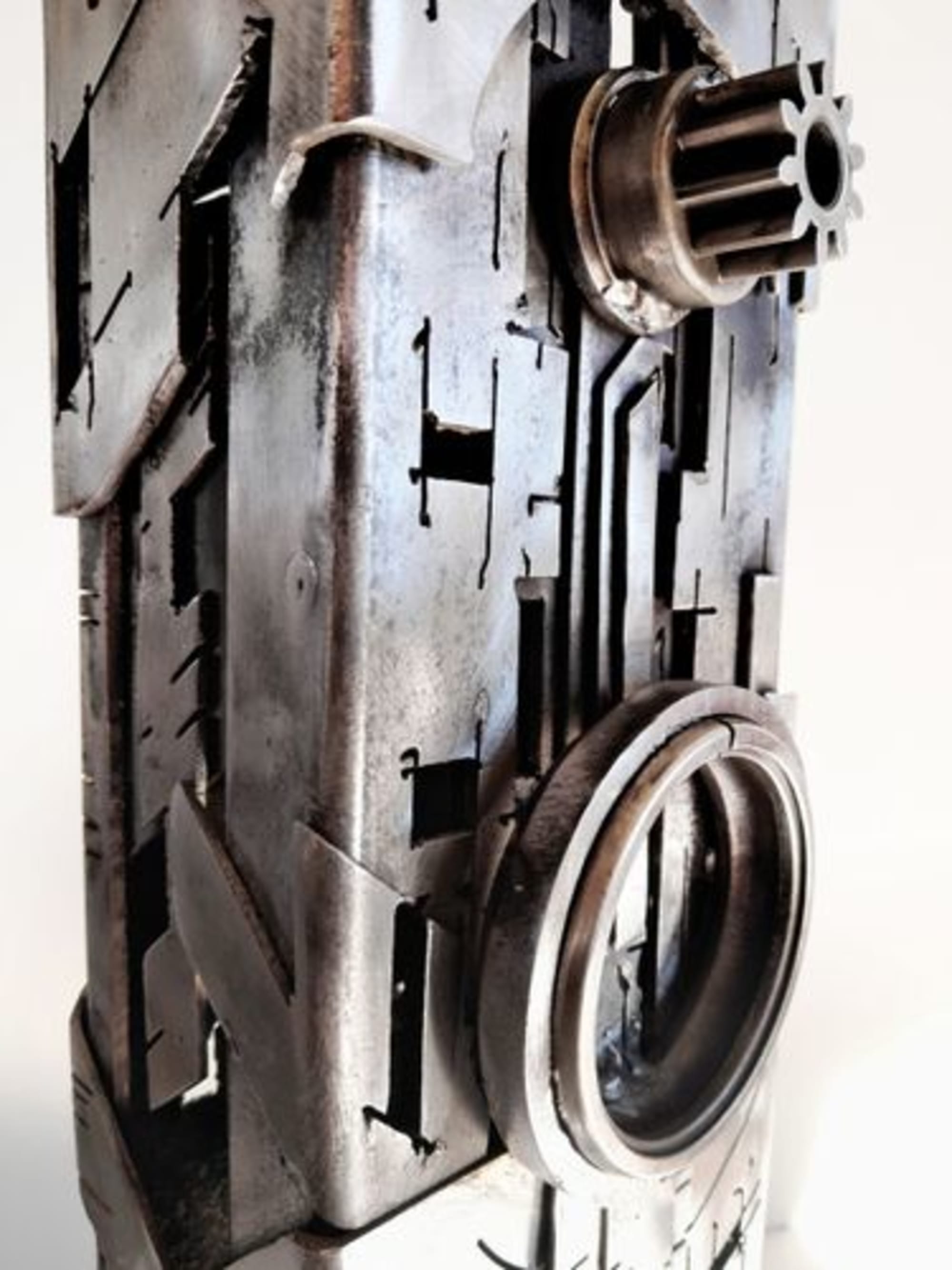 Source d’inspiration : Univers urbain futuriste .Pièce réalisée dans de l’acier de de récupération recyclé en œuvre d’art, dans une démarche “écoresponsable”. C’est une œuvre qui vit aussi bien le jour que la nuit, avec un éclairage intérieur “led” basse tension possible .