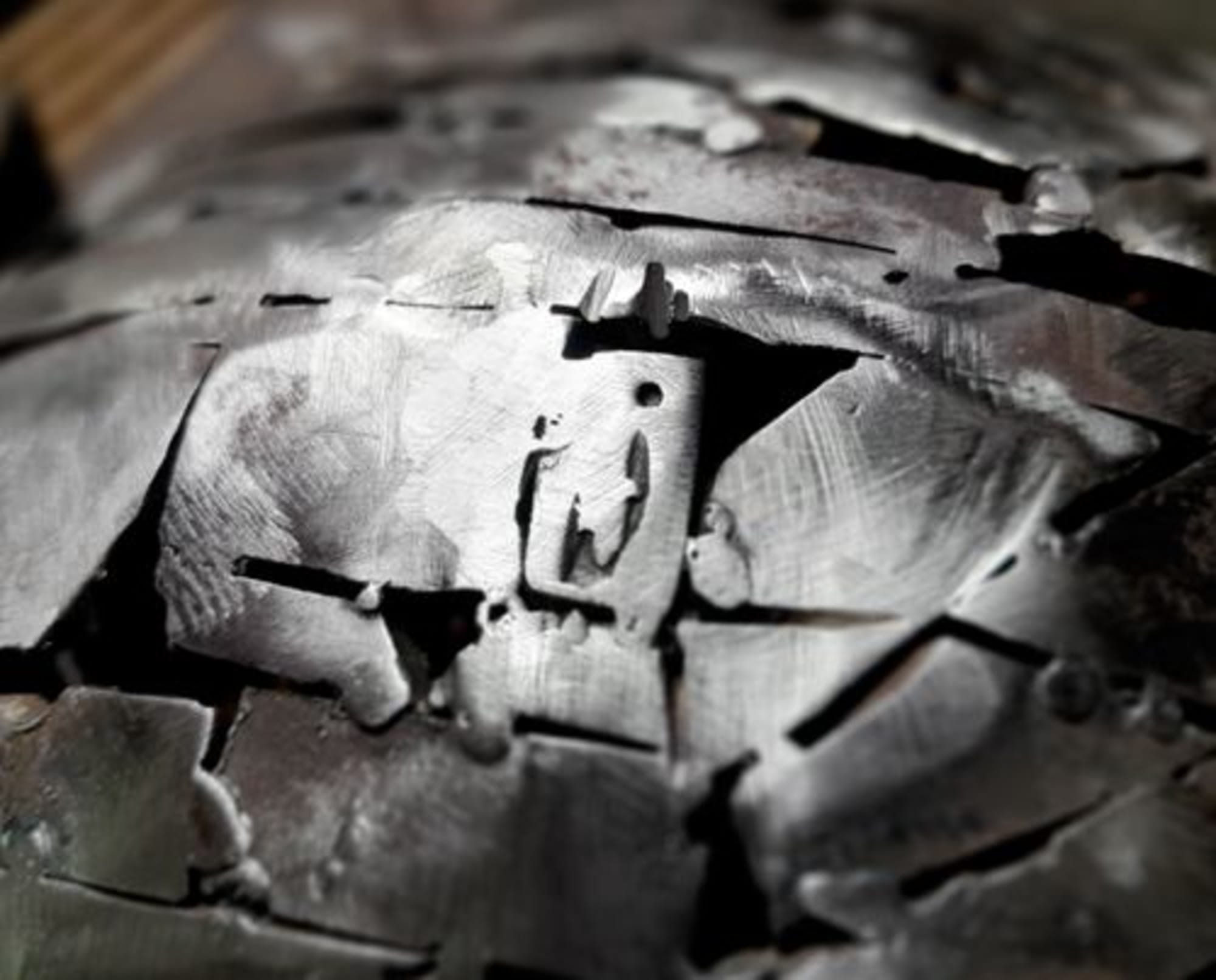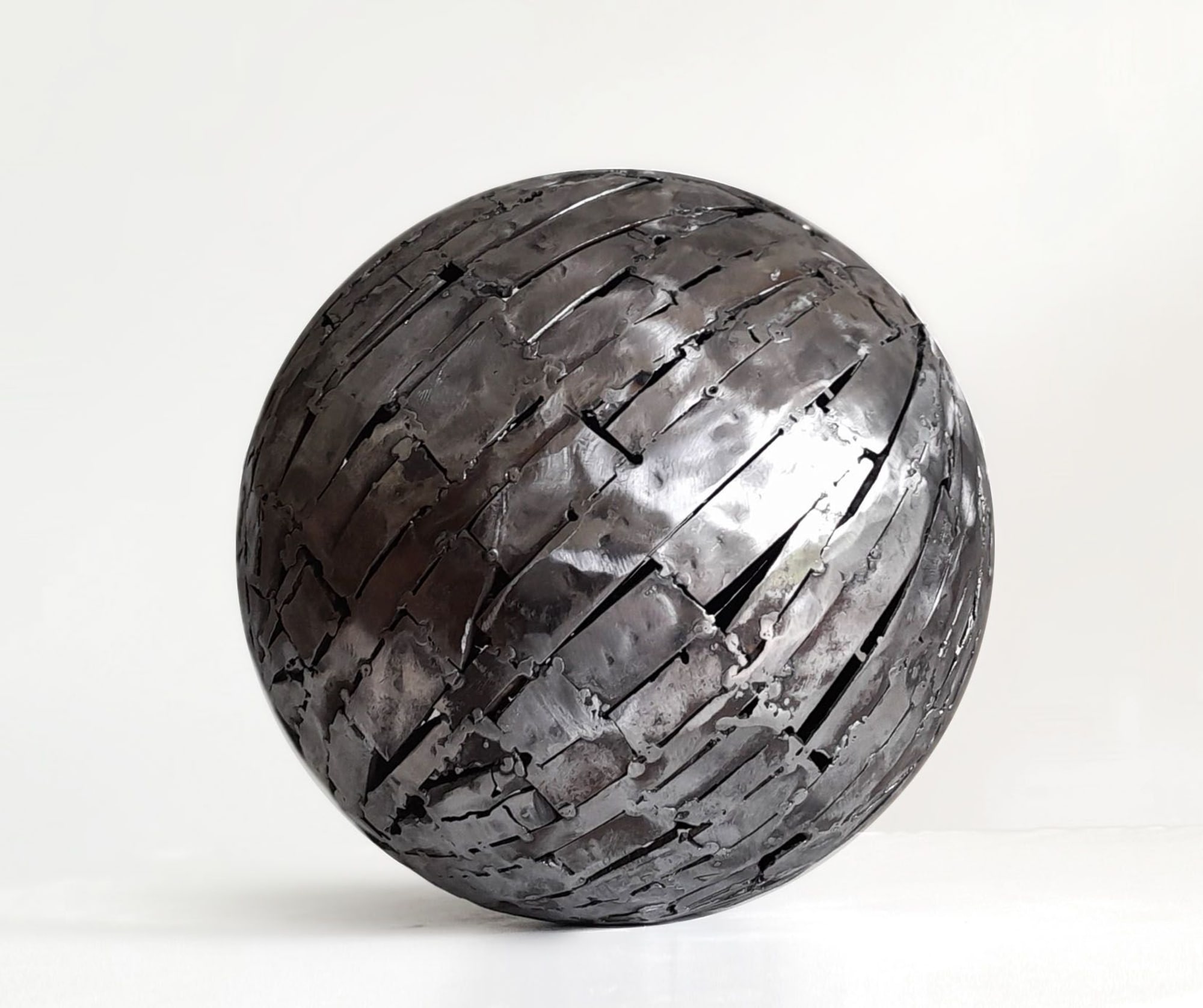 méticuleusement soudées à l’arc composent cette structure sphérique, le tout meulé tout en laissant les soudures discrètes mais présentes afin de donner ce style “techno organique” propre à beaucoup de mes pièces.