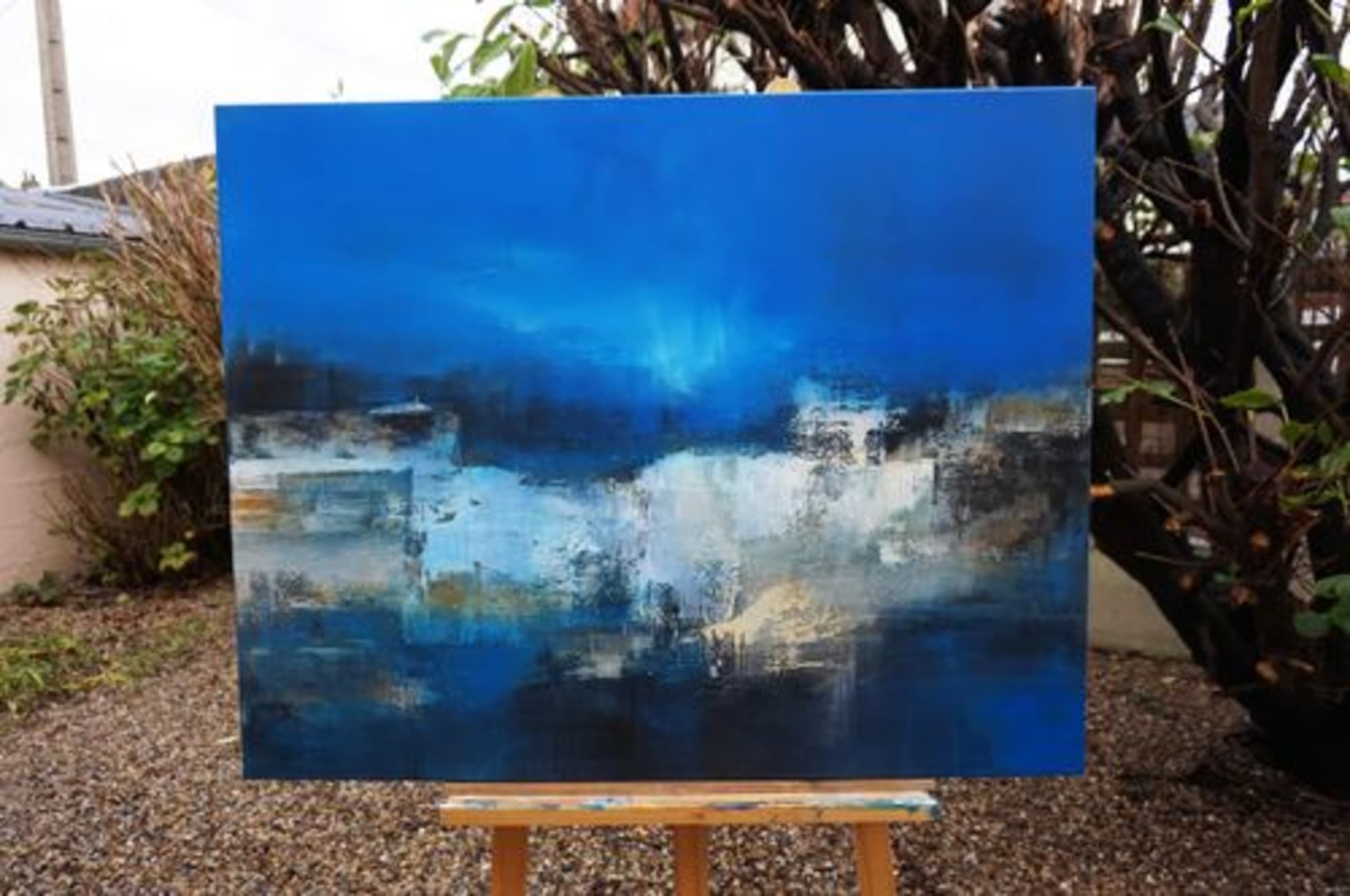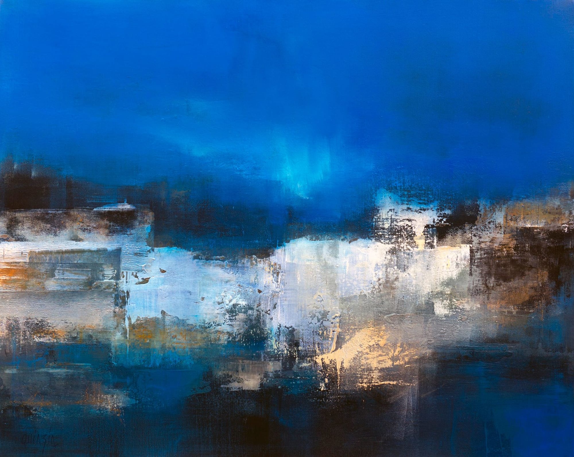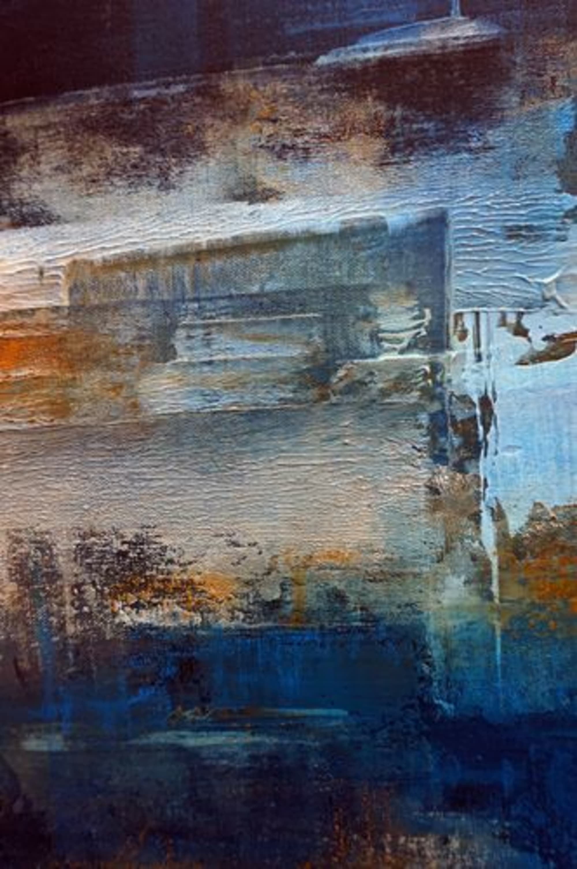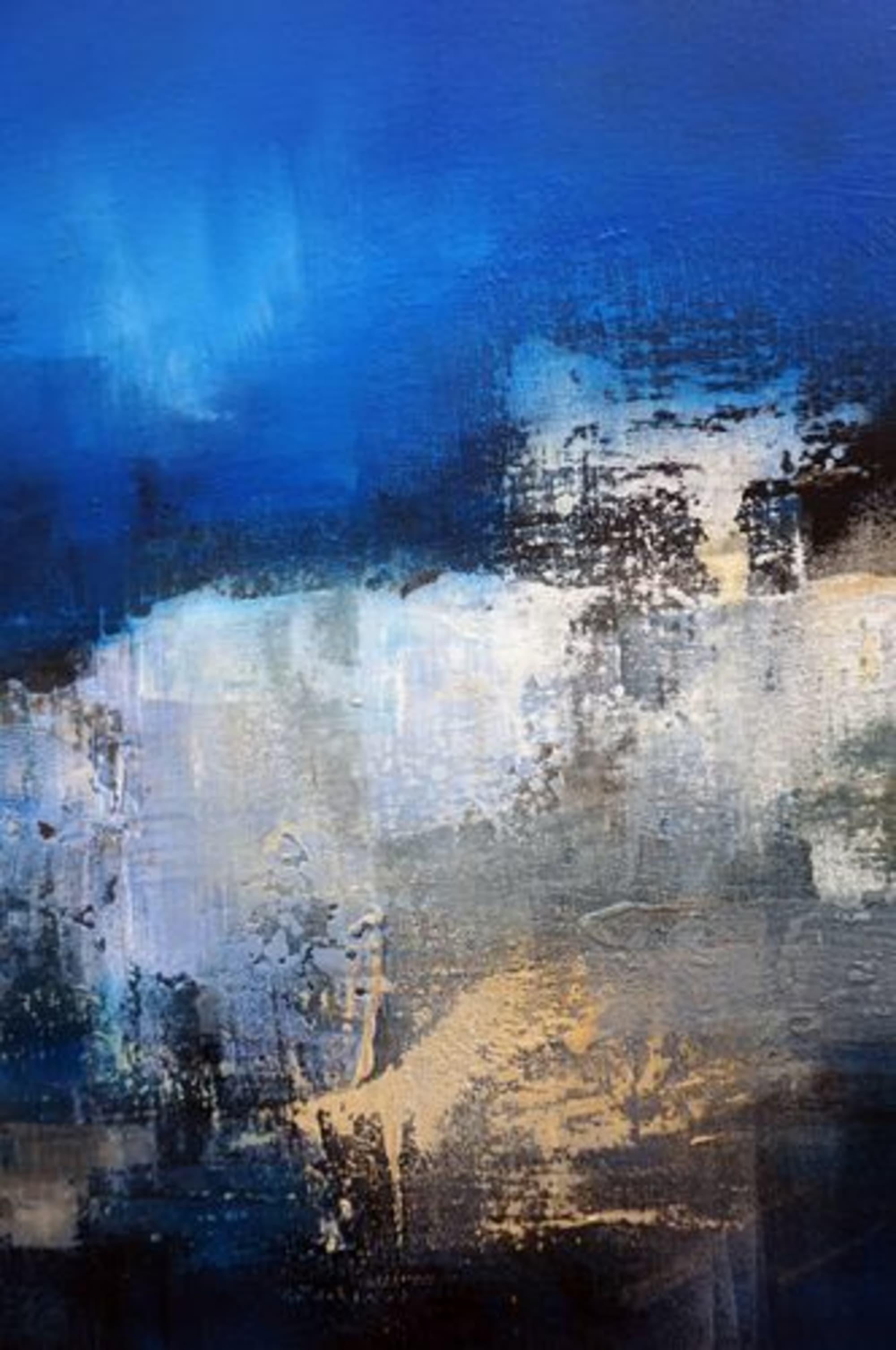 Nuances, opacité et transparence de ces bleus que j’aime tant en opposition avec l’épaisseur d’un travail sur la matière réalisé en technique mixte sur toile de lin 72 x 90 cm.