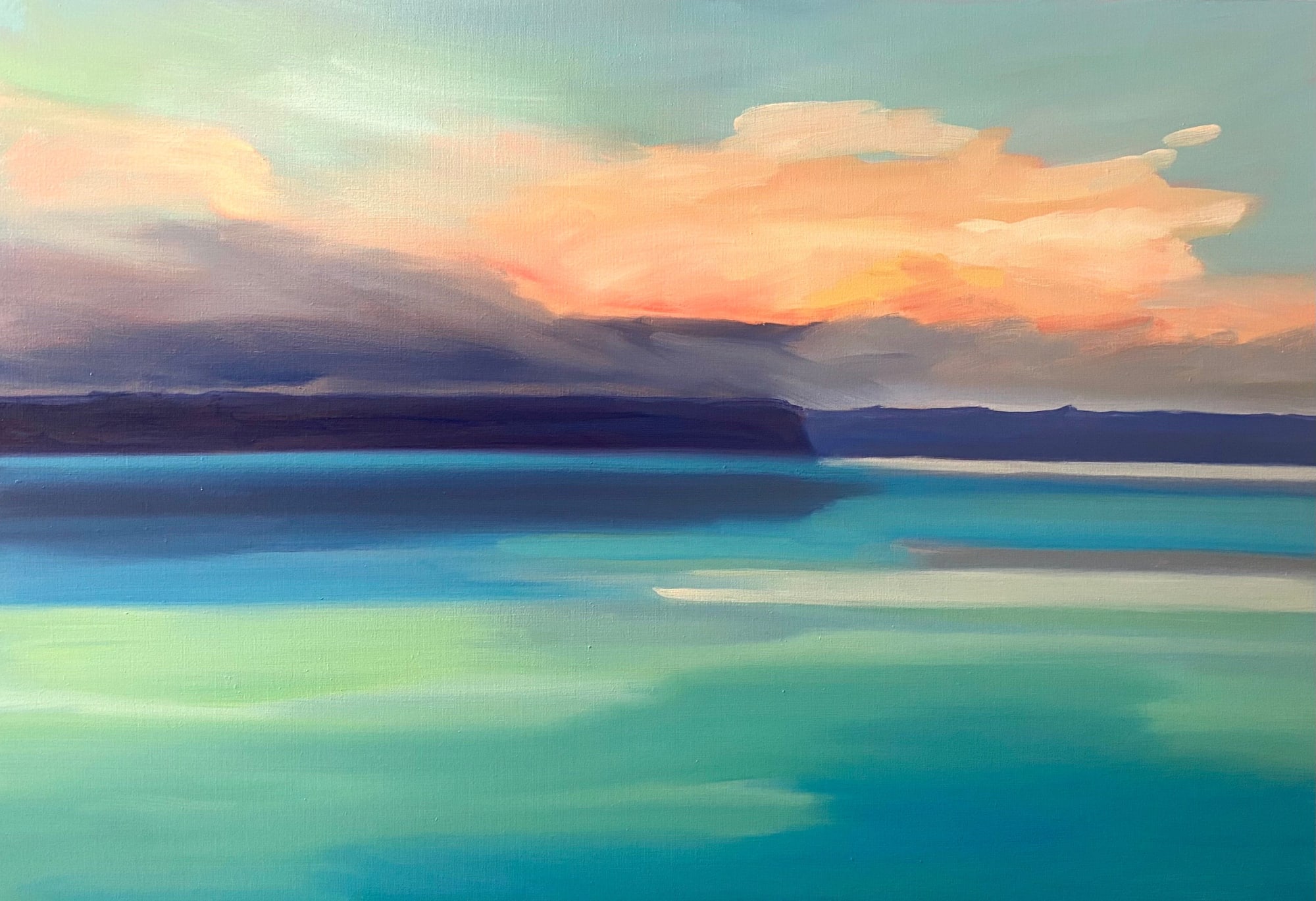 Peinture à l’huile sur toile. Encadrement type caisse américaine en bois clair.