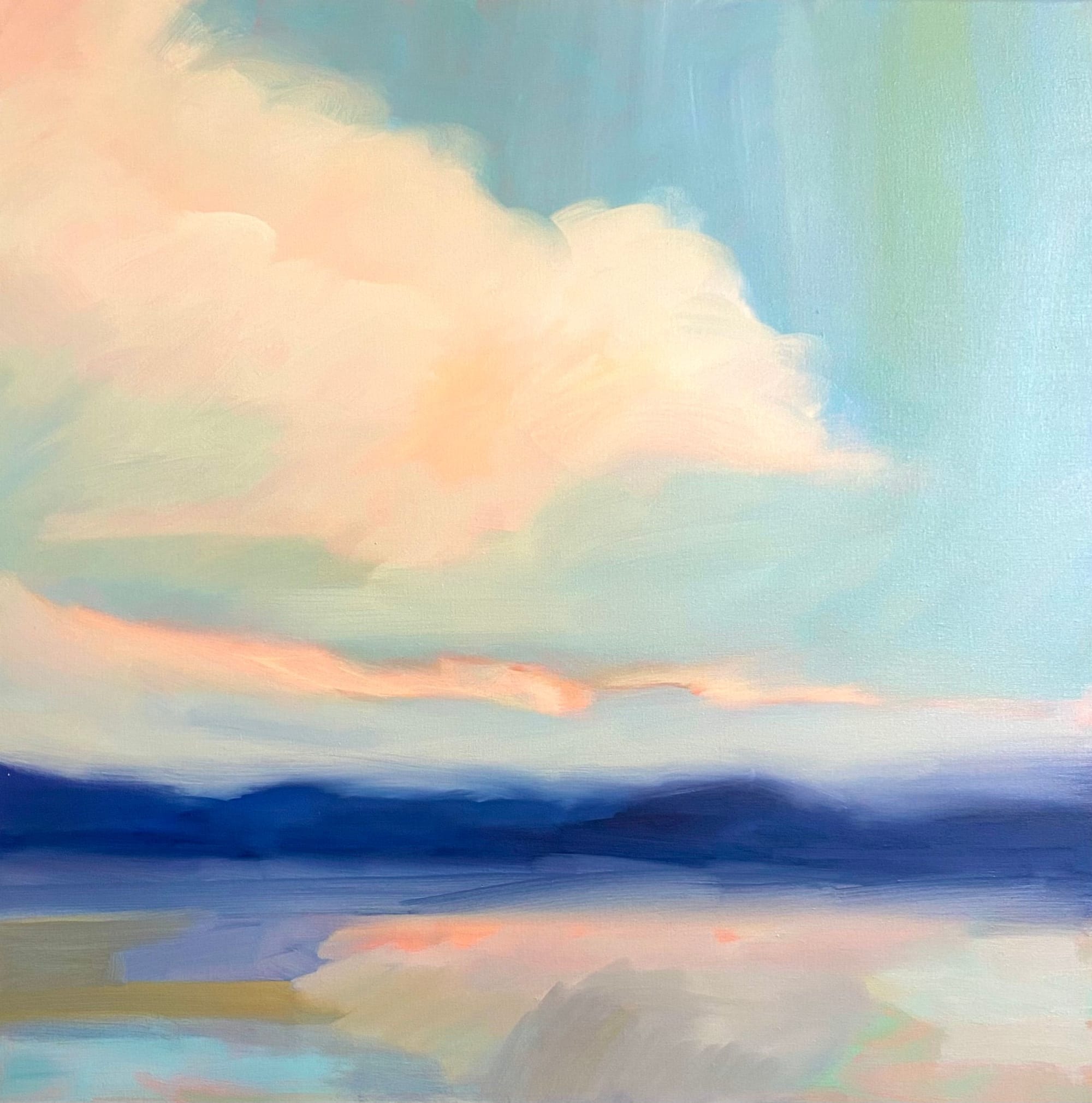 Peinture à l’huile sur toile. Encadrement type caisse américaine en bois clair.