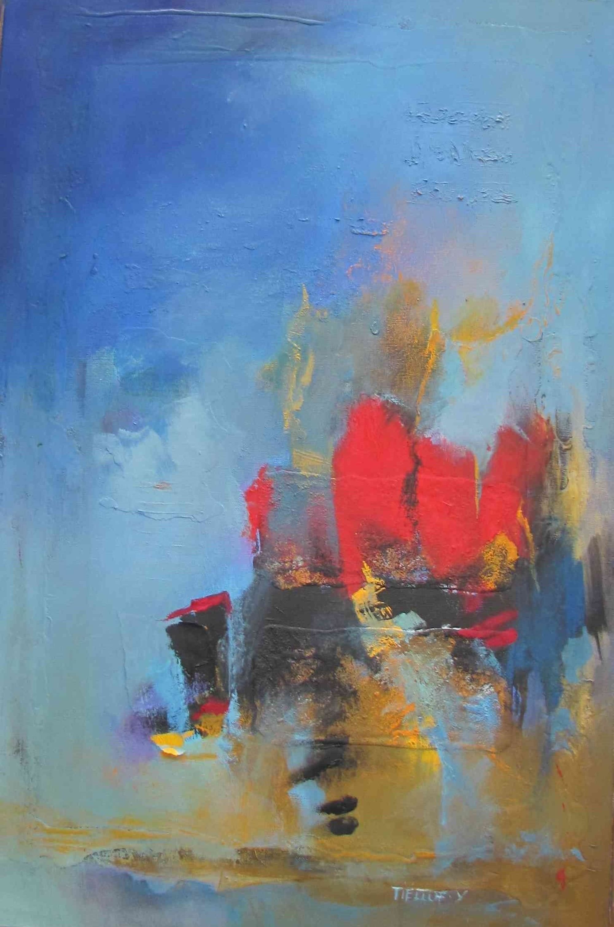 Artiste de formation école des beaux-arts, Aix-en-Provence. Spécialisation peinture, gravure. L’abstraction me permet d’avoir une liberté de mouvement et de couleurs que je n’ai pas avec la contrainte du dessin en figuration. Je travaille en parallèle l’abstraction et la figuration. La peinture depuis mon enfance ne m’a jamais quittée. J’éprouve le besoin de peindre quotidiennement. Dans cette toile les éléments de l’eau et du feu sont représentés.