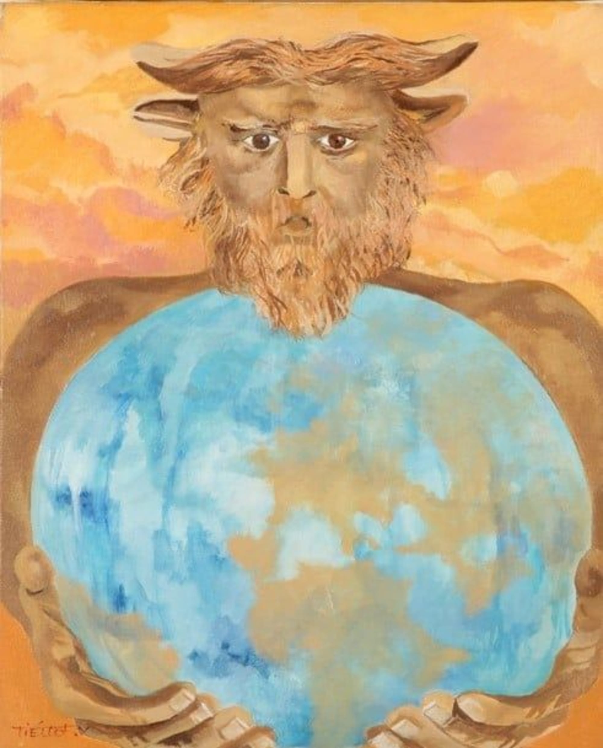 Le dieu fluvial Celte porte le monde. L’eau prédomine sur la planète. Référence à la montée des eaux partout dans le monde et urgence climatique.