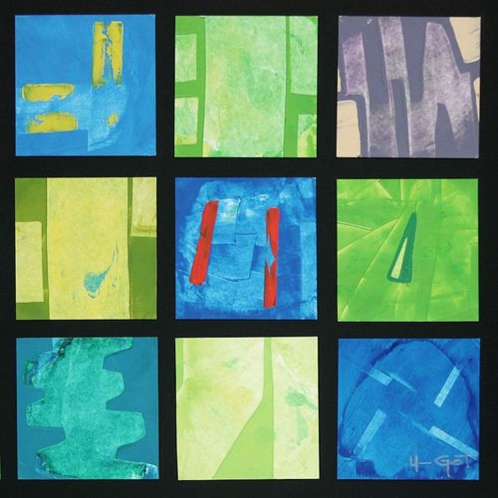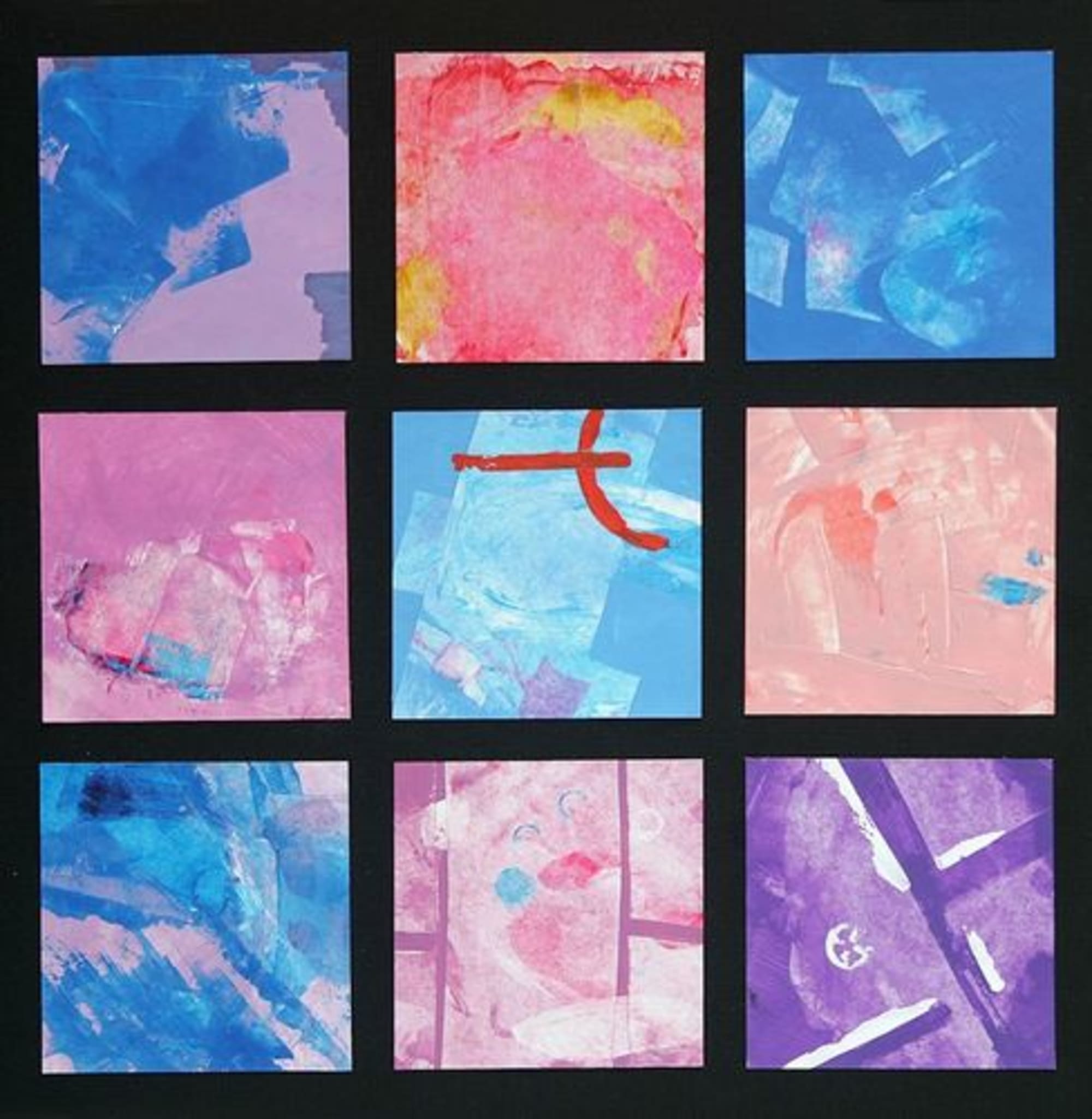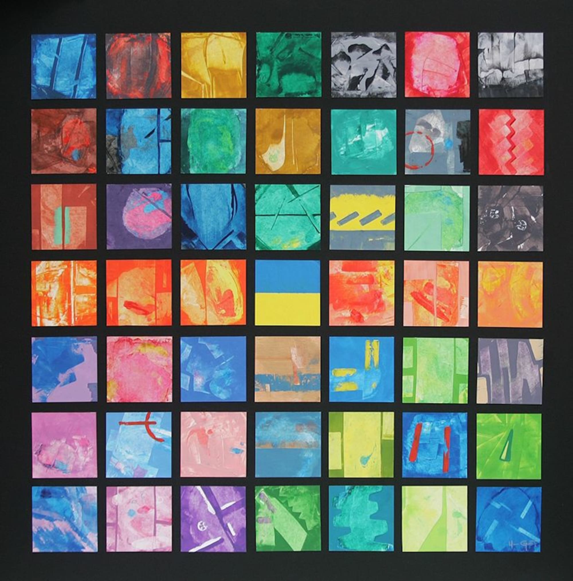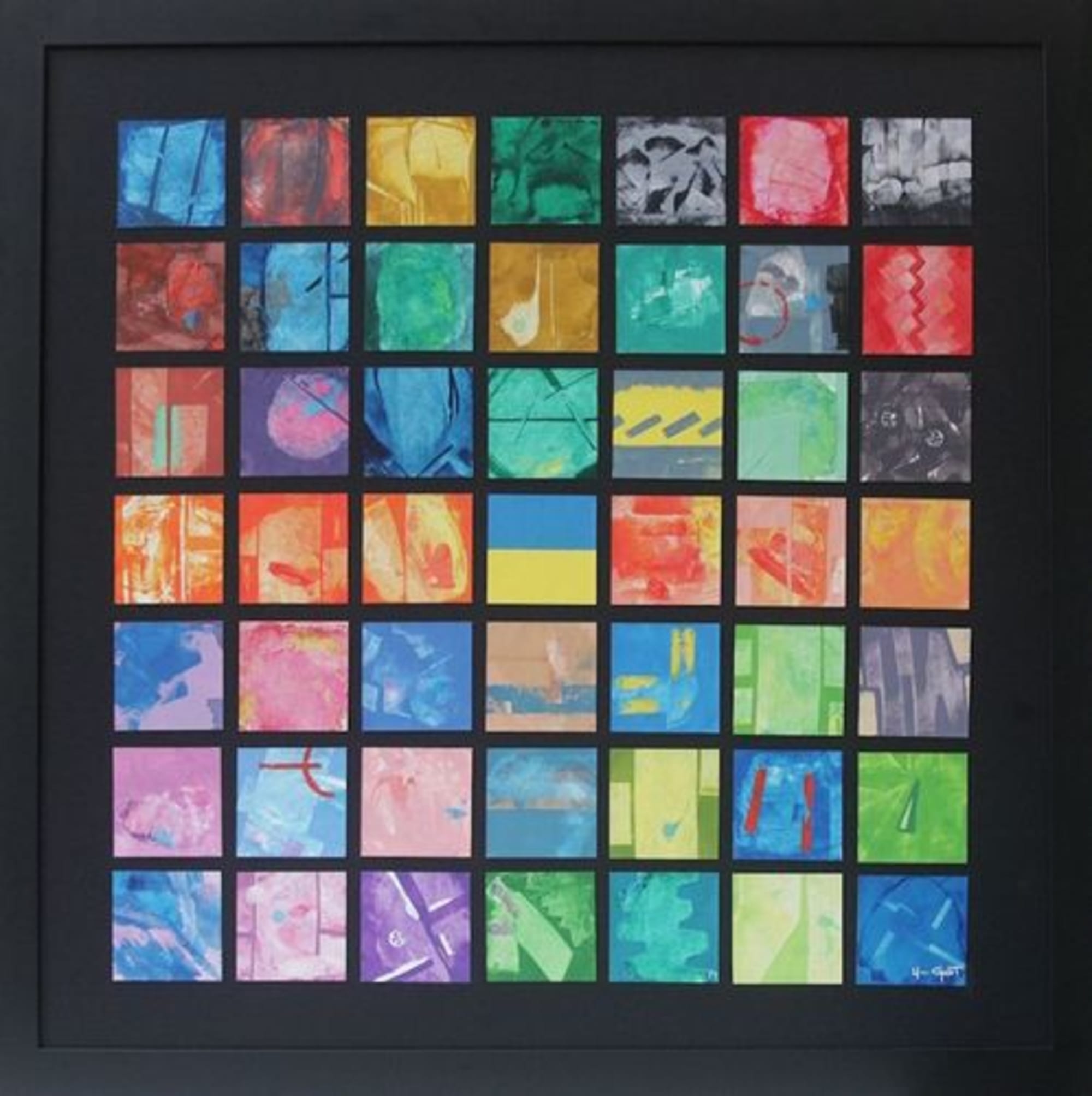 Patchwork composé de 49 carrés de 8,5x8,5cm chacun, peints à l’acrylique sur carton.
