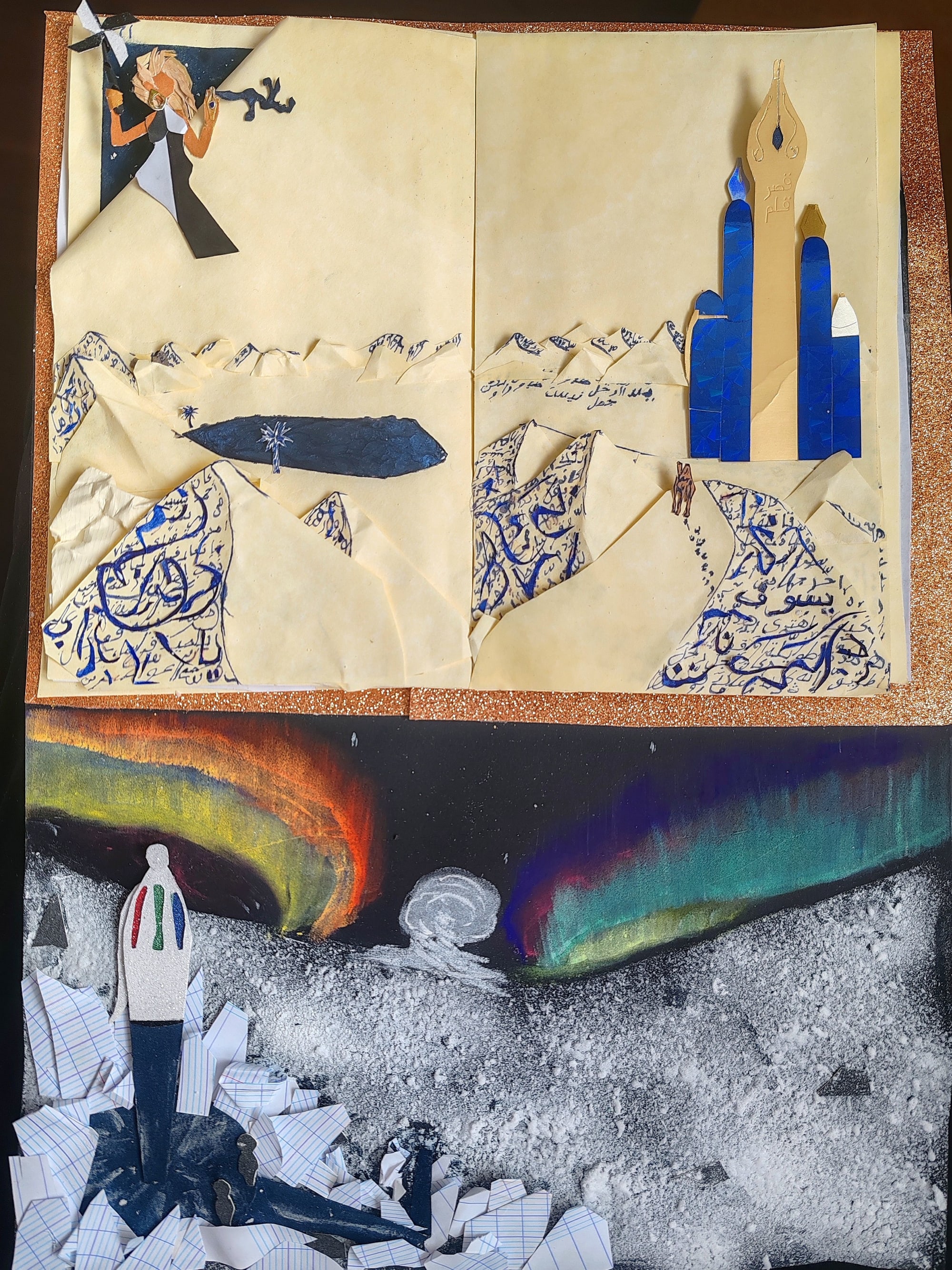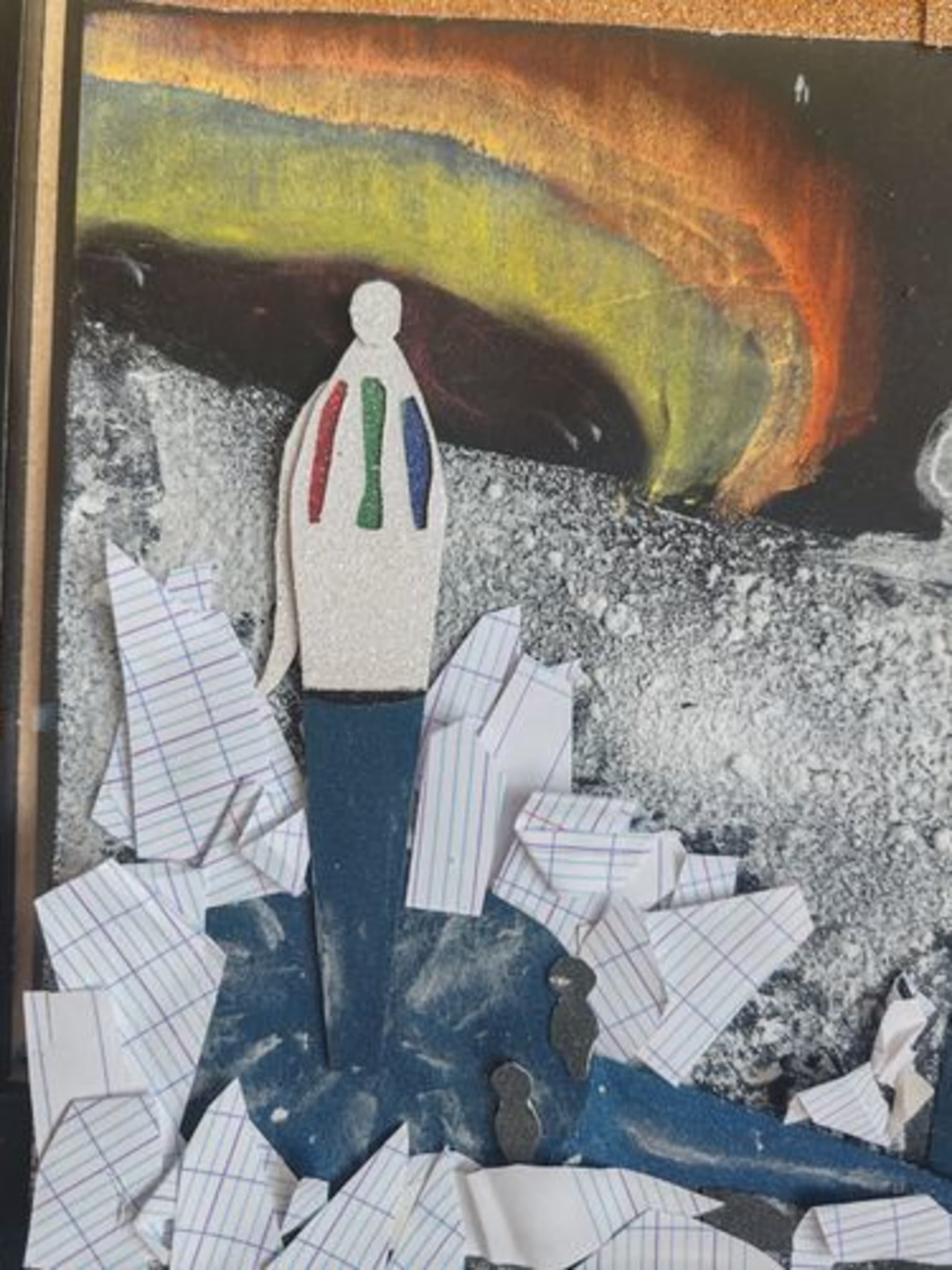 Œuvre à base de collage, pastel sèche ainsi que de l’imagination pour un rendu sujet à interprétation