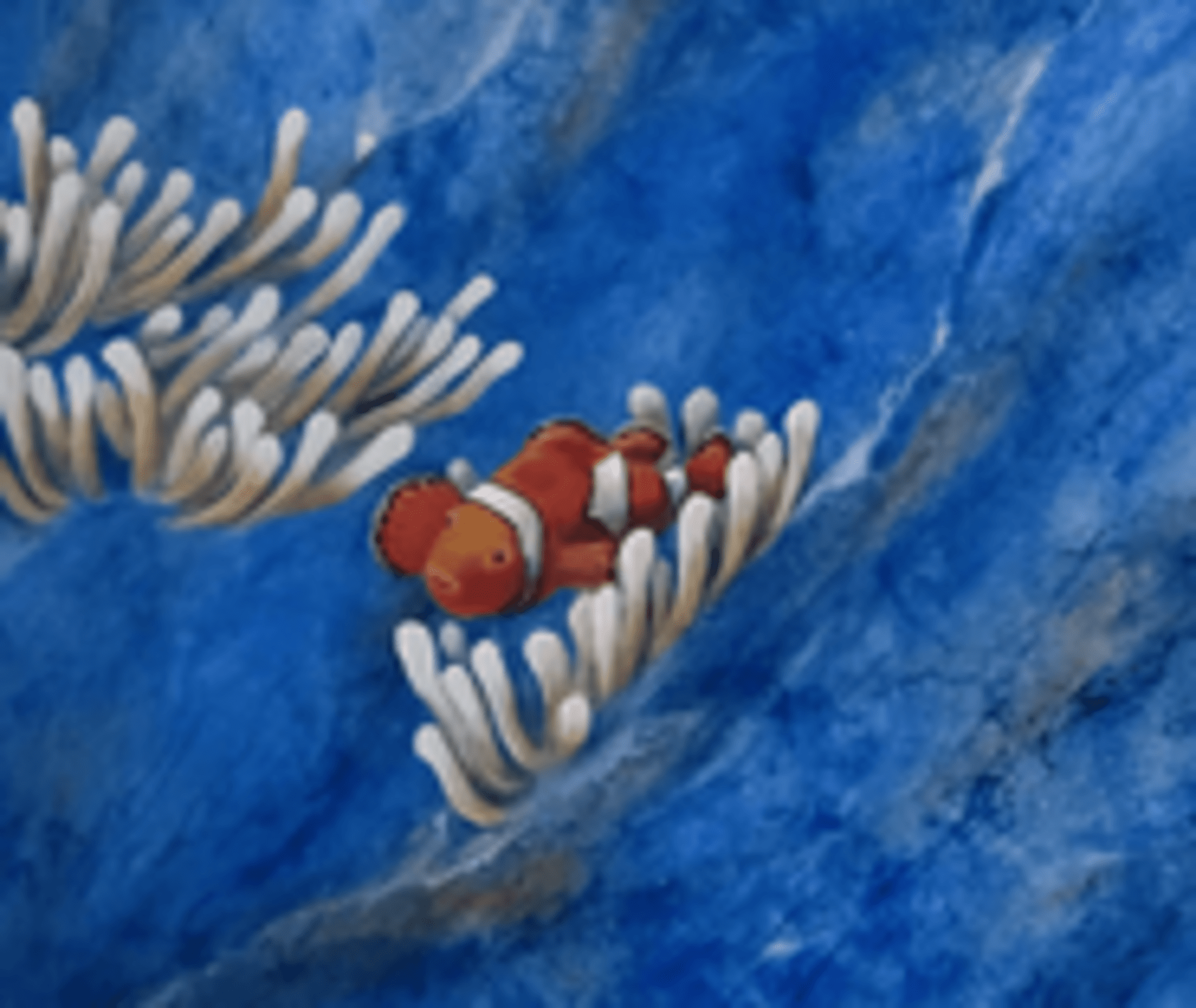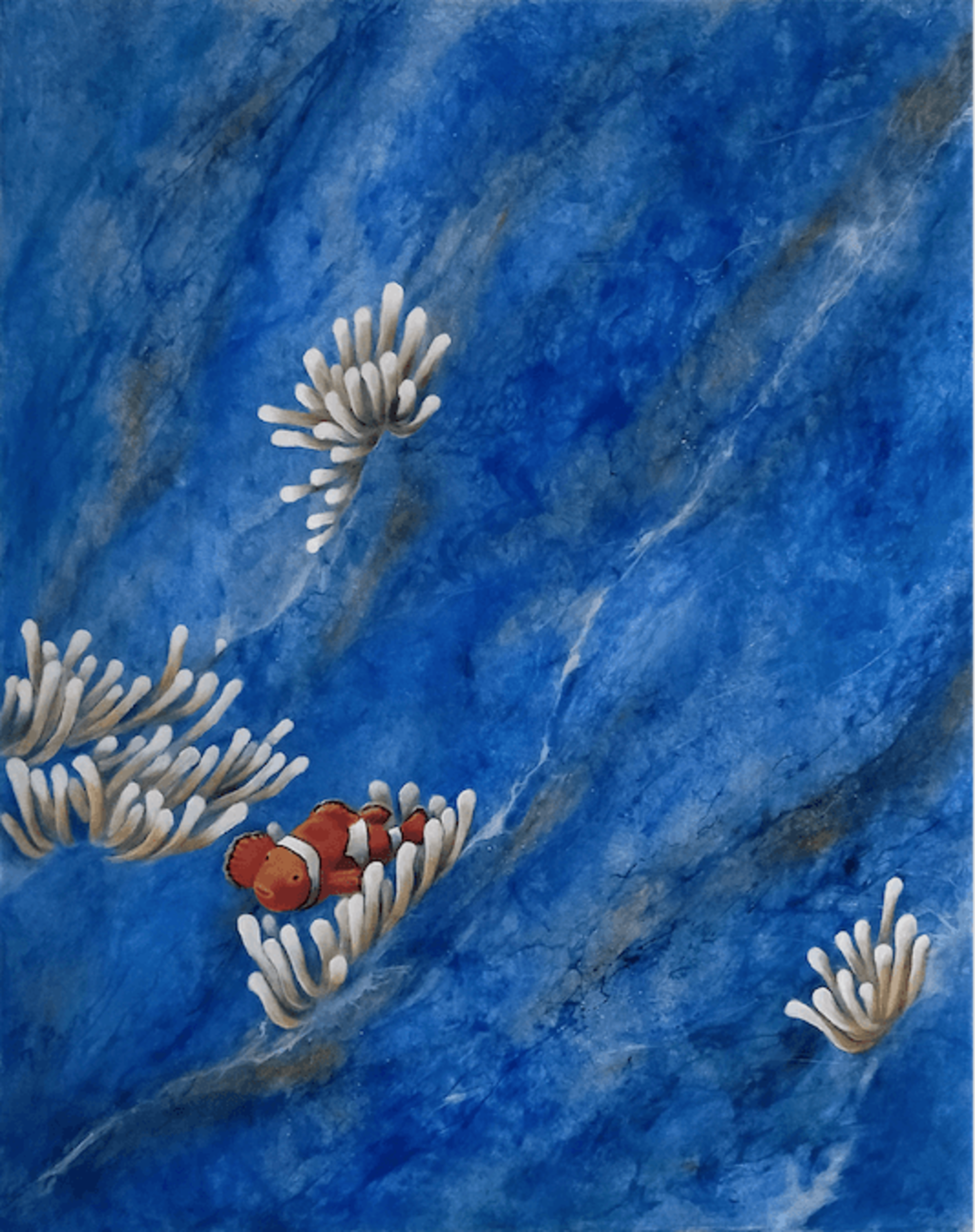 Le poisson clown nage dans les anémones dans une mer bleue de lapis lazuli. On ressent la profondeur de la pierre, et de la tendresse pour ce petit poisson dans son élément. La toile est présentée suspendue dans des portes affiches en bois aimantés. Vous pouvez la suspendre avec les portes affiches, la fixer sur un châssis pour un encadrement classique ou l’insérer dans un sous verre, à votre convenance.