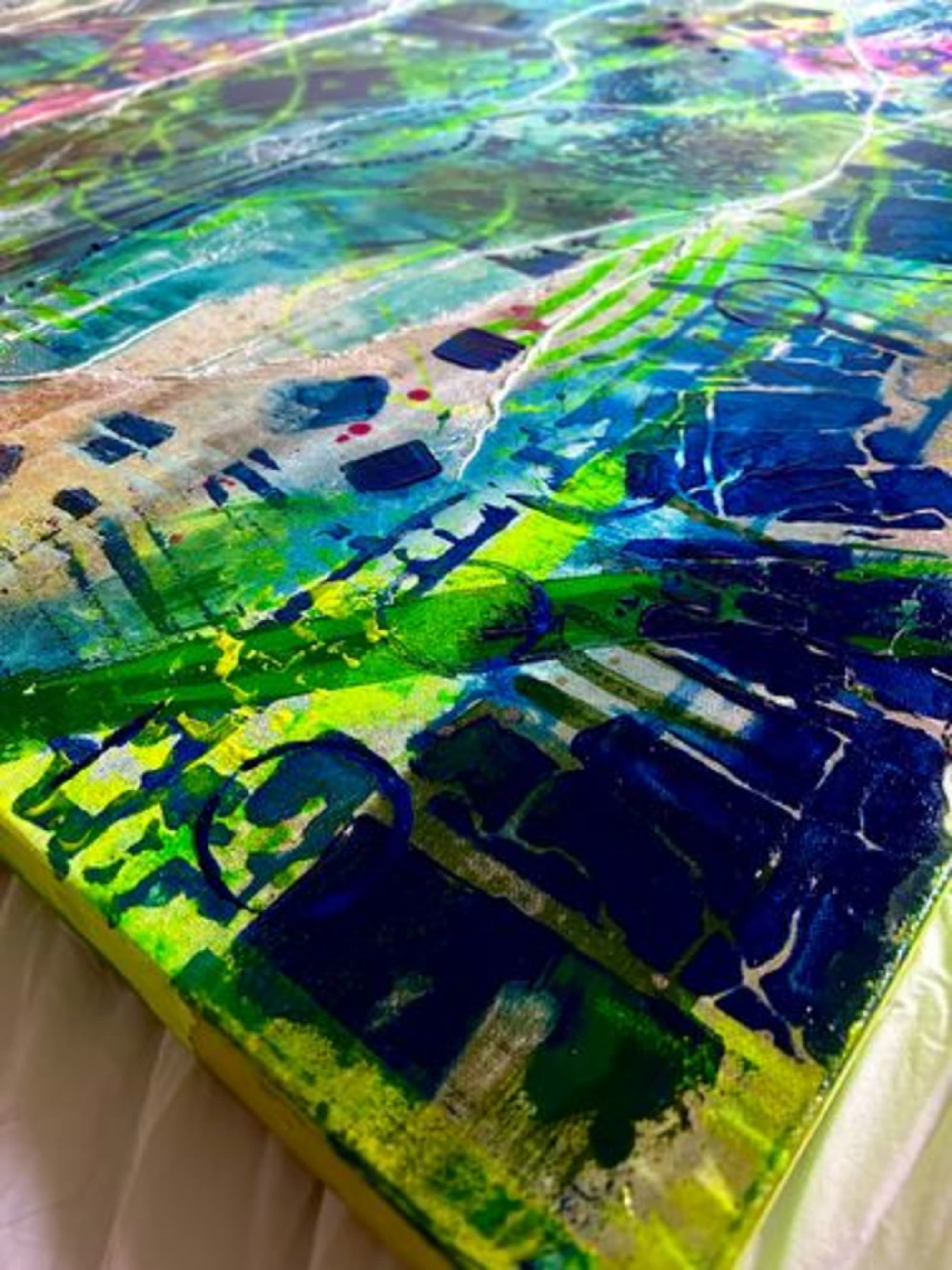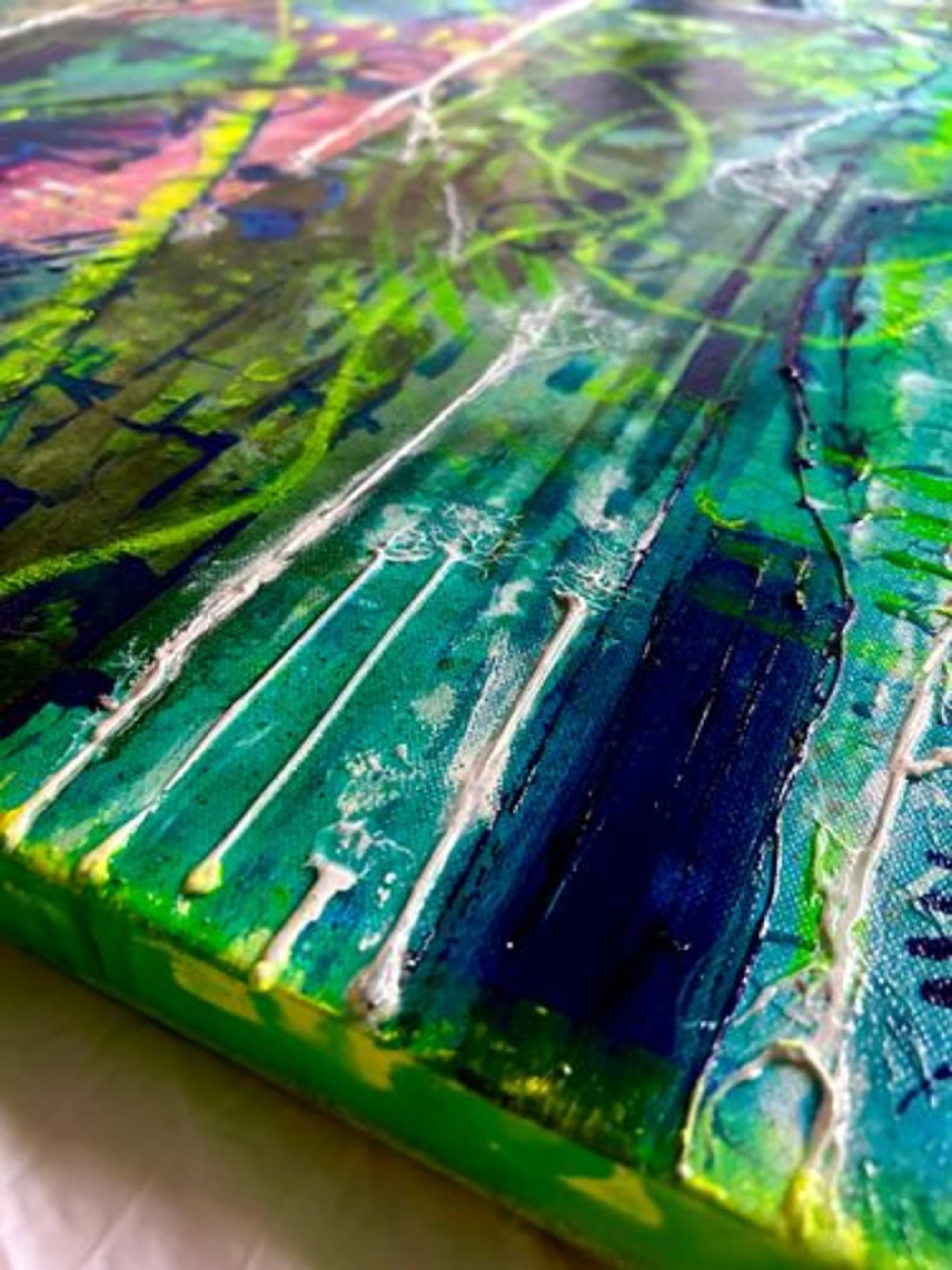 The “Réveille-Toi” collection transcends the boundaries between dream and reality. Each painting, suffused with a dreamlike aura, depicts our everyday world as if submerged in a dream. Yet, at the heart of each composition, a recurring message emerges like a beacon: “Wake Up.” It’s a powerful call to consciousness, an invitation to break free from blindness, and to behold our existence with newfound clarity.