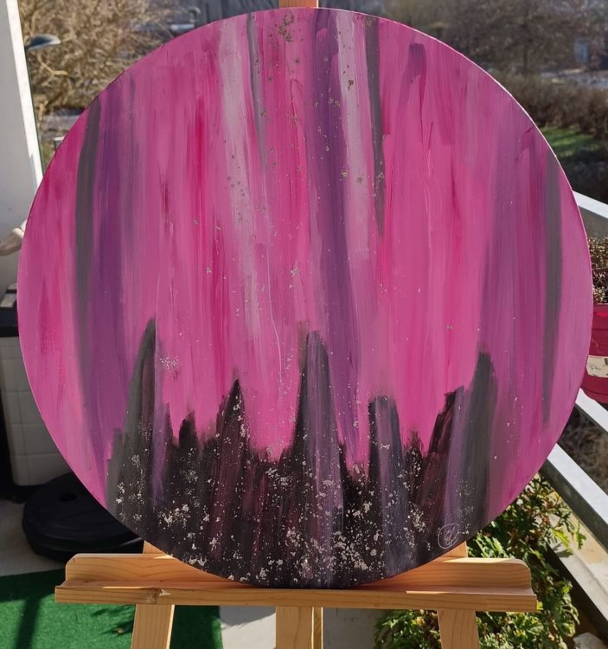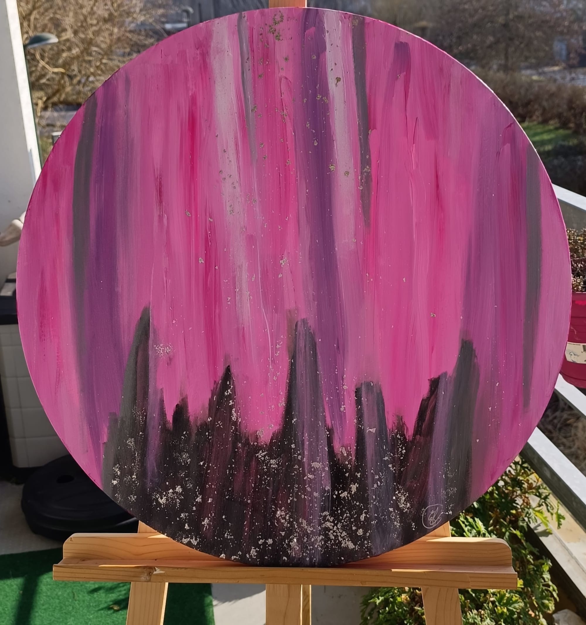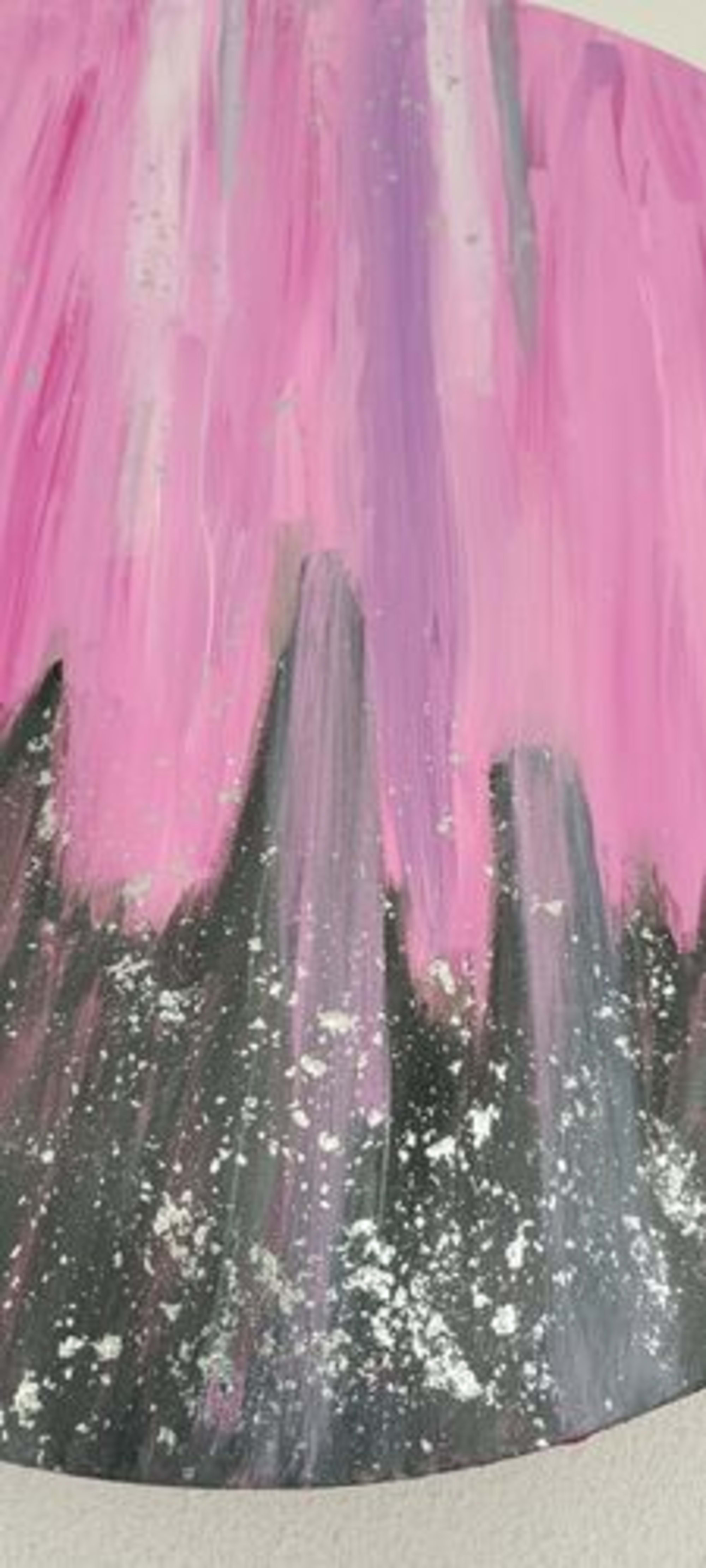 La partie basse sombre symbolise les moments difficiles, le rose le retour de la douceur et l’amour, le violet et le blanc les prises de conscience qui permettent d’avancer (le violet étant la couleur du chakra du 3e œil)