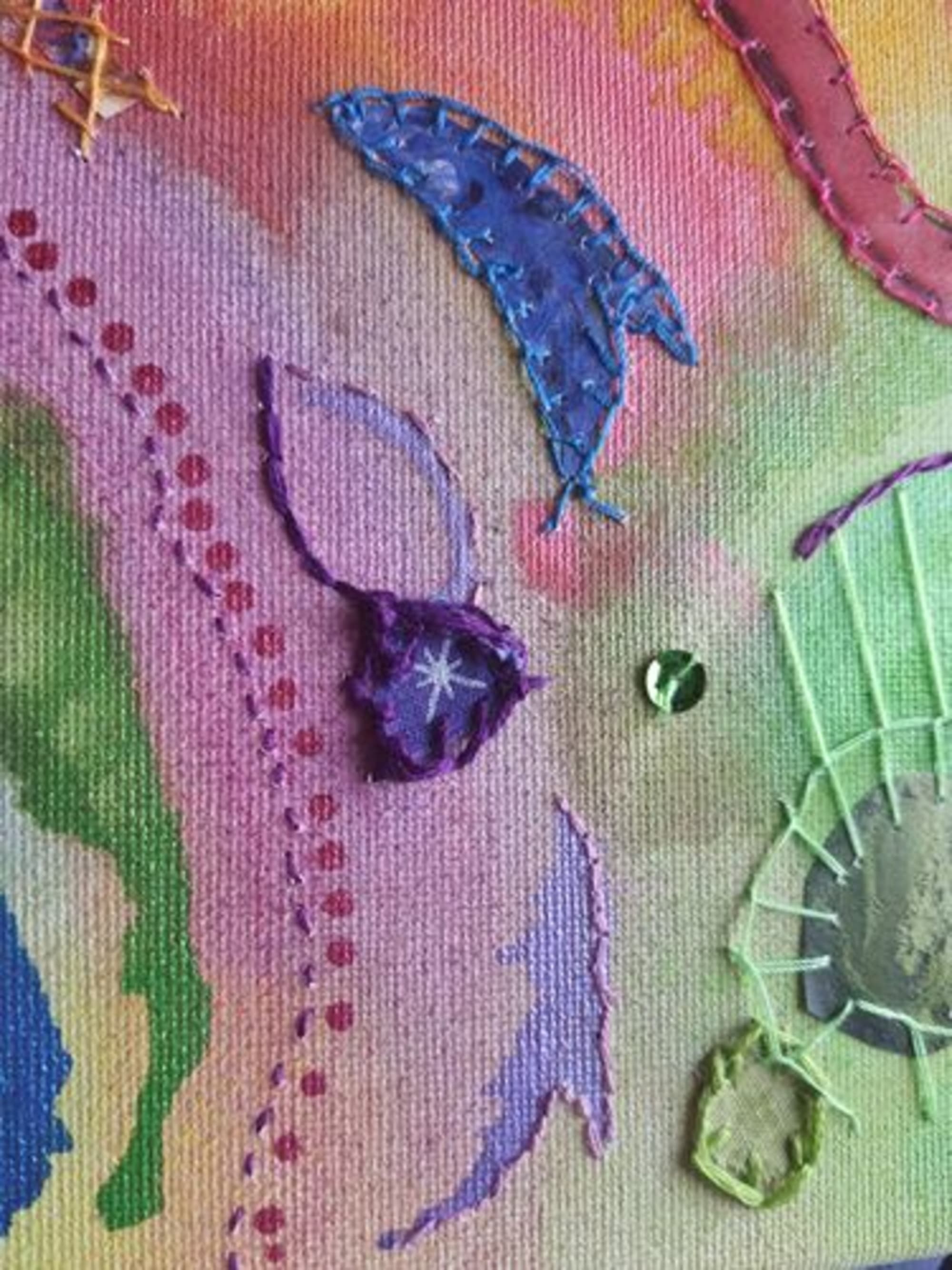 Pastels à l’écu Sennelier, tissus, papiers, encres, fils