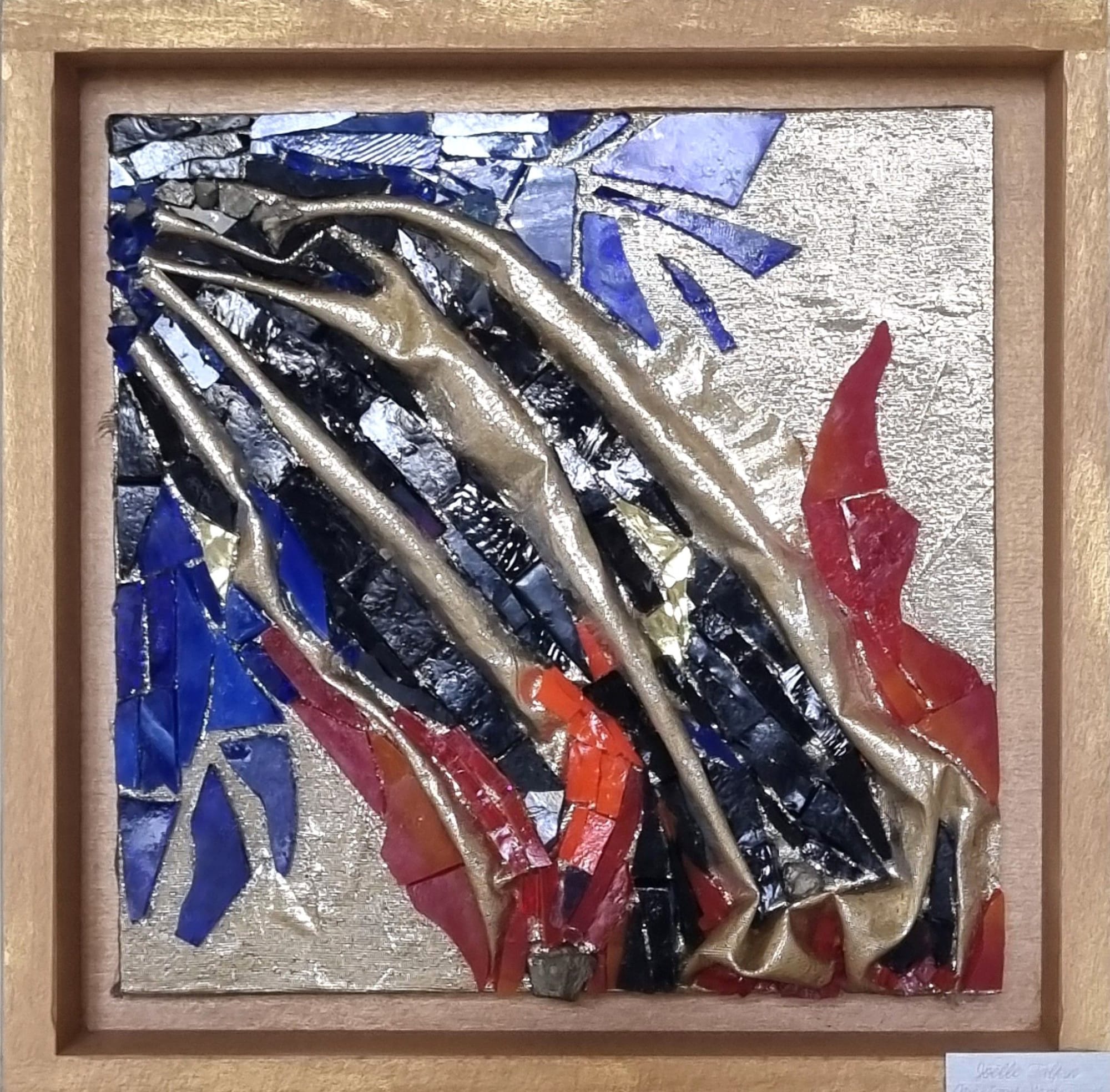 Une mosaïque innovante et singulière où l’or en fond se laisse apercevoir, comme des joints qui font les liens, créant un espace où les contraires se rencontrent, s’attirent et se repoussent.