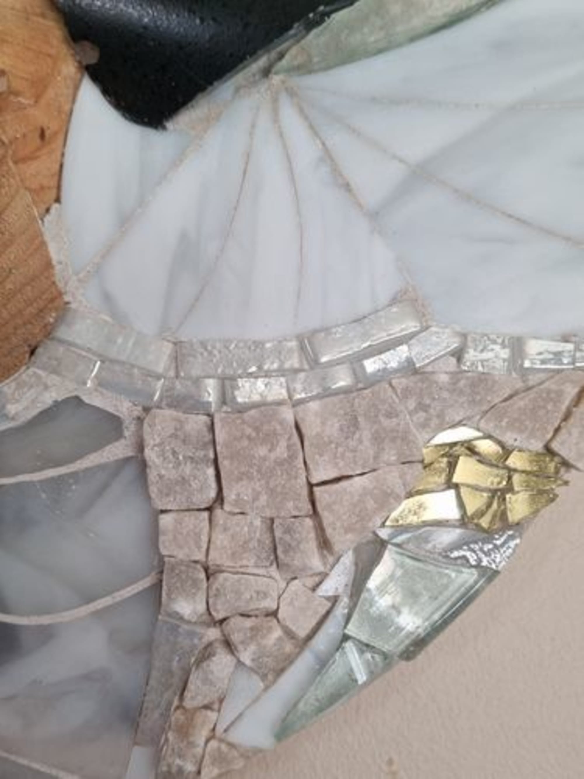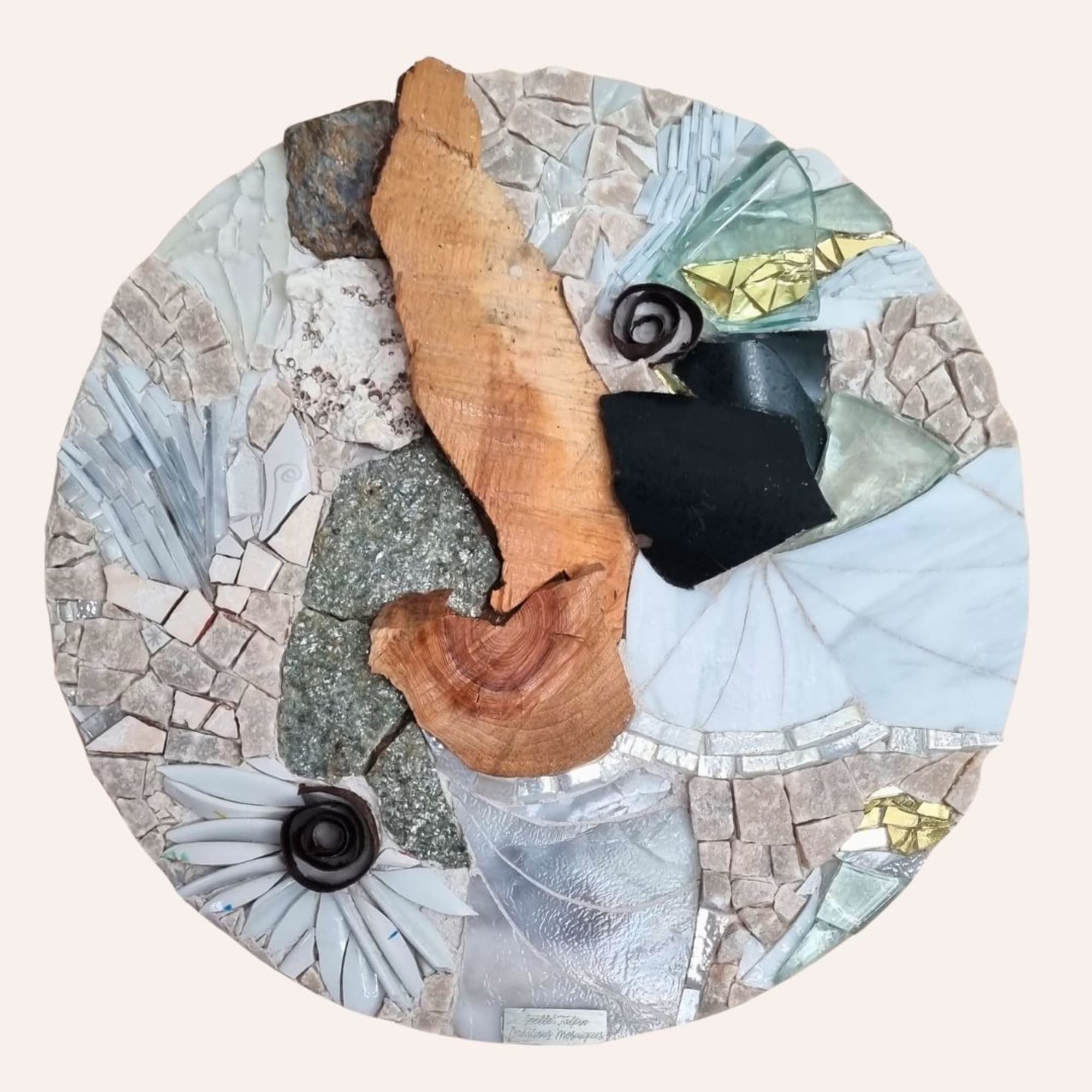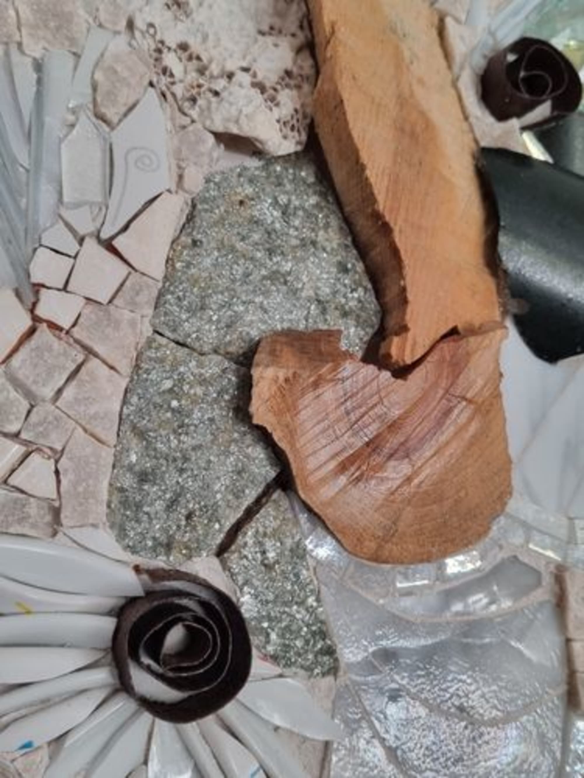 Tranche de bois naturelle, Verre, pâte de verre, pierres de montagne naturelles, marbre, faïence, pièces de céramique, coquillage naturel.