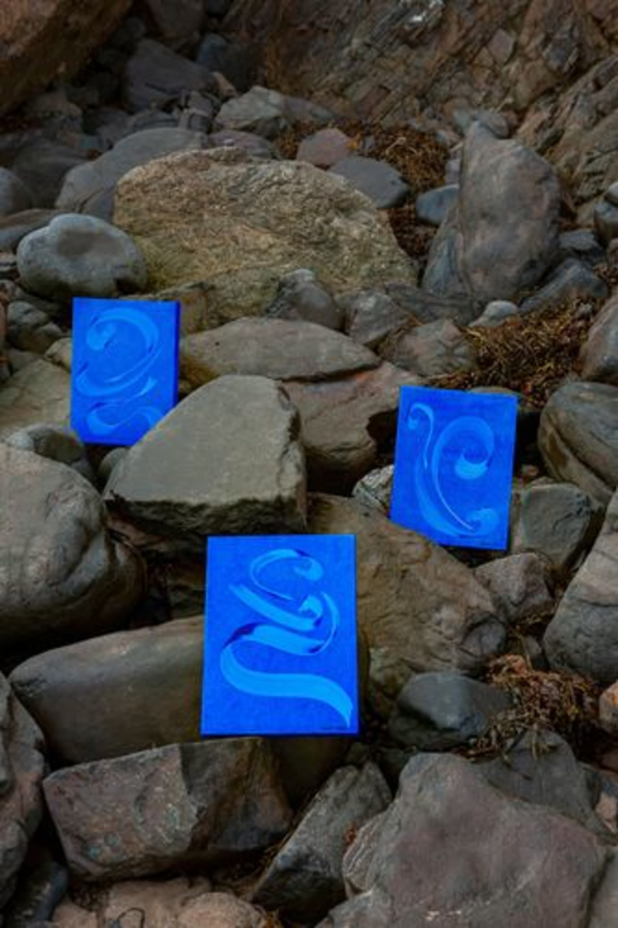 “Les traces du pinceau, dans le silence bleu soufflent leurs mots.”