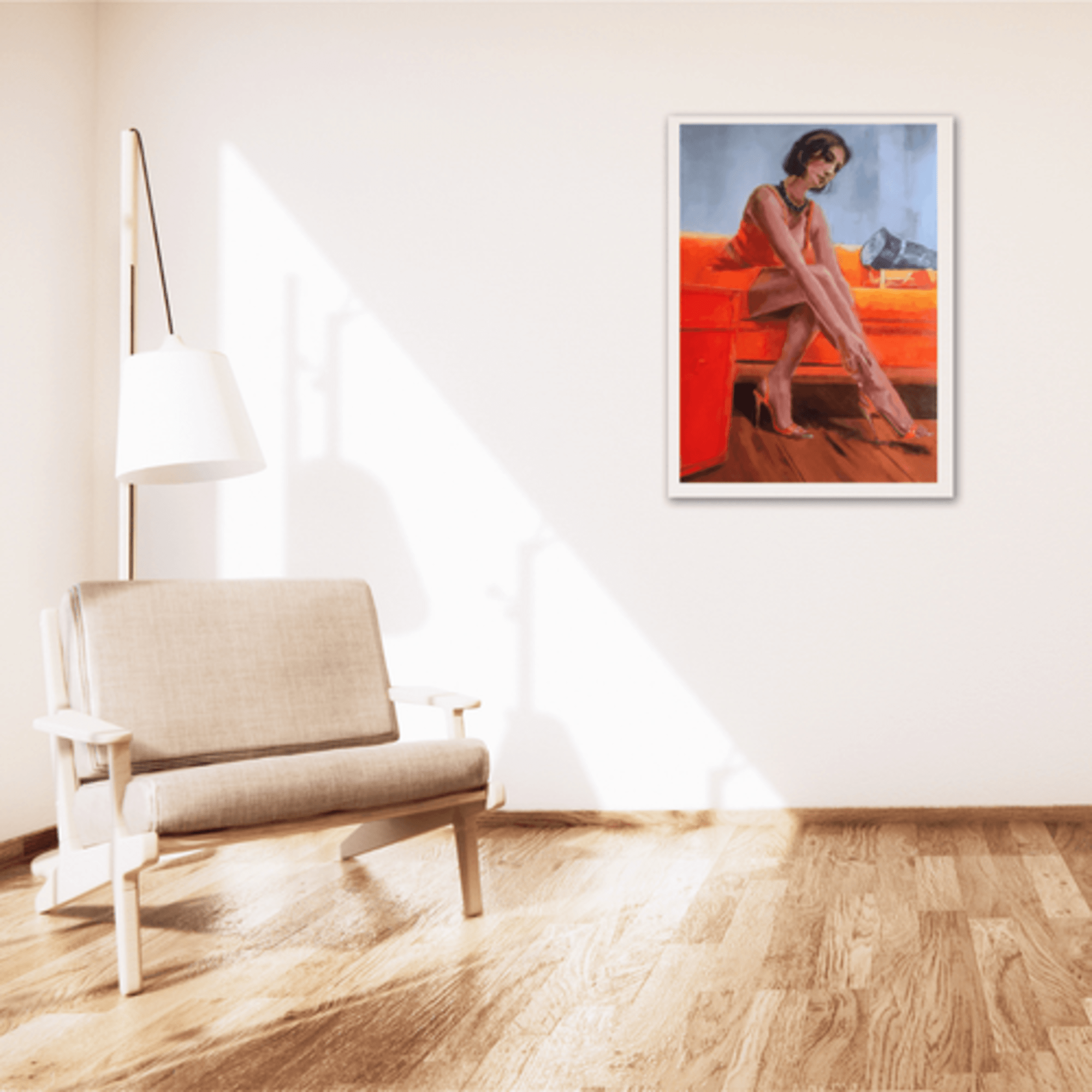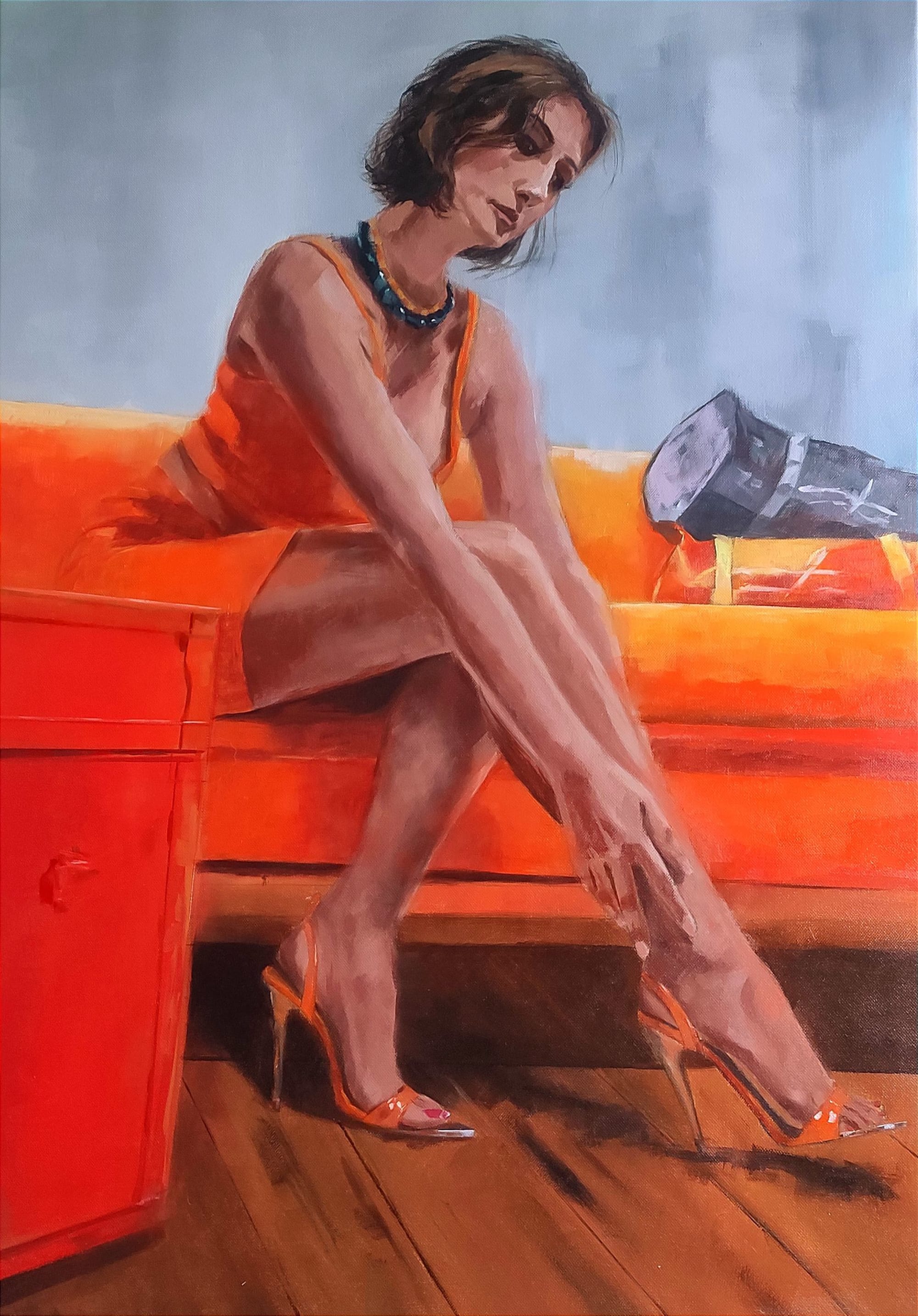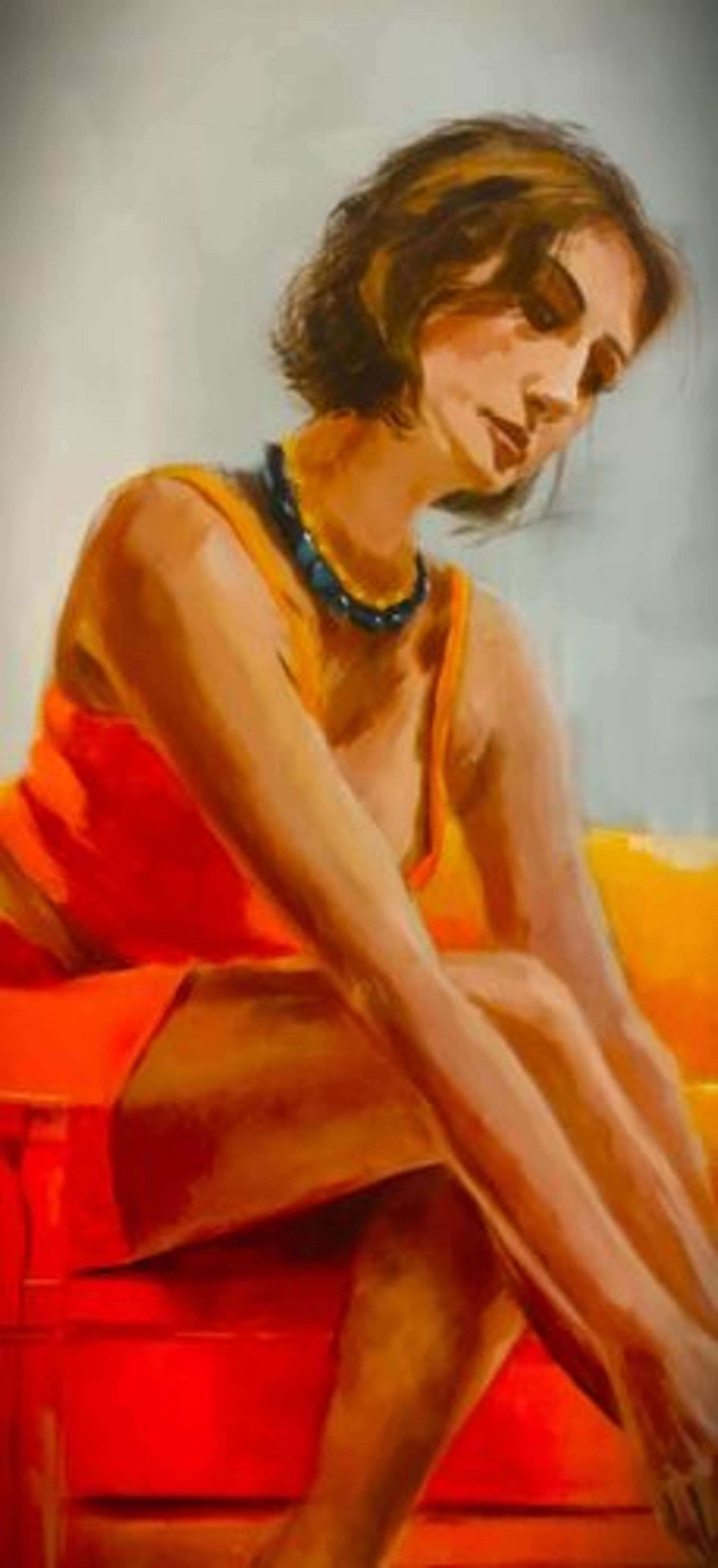 L’éclat des rouges orangés accentue la féminité et la belle attitude de ce personnage