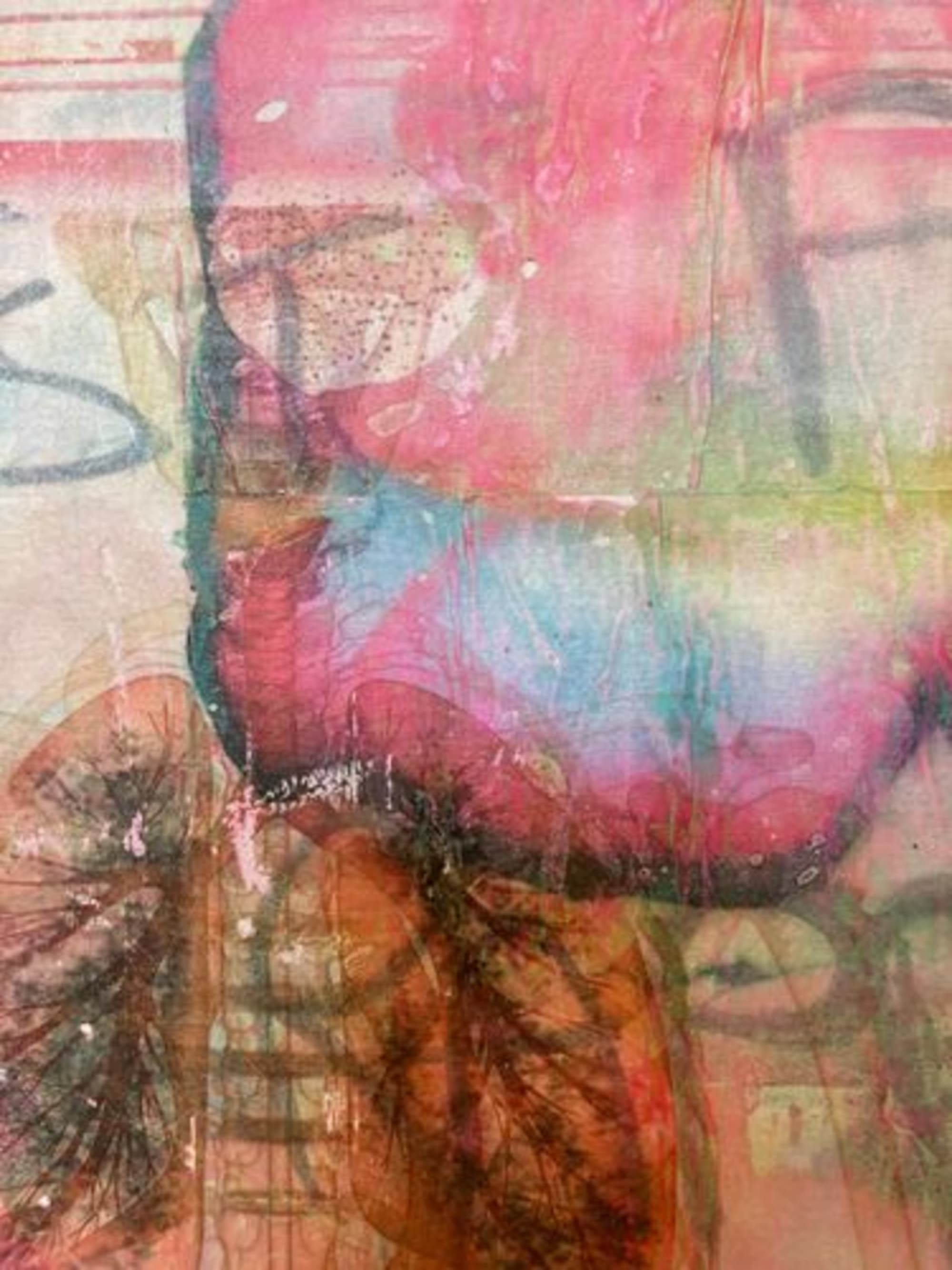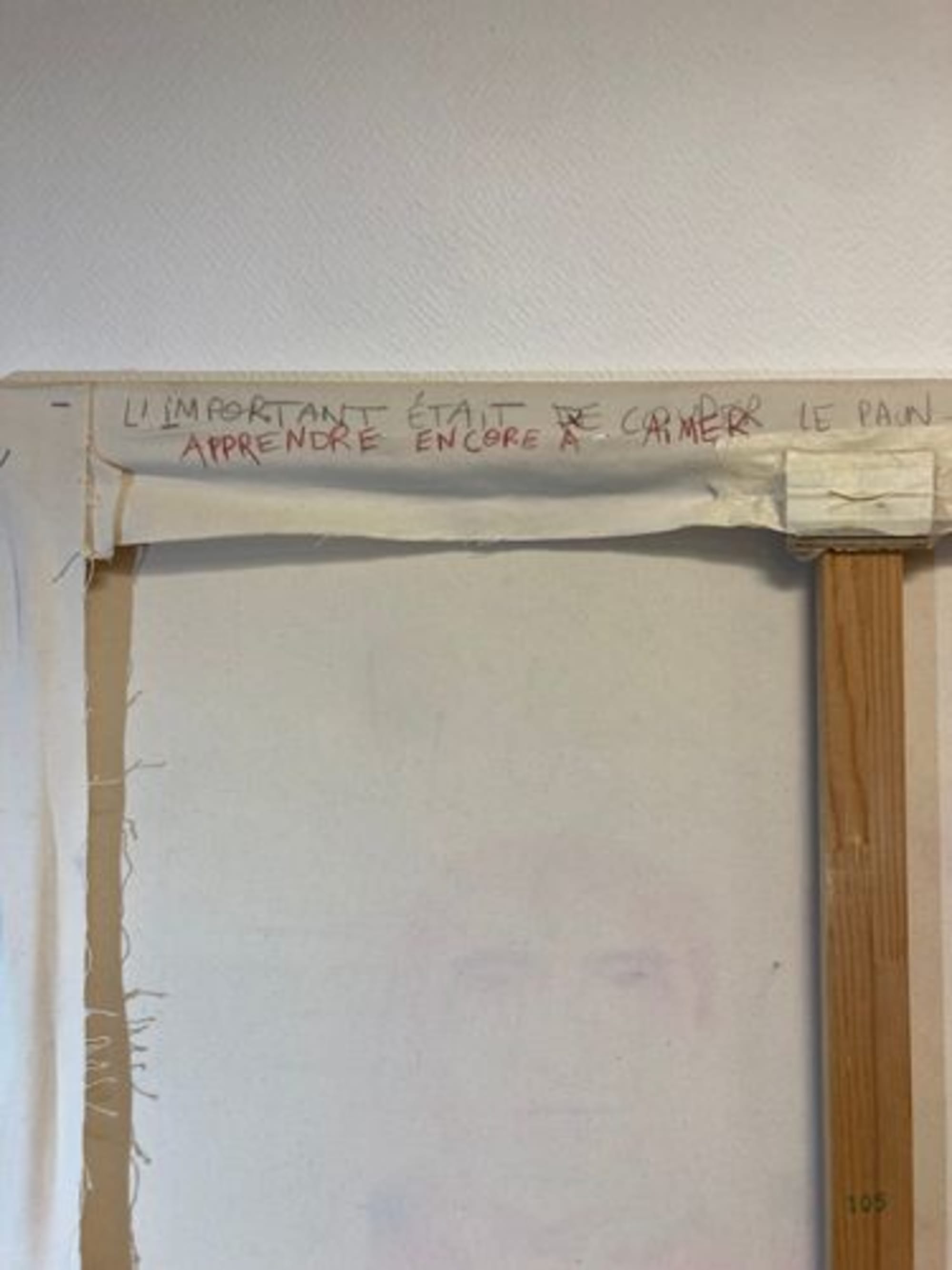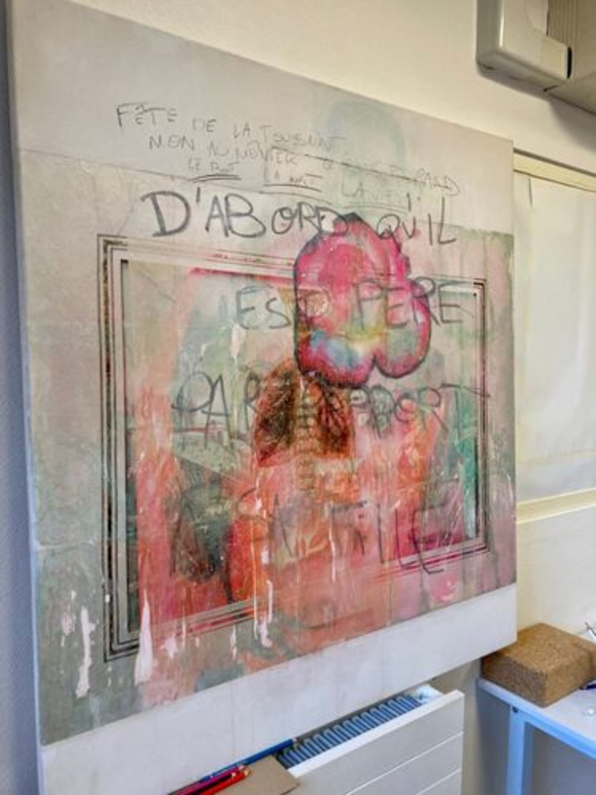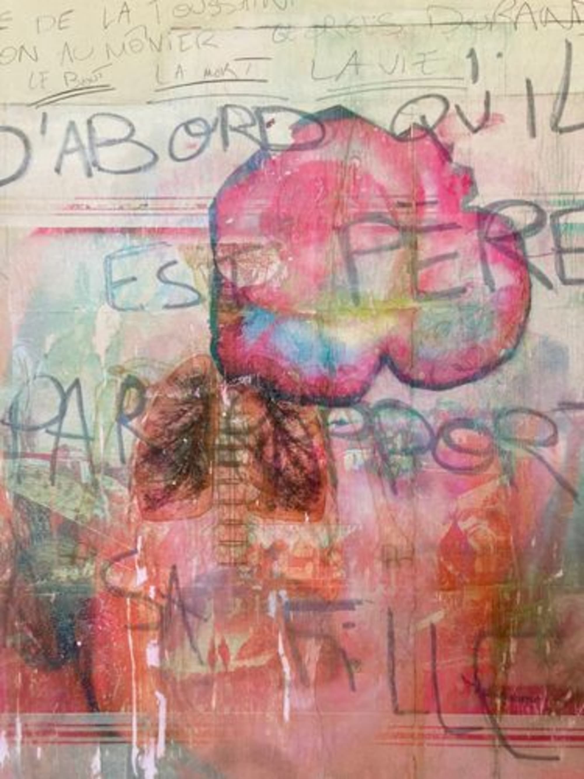 « Apprendre encore à aimer » est un mix entre une ancienne peinture « L’important était de couper le pain droit » dans laquelle viennent se noyer des nouveaux éléments : Un grand portrait entrelacé avec une gravure du XIXème siècle, des poumons malades et une rose. Des visages, ainsi que le texte initial « D’abord qu’il est père par rapport à sa fille » réapparaissent en transparence. Notre humanité va-t-elle retrouver son souffle de vie, se reconnecter au cœur ?