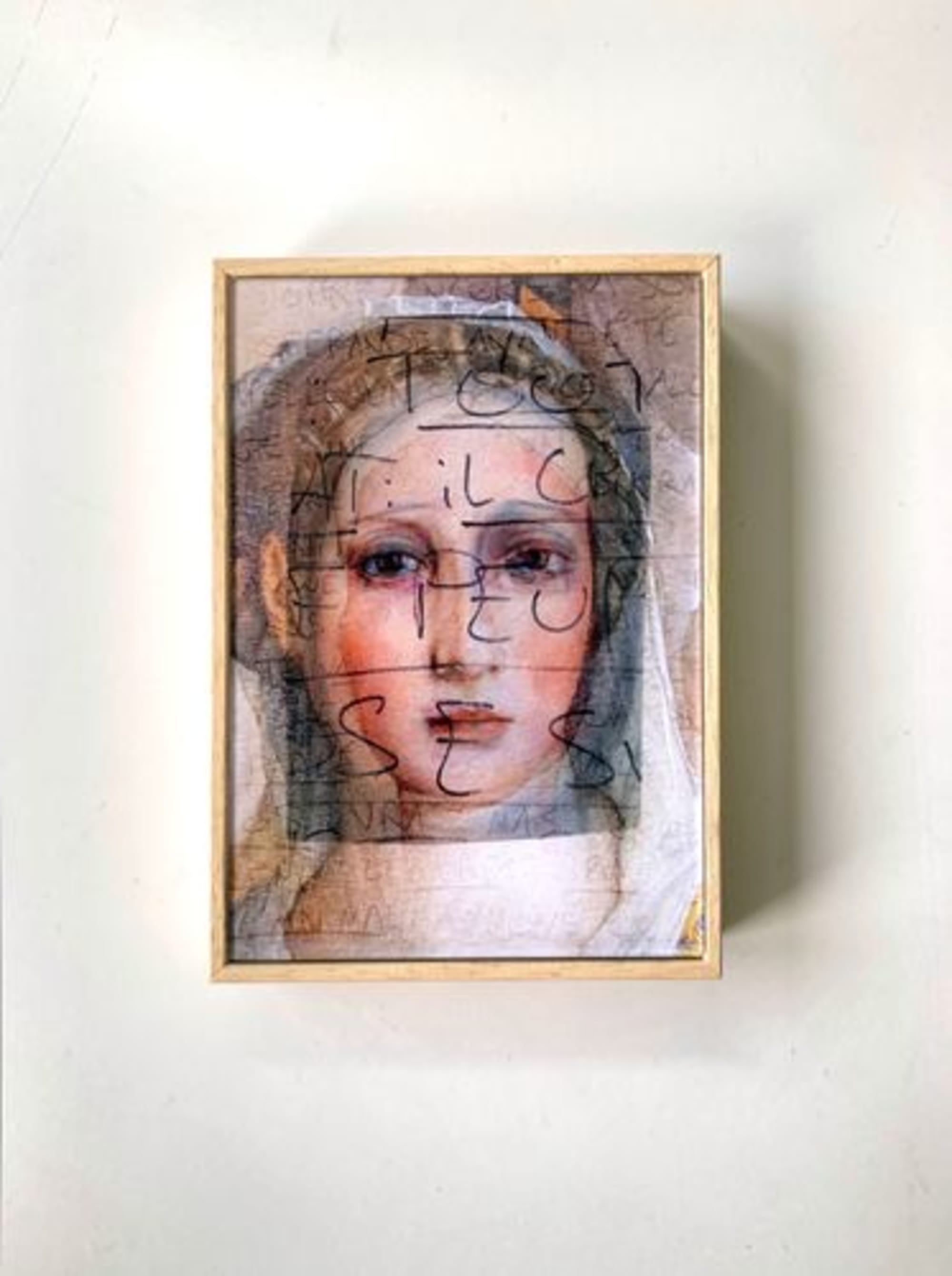 Cette impression sur alu dibond est un mix entre l’un de mes poèmes écrit au marqueur, une étude pour « Les Corps Glorieux » et un portrait réalisé par Il Bronzino, peintre de la Renaissance italienne du XVIème siècle.