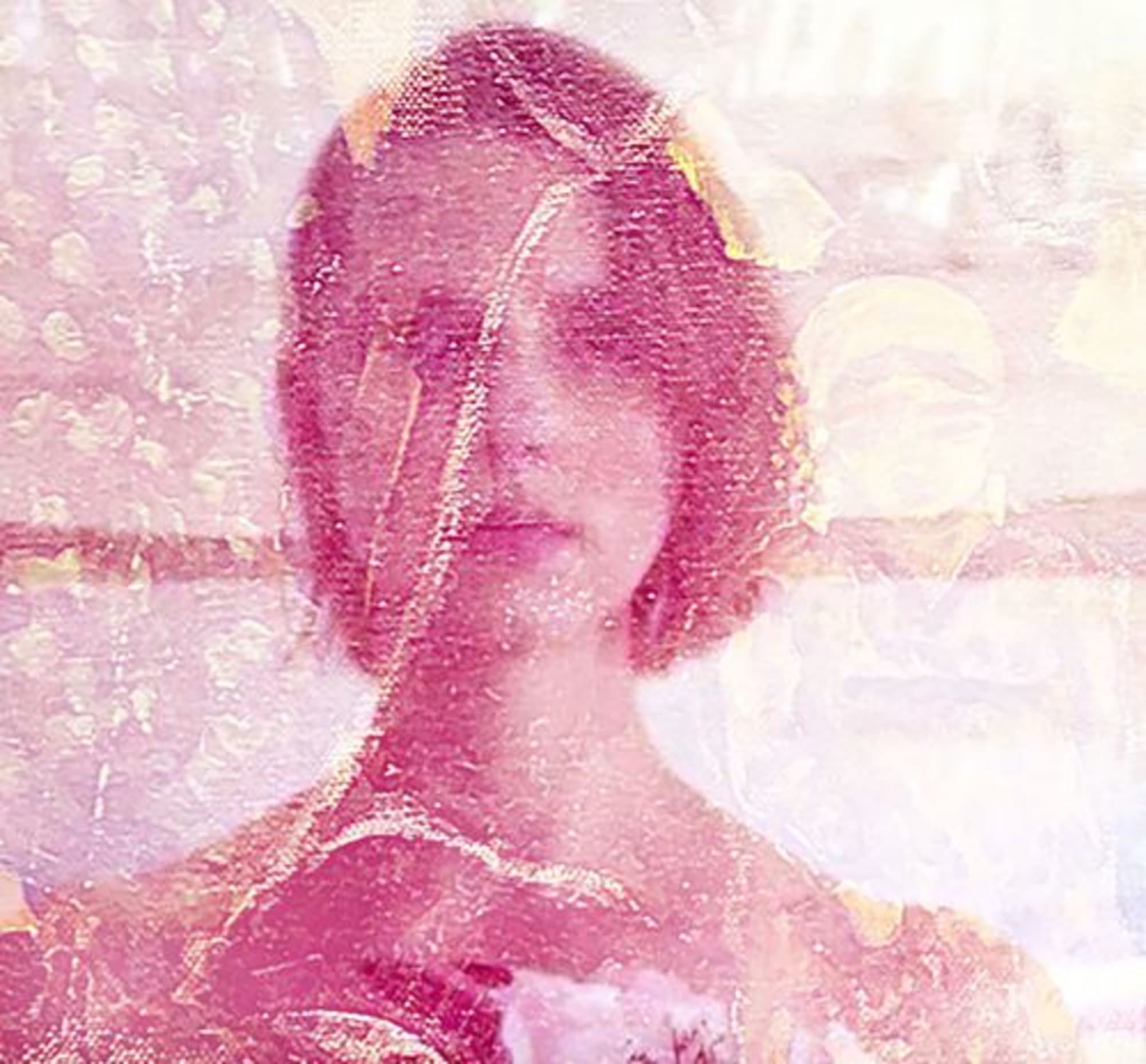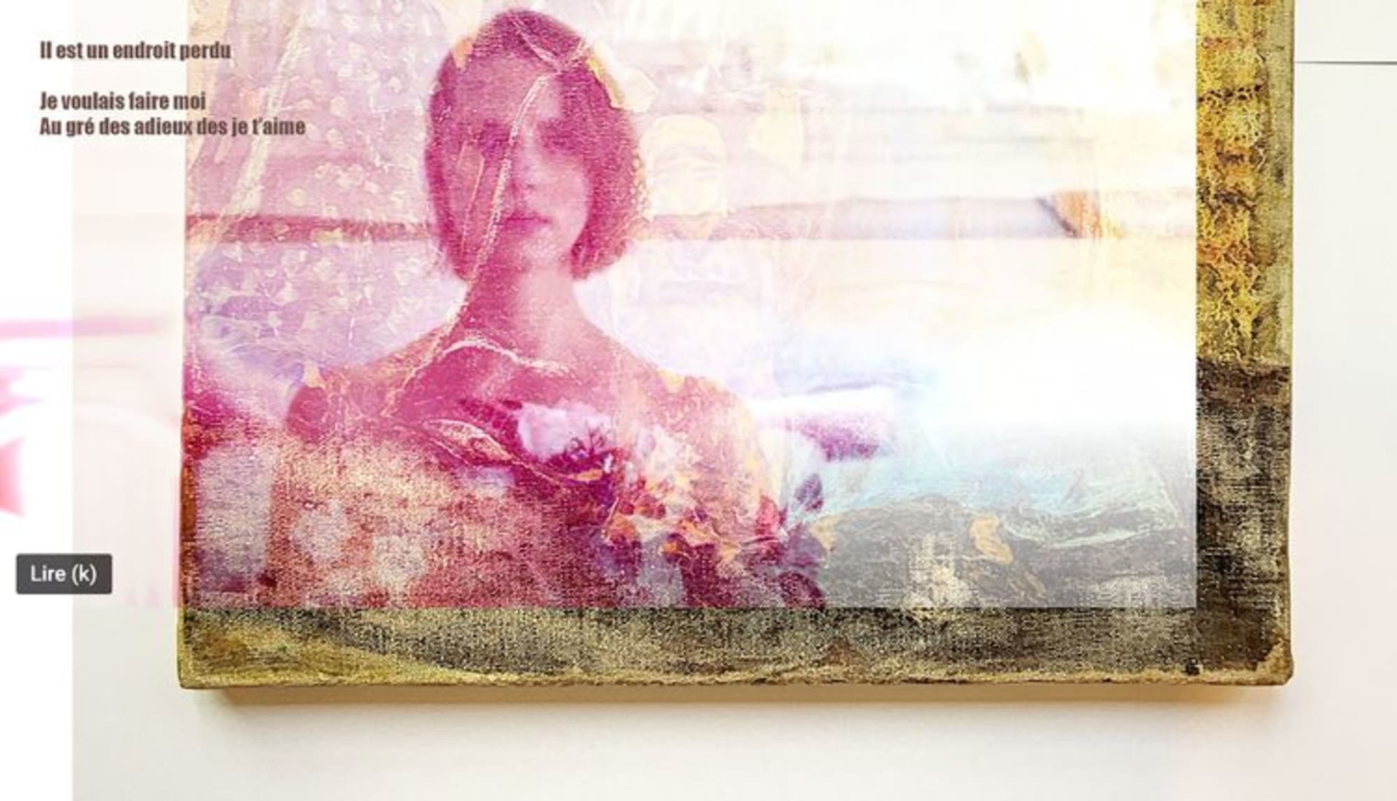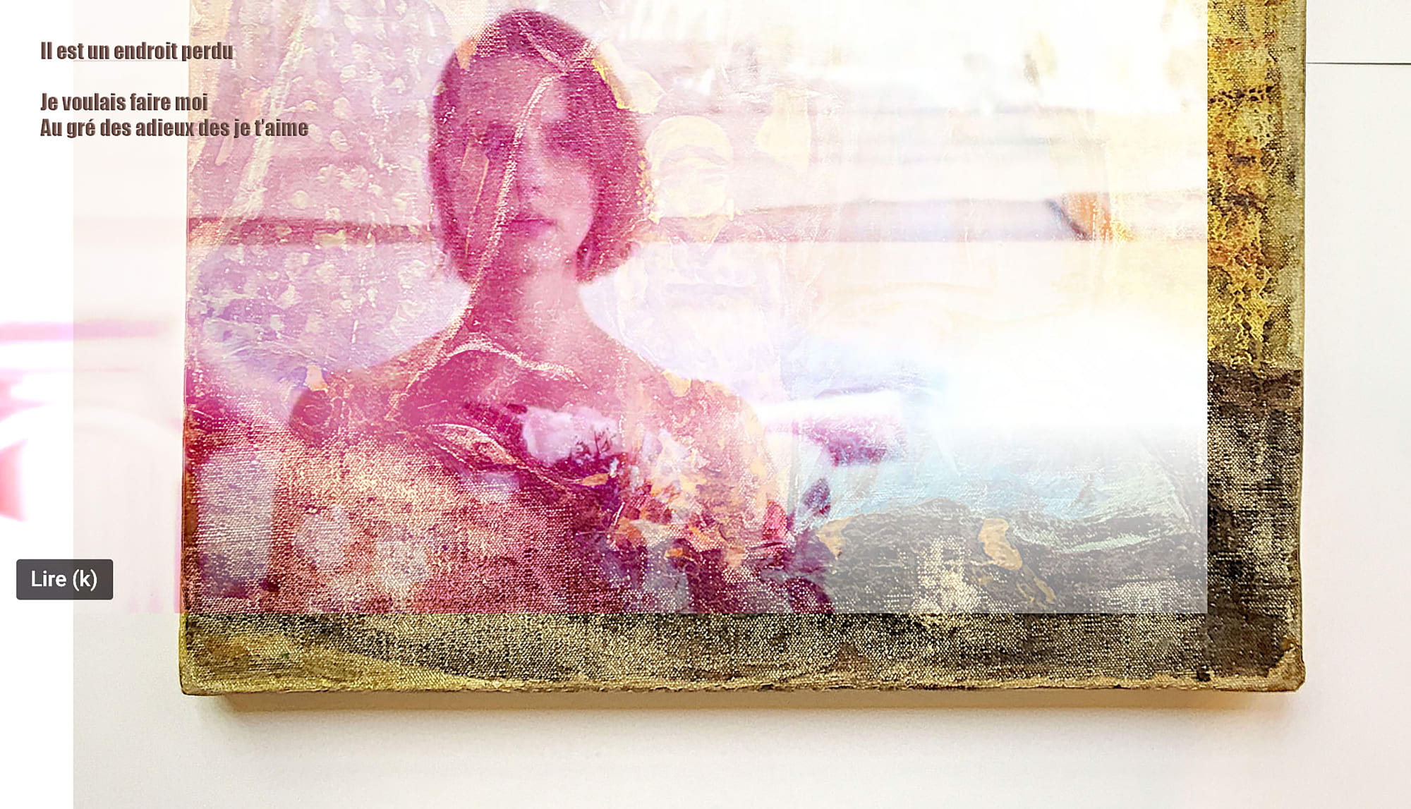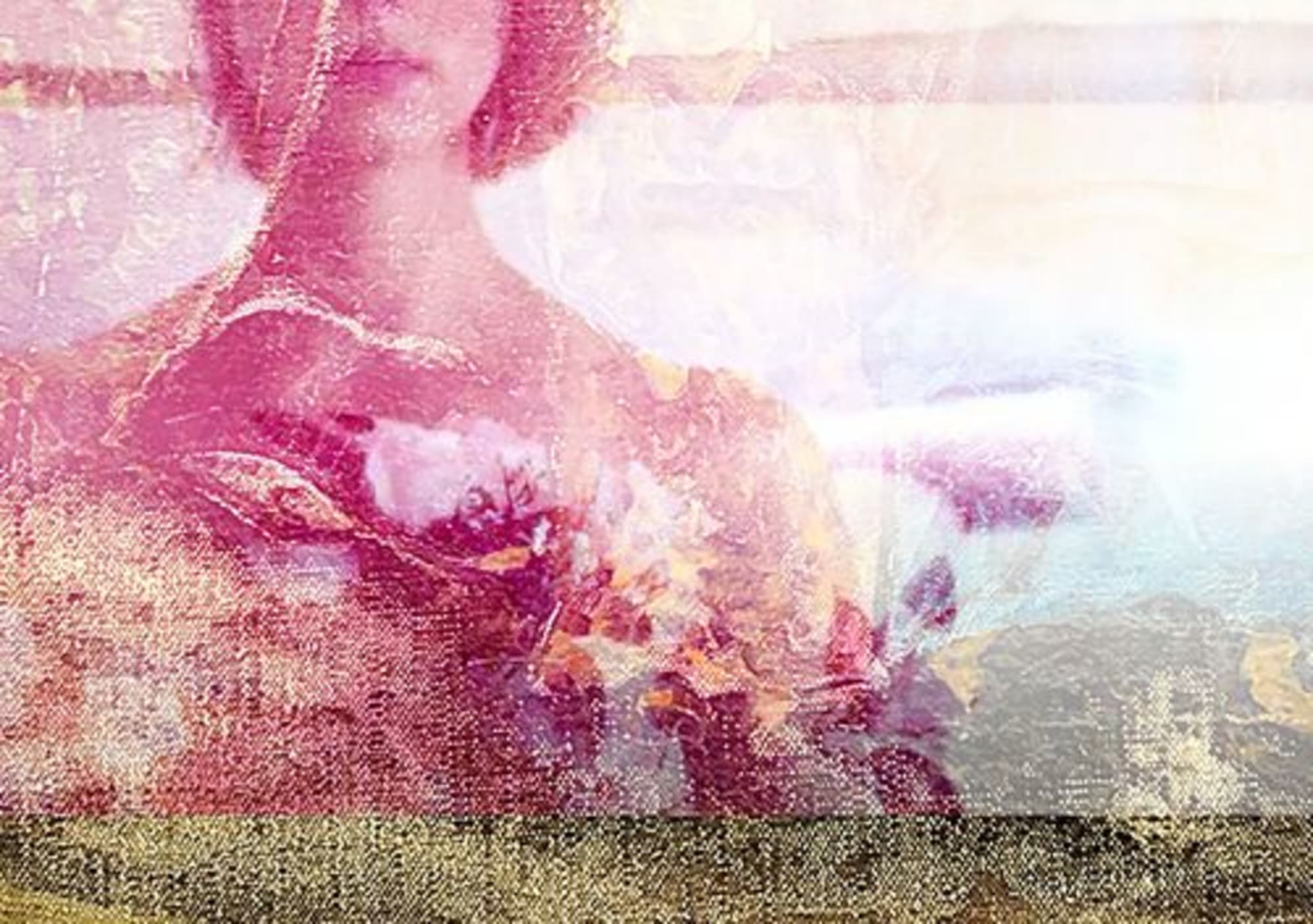 Cette impression est un mix entre un portrait de l’artiste extrait de la vidéo « Par les femmes », fruit d’une collaboration Frédéric Vignale tournée dans l’ancien appart-atelier d’Éva Bergera en région Parisienne, et une peinture trouvée aux puces de St-Ouen qui lui avait tapé dans l’œil. On peut y lire un court poème. Celui-ci révèle la recherche incessante de l’artiste pour son « Jardin d’Éden », l’endroit où « ce sera EX-TRA-OR-DI-NAIRE, jusqu’au bout » et de l’amour inconditionnel.