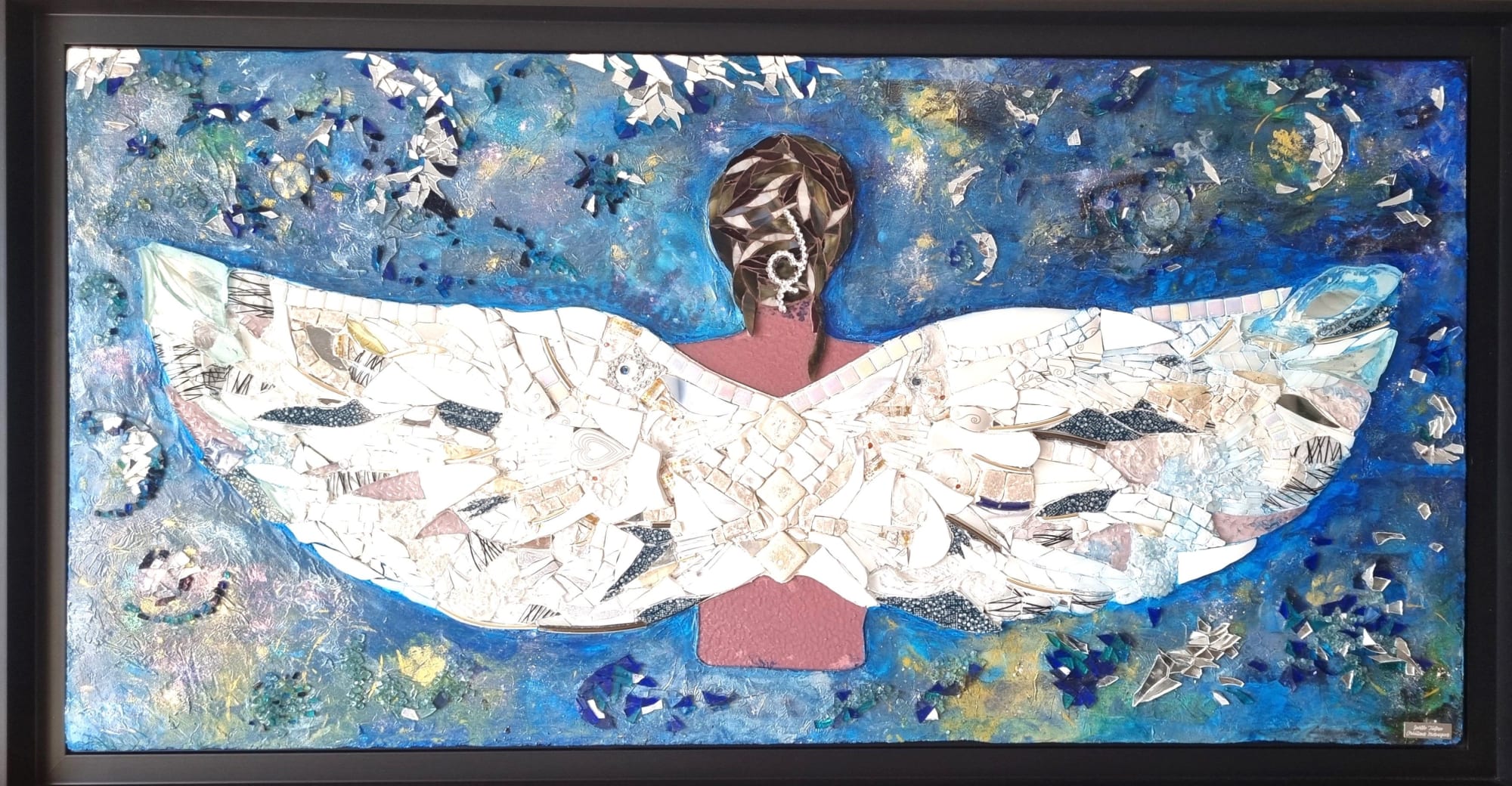 Le fond est réalisé en peinture acrylique, avec des pigments de nacres, et rehaussé de miroir et de verre qui forment comme des galaxies autour d’ Elle.