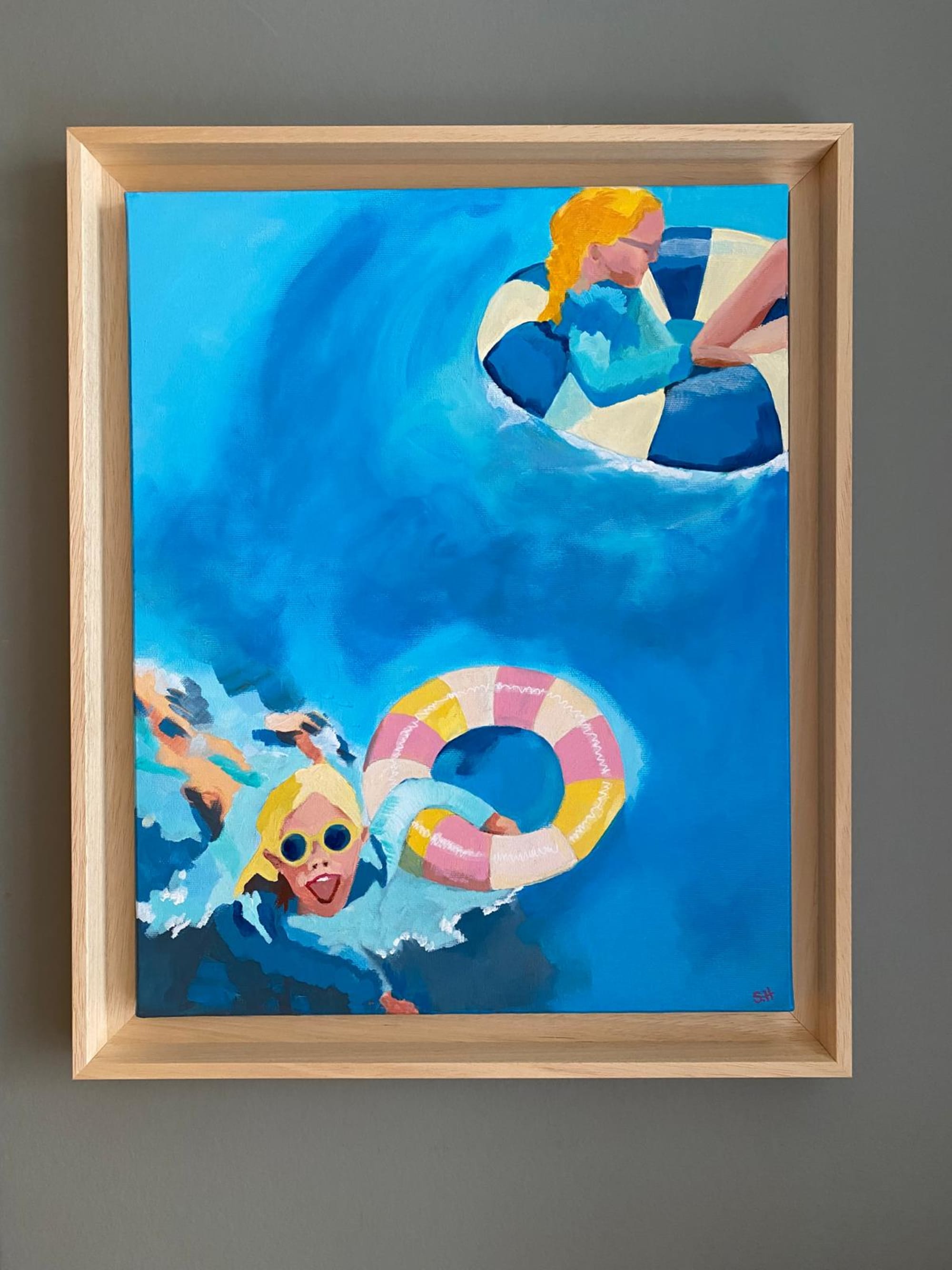 Deux enfants jouent dans une piscine, chacune avec sa bouée, mais on ne voit pas la totalité de la scène; le personnage en haut à gauche dévie lentement jusqu’au hors cadre; l’action se situe plutôt en avant plan avec les battements des jambes et mouvements des bras.