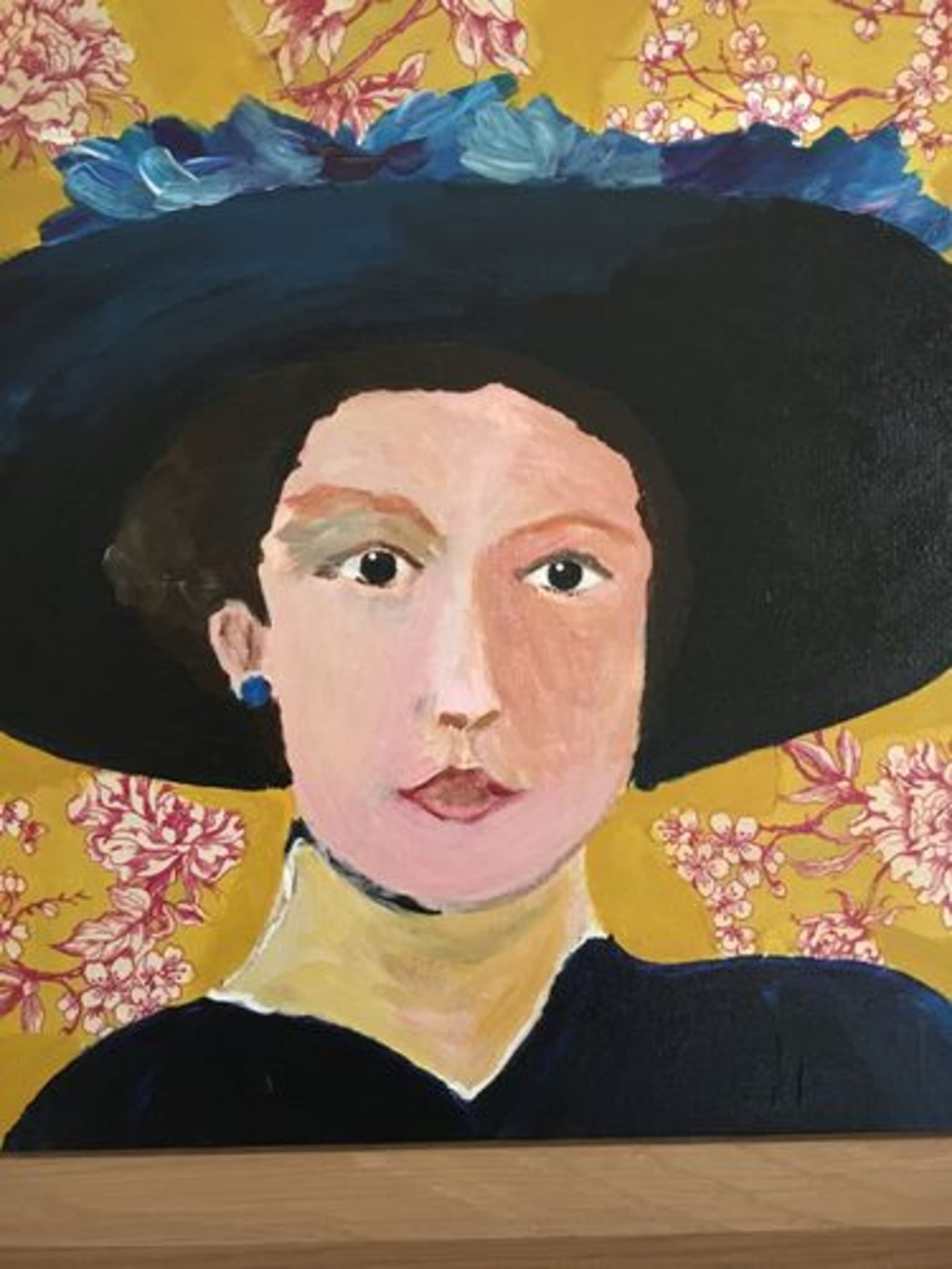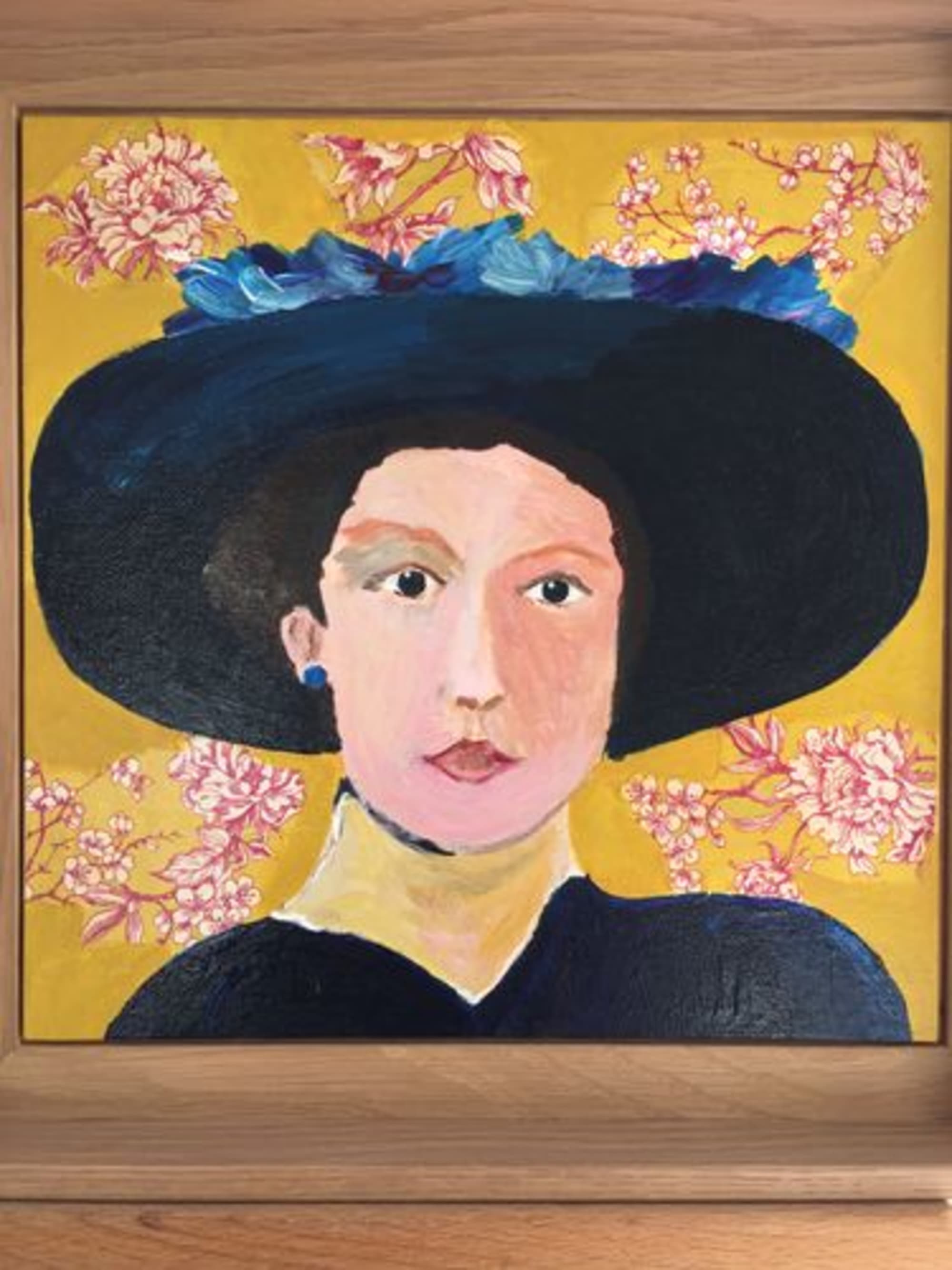Ce tableau est inspiré d’un tableau de Joaquim Sorolla que j’ai réinterprété. Après avoir peint la jeune femme, j’ai détouré et découpé son portrait et l’ai placé sur un fond de papiers collés. Il y a un contraste entre les différents bleus de la toilette de la femme et le fond jaune ocre peint sur lequel j’ai découpé et collé les fleurs. L’expression est un peu austère mais elle est adoucie par la couleur et les motifs.