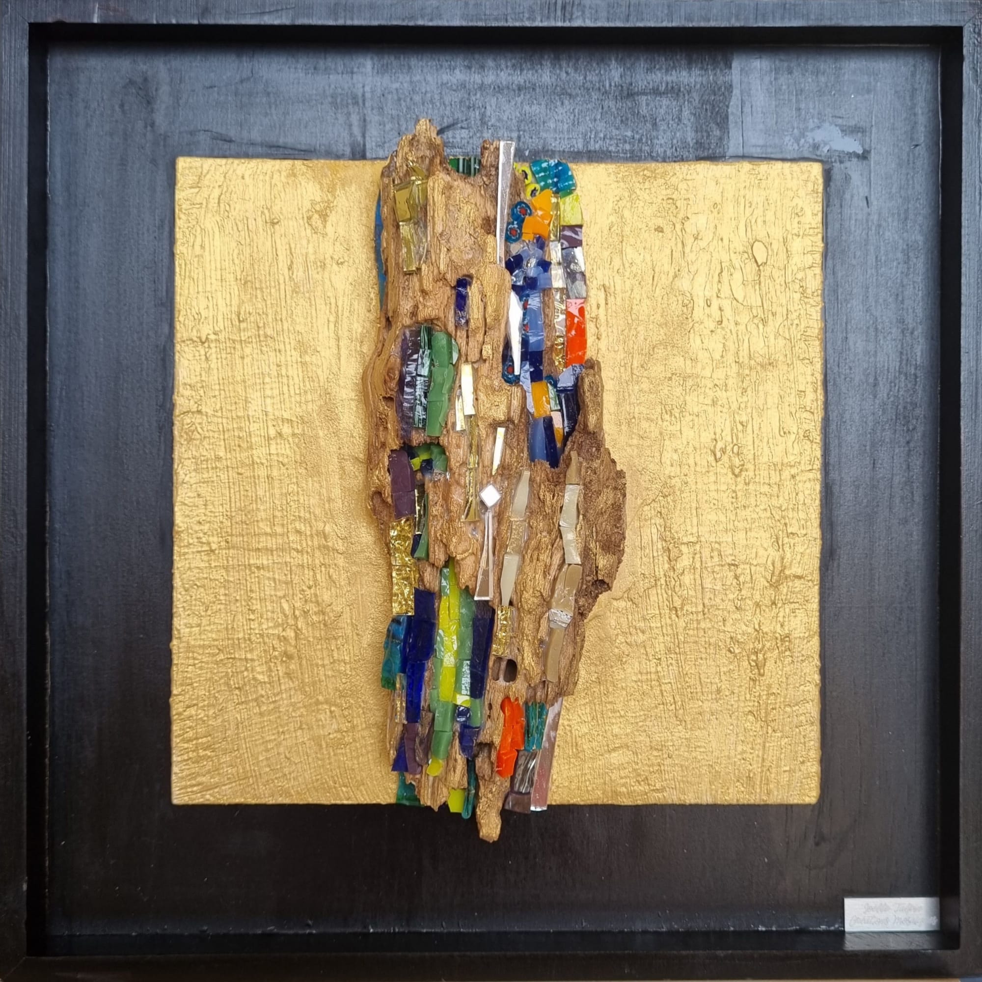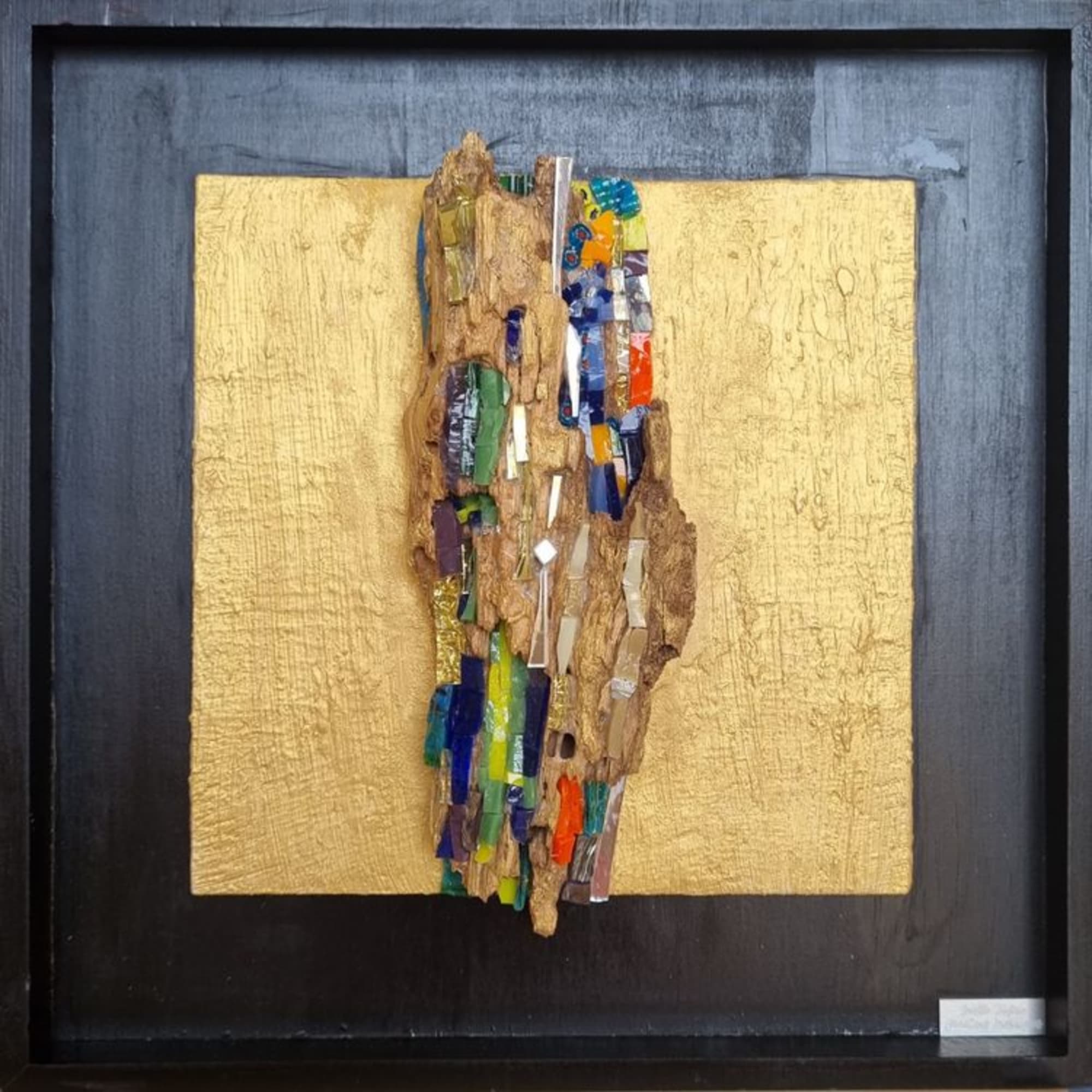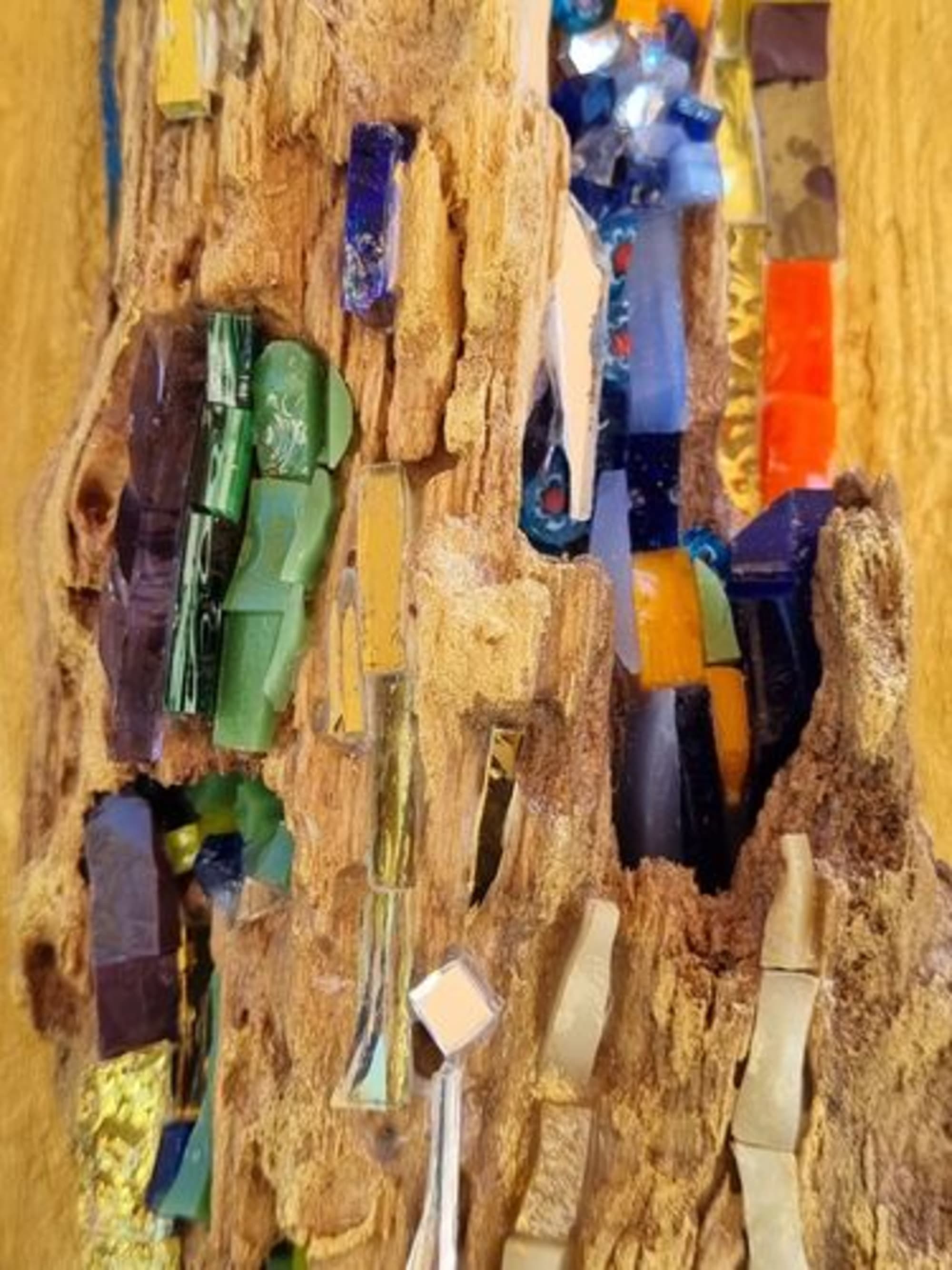 Matières utilisées: Ecorce naturelle de Chêne Liège, différents verres colorés artisanaux, verre paré de feuille d’or, miroir.