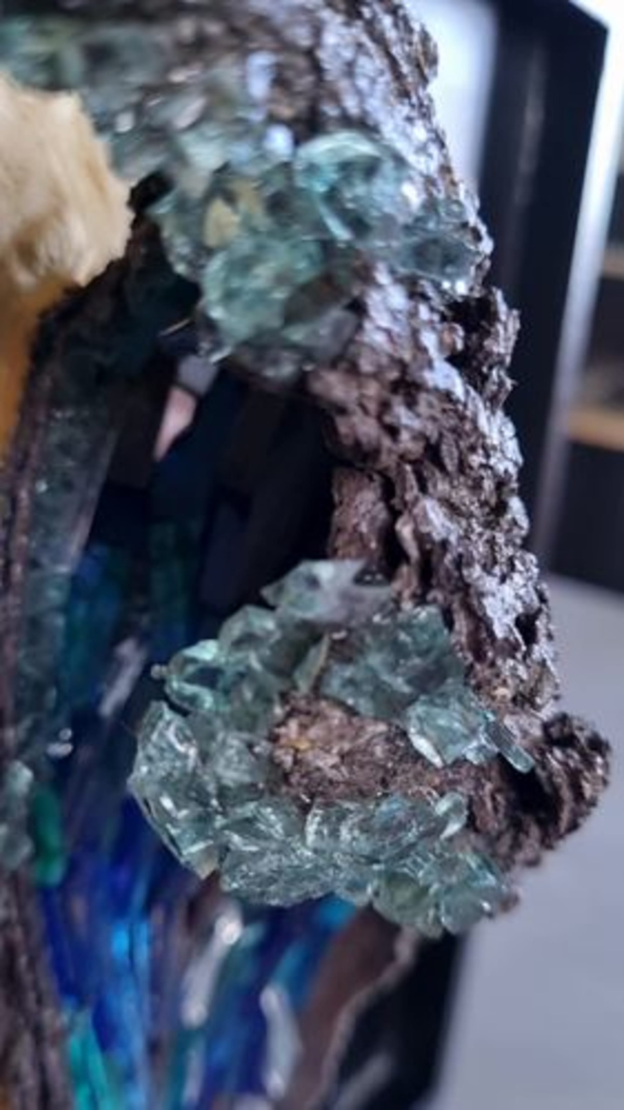 Ecorce naturellement recourbée, différents verres et pate de verres, miroir, débris de verre.
