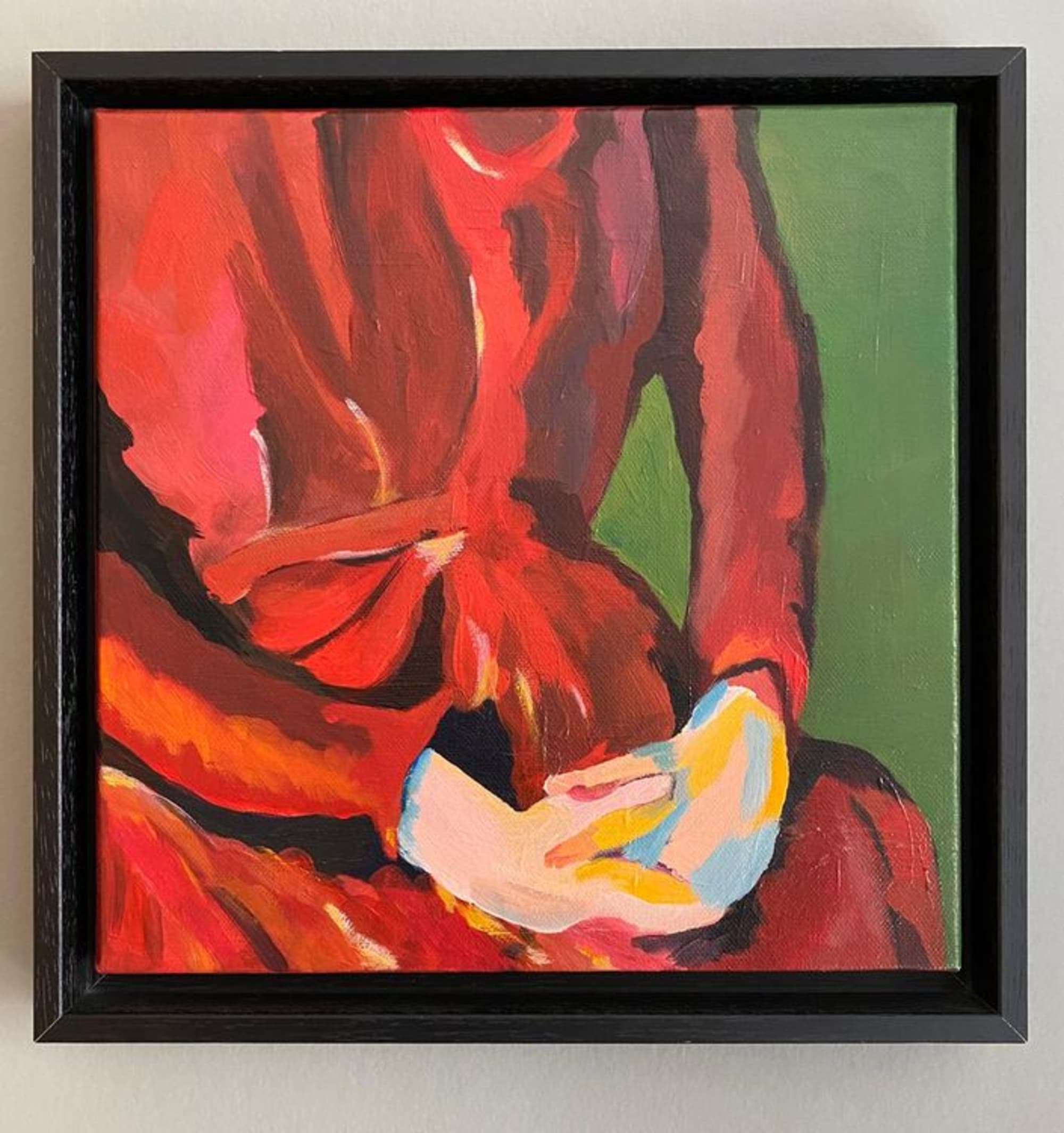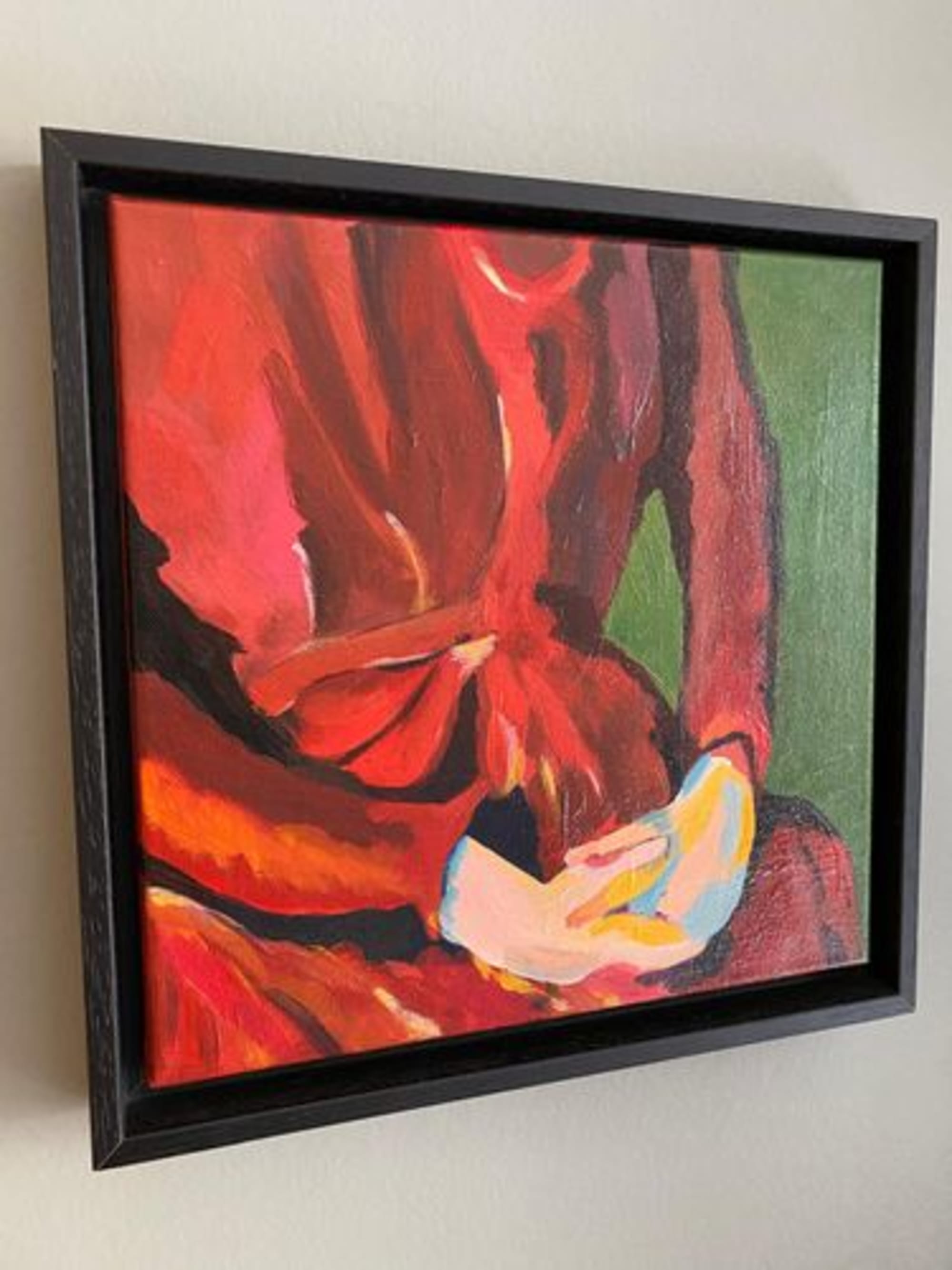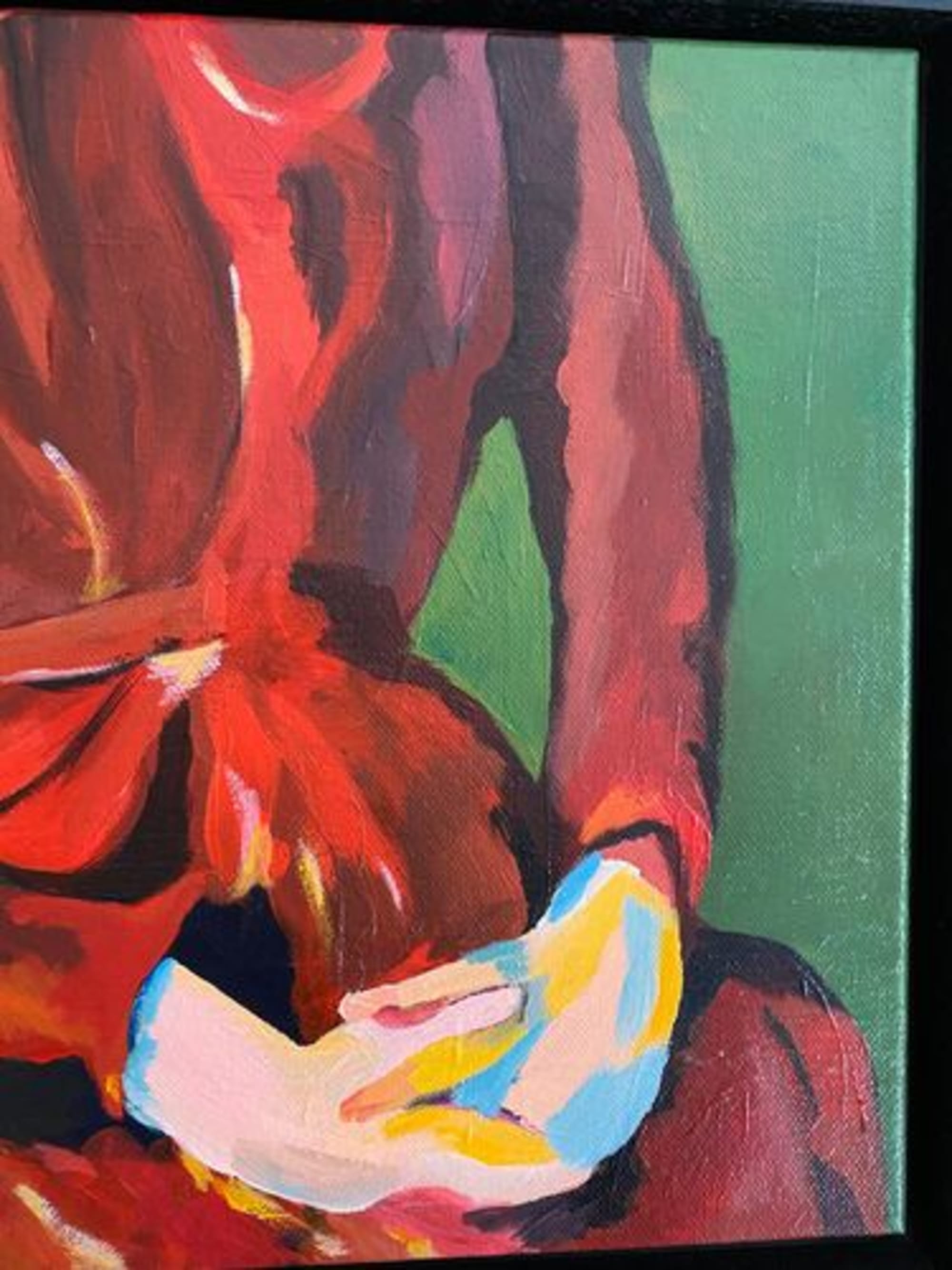 Zoom sur des mains croisées posées sur une robe. J’aime traiter la couleur en gros plans; le contraste est fort ici entre le rouge de la robe et le vert du fond. Beaucoup de nuances de rouges dans les plis du tissu et les ombres sur les manches.
