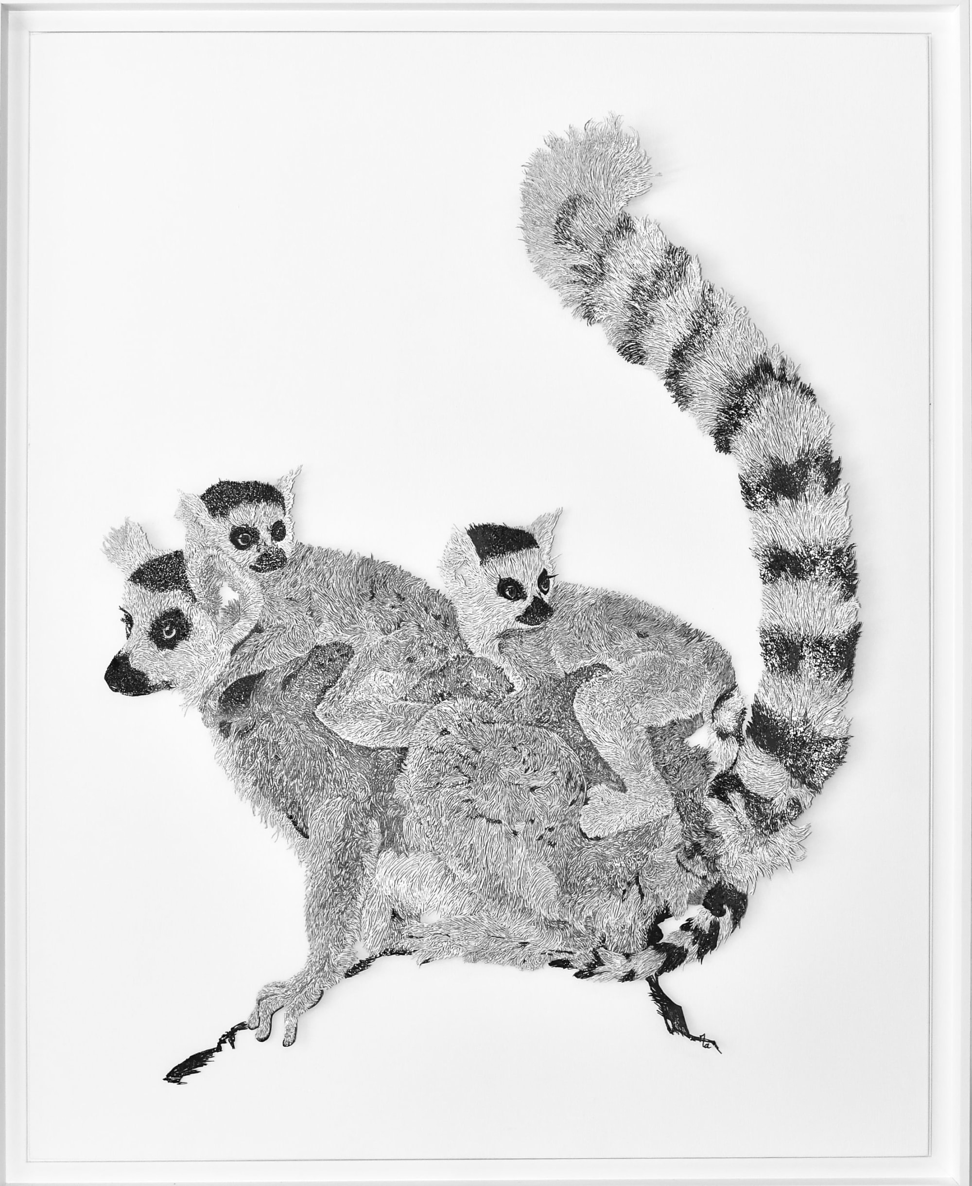 Le découpage est clouté sur une planche en bois de couleur blanche. L’encadrement est dans une caisse américaine blanche.