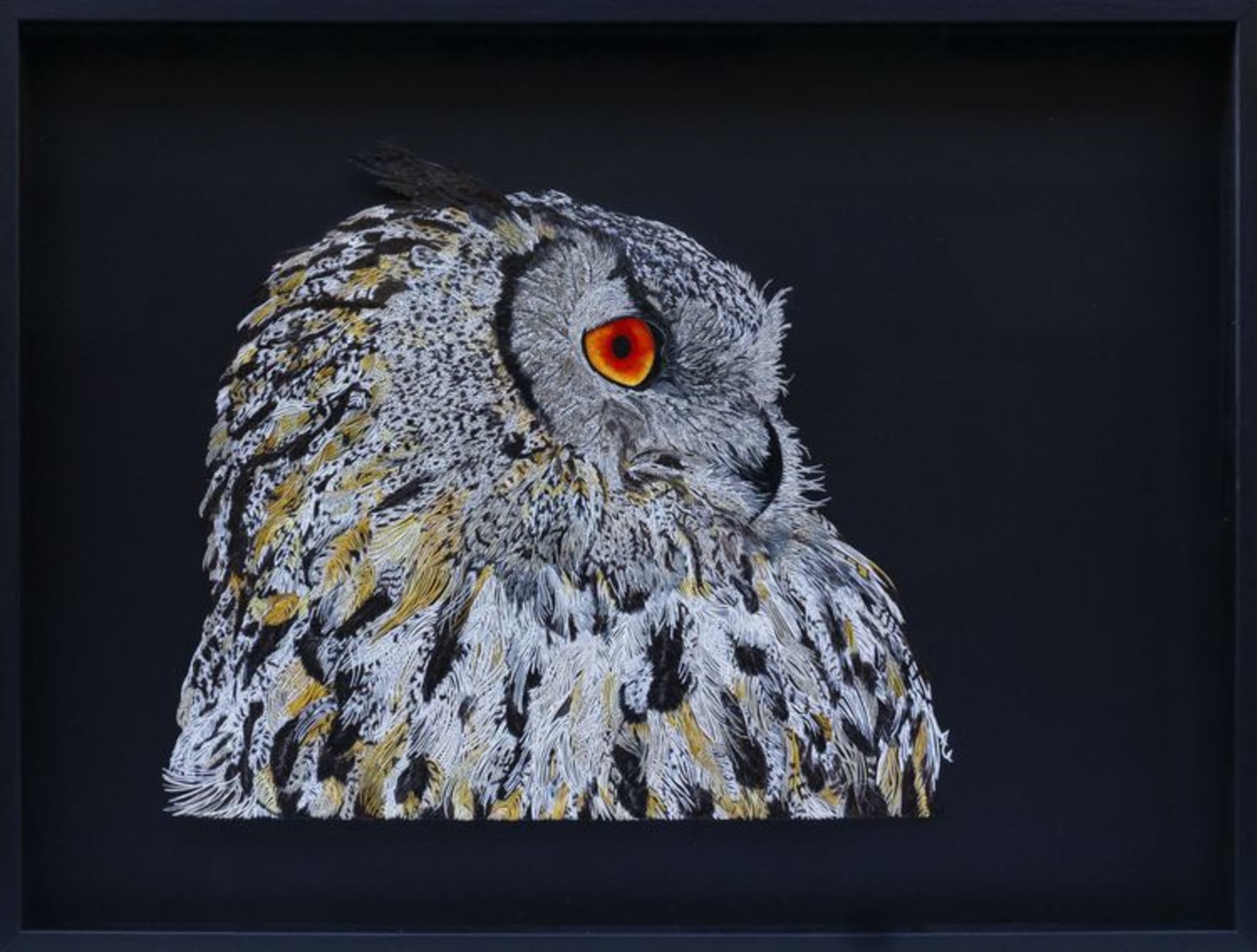 Le découpage est clouté sur une planche en bois de couleur blanche. L’encadrement est dans une caisse américaine blanche.