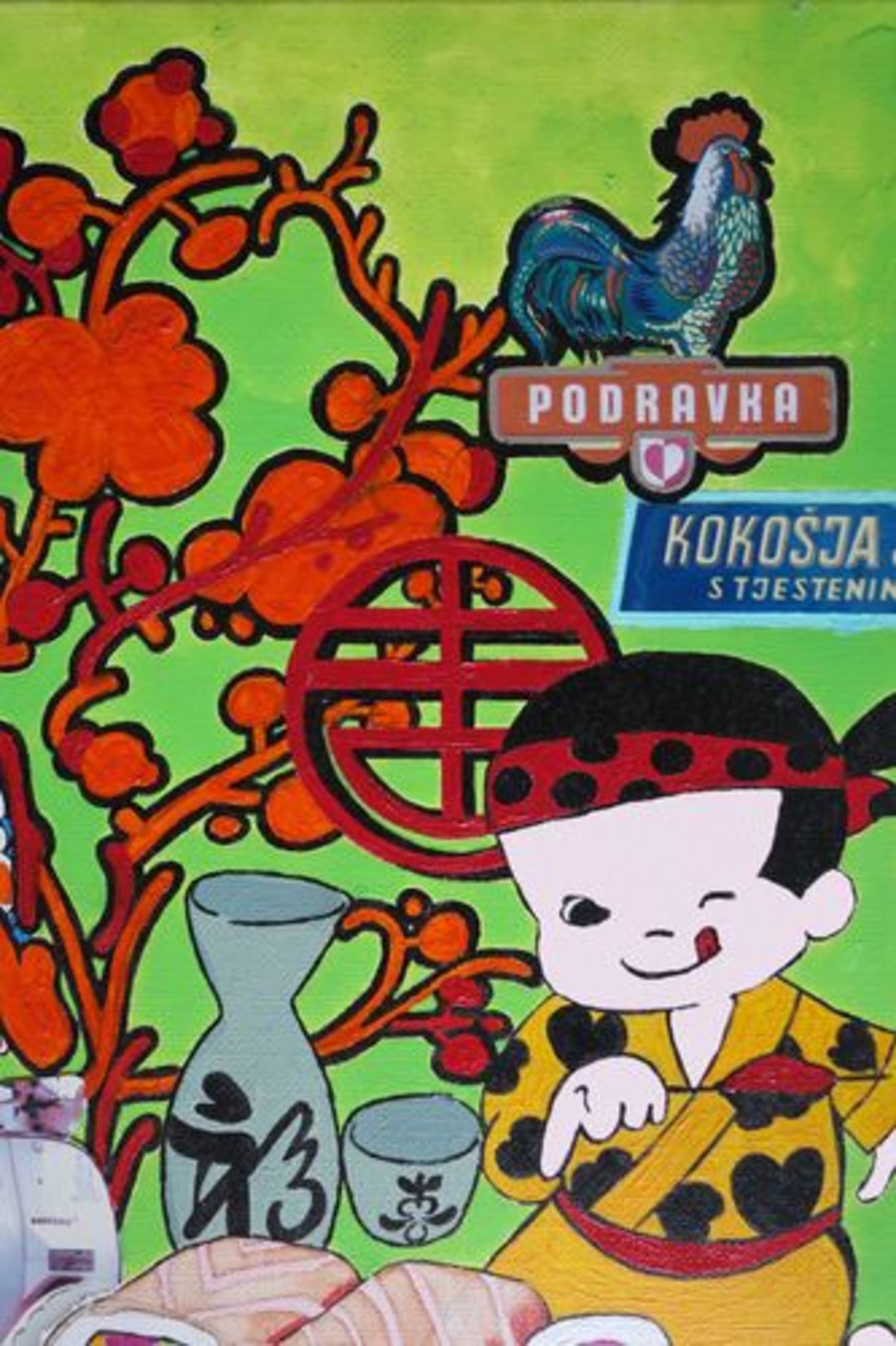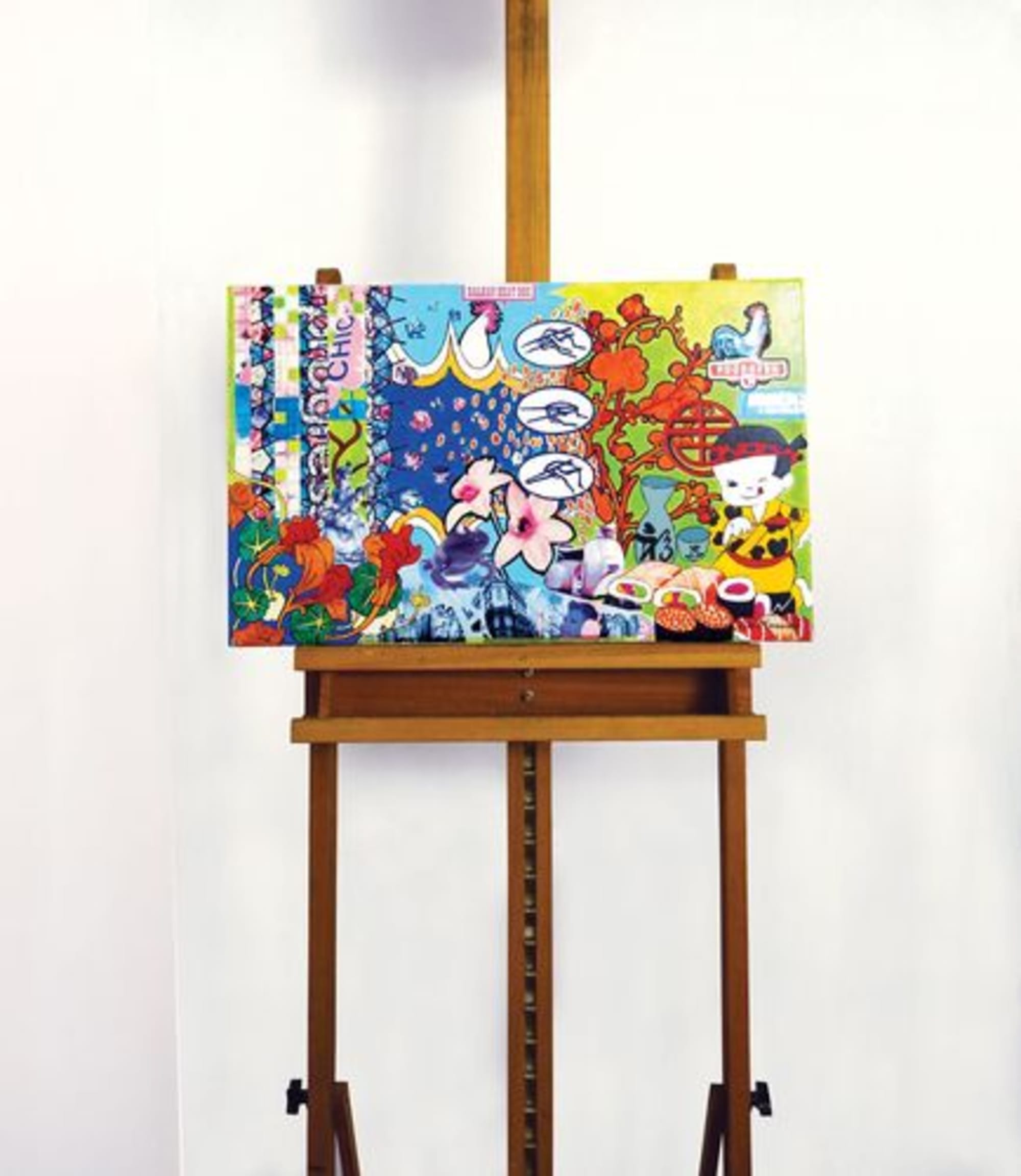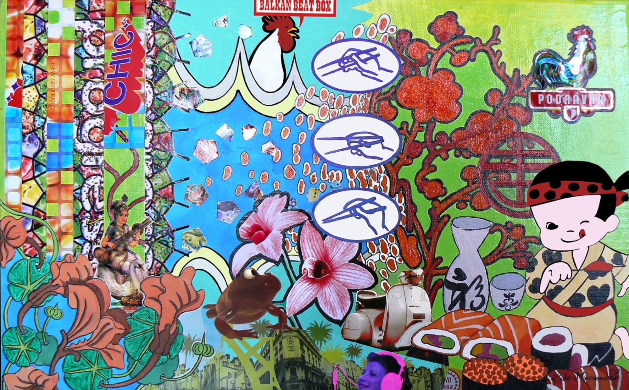 - technique mixte : peinture acrylique, encres et collages de flyers et d’emballages