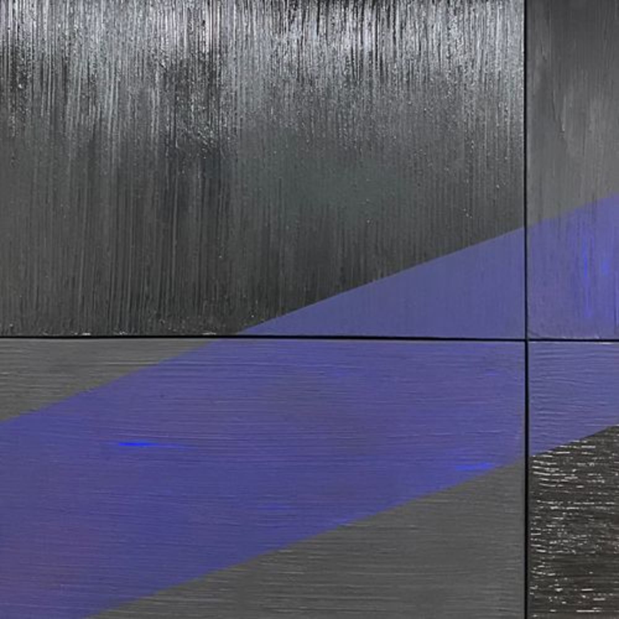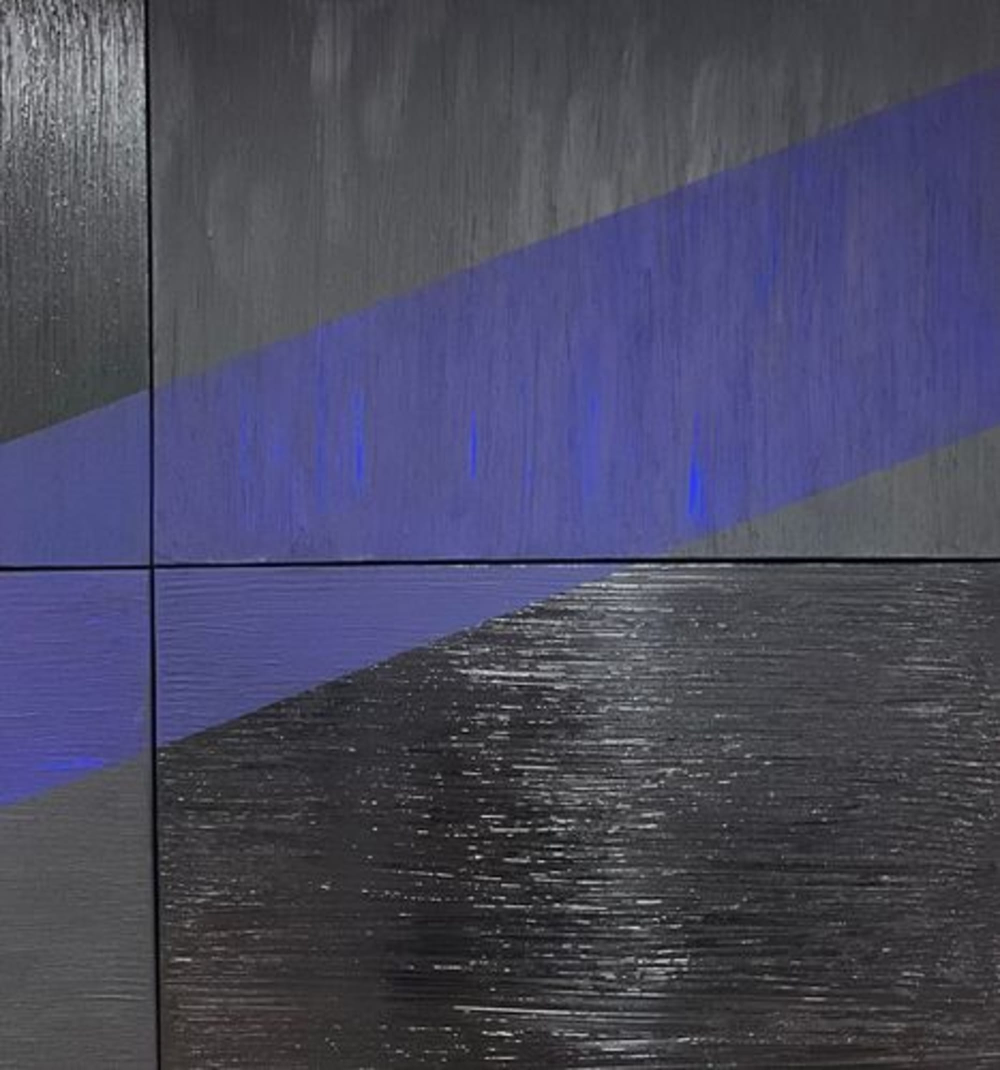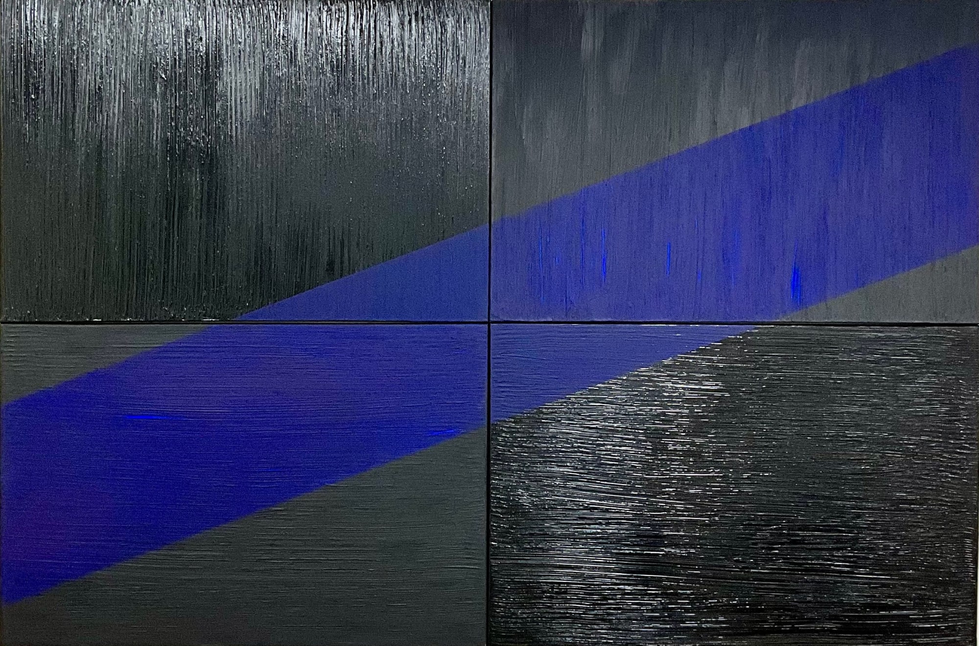 Sculpture sur toile en quadriptyque du « Noir de Mars » et de l’«IKB» pour représenter le mouvement de la vague dans l’horizon sur une mer tumultueuse.
