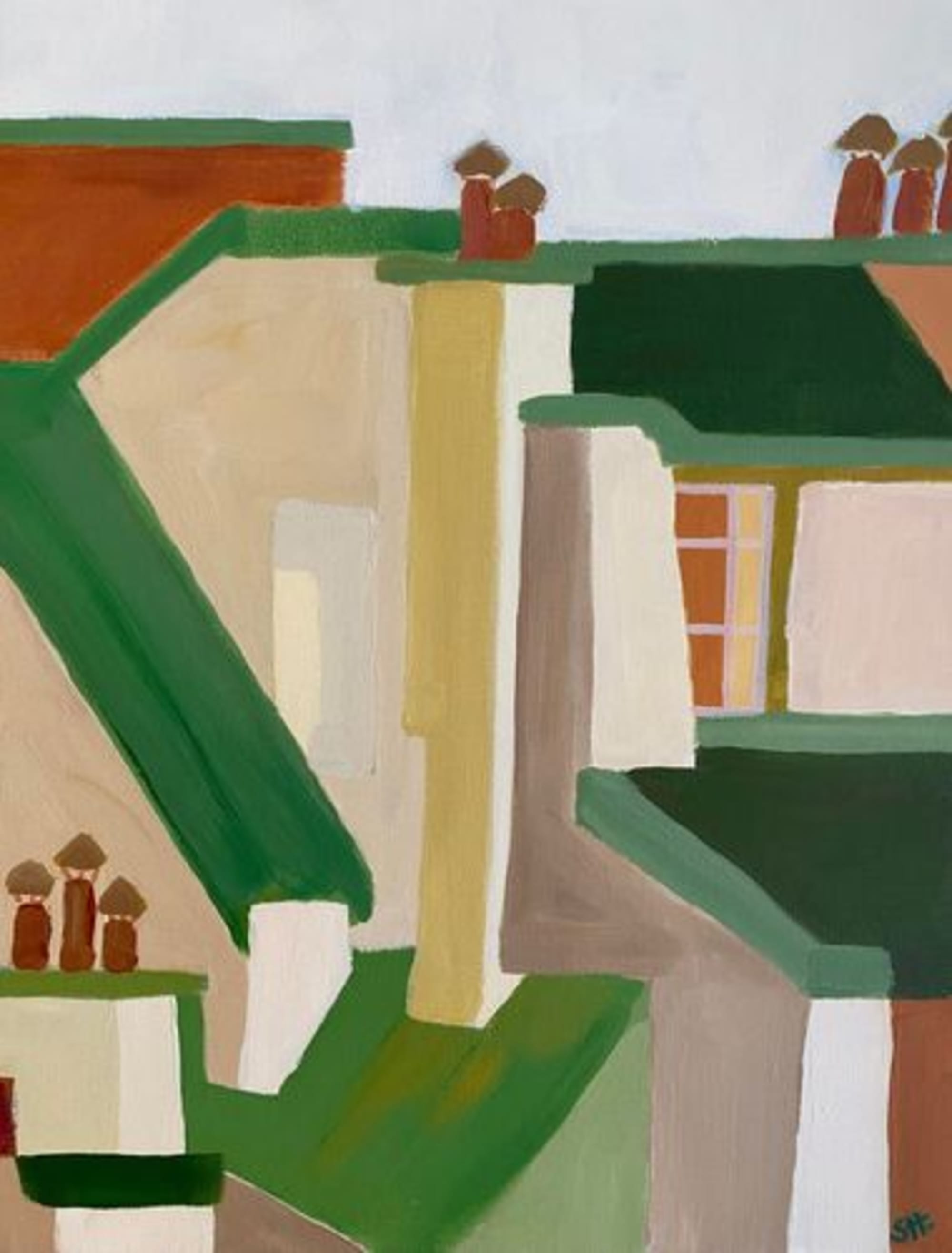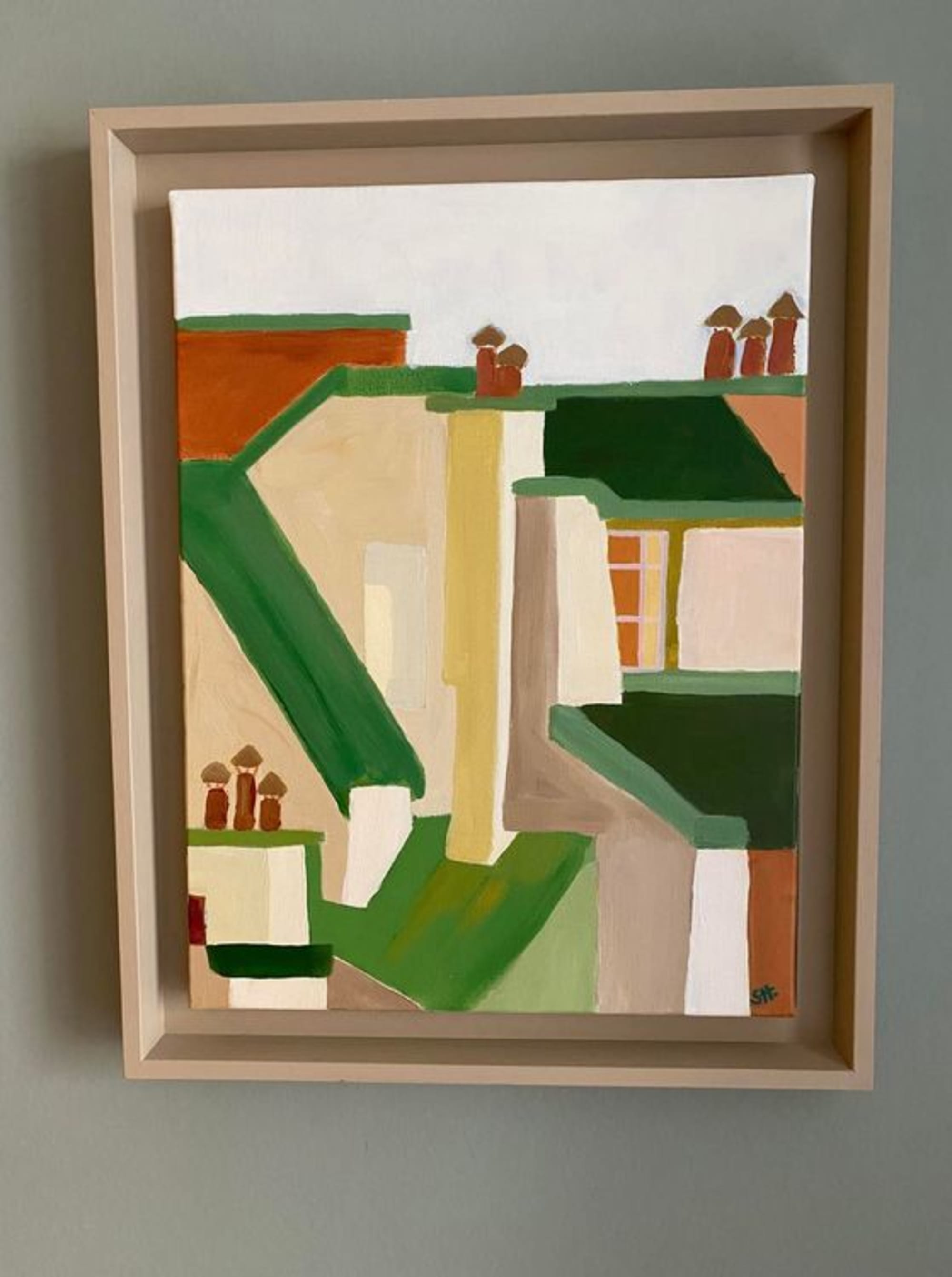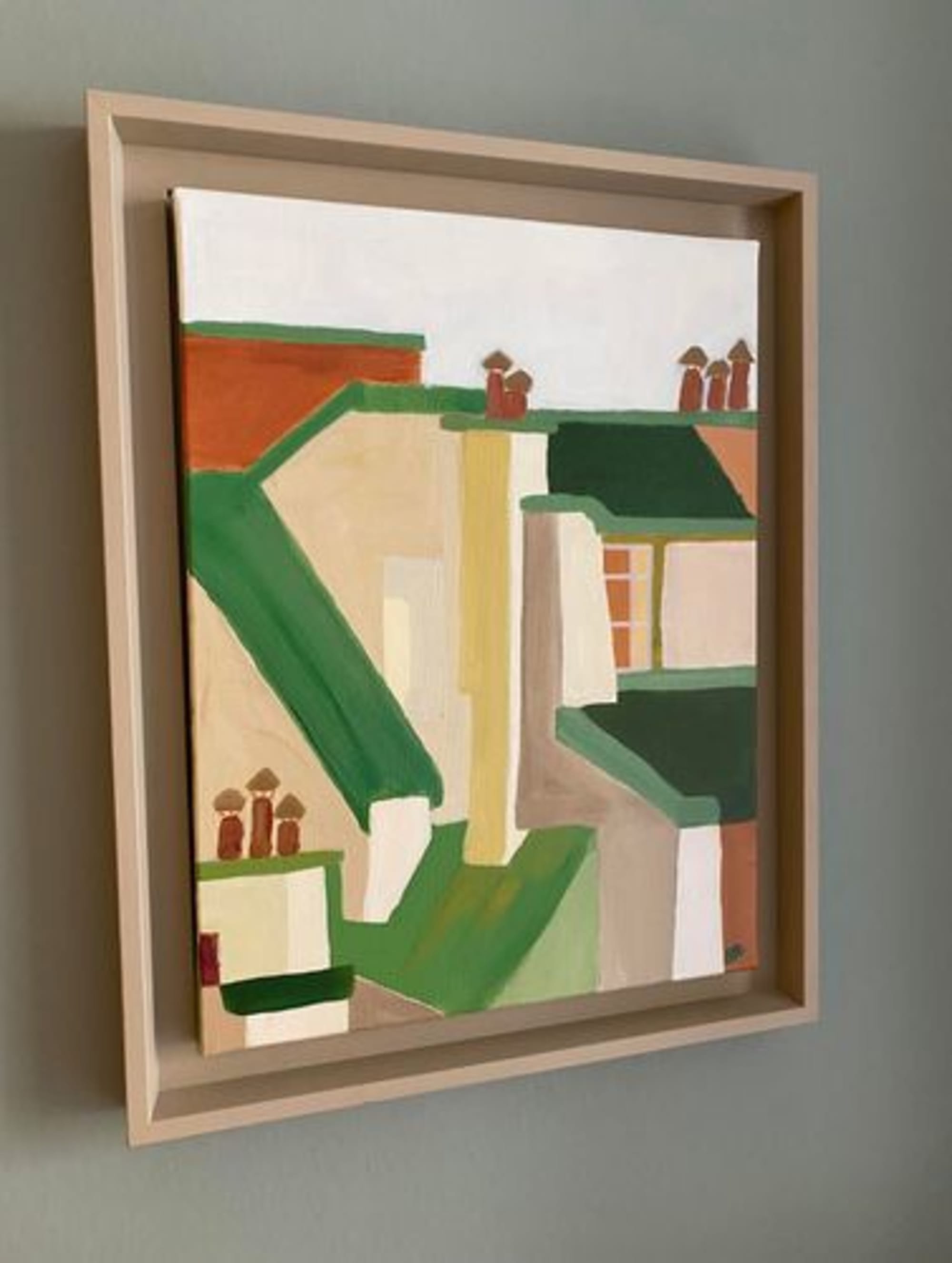Cette toile fait partie d’une collection destinée à être exposée dans un hôtel.Les toits de Paris, entre pans coupés, toits en zinc, fenêtres au loin, thème qui m’a inspirée et pour lequel j’ai décliné une palette de verts et terracottas.