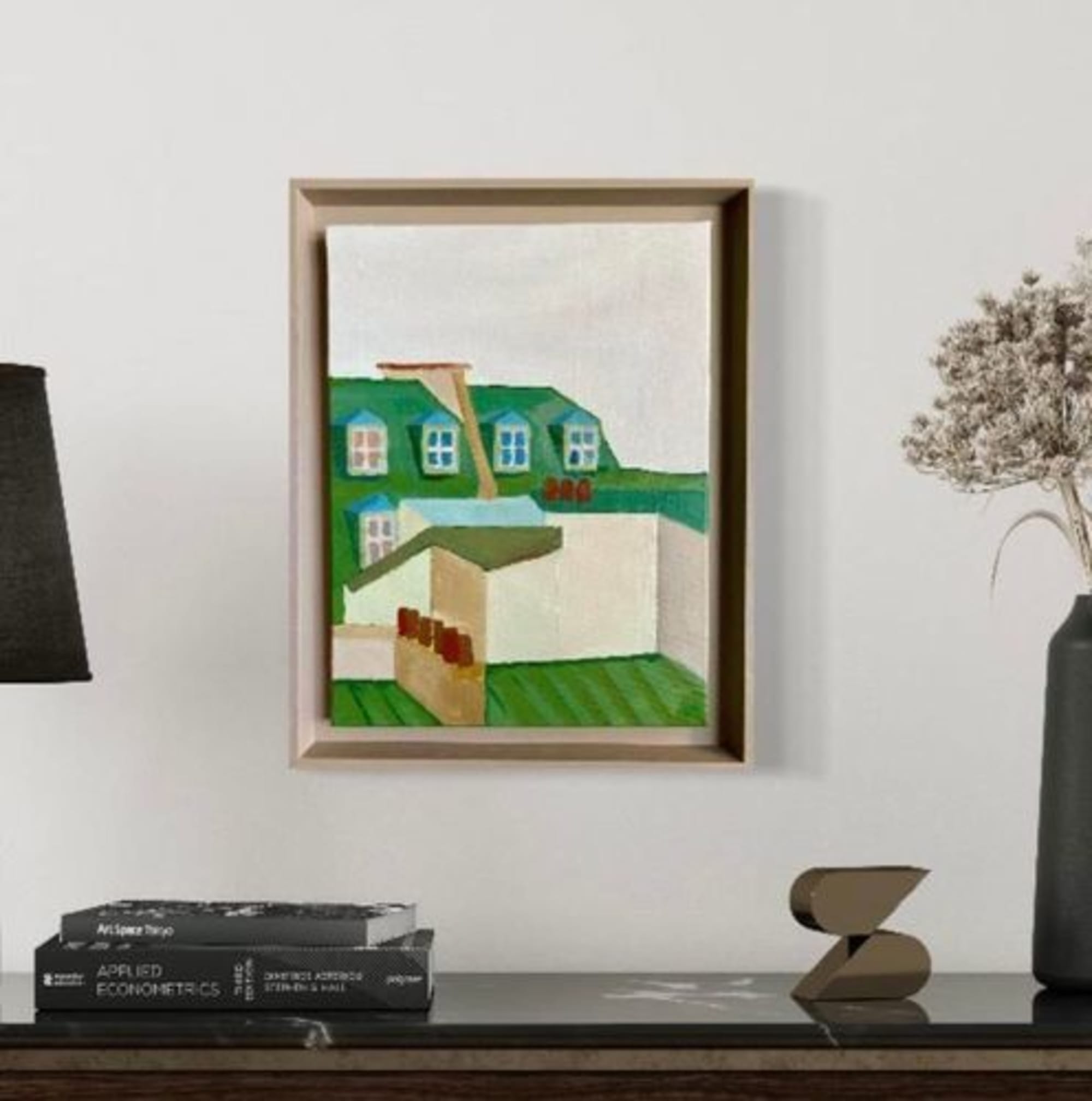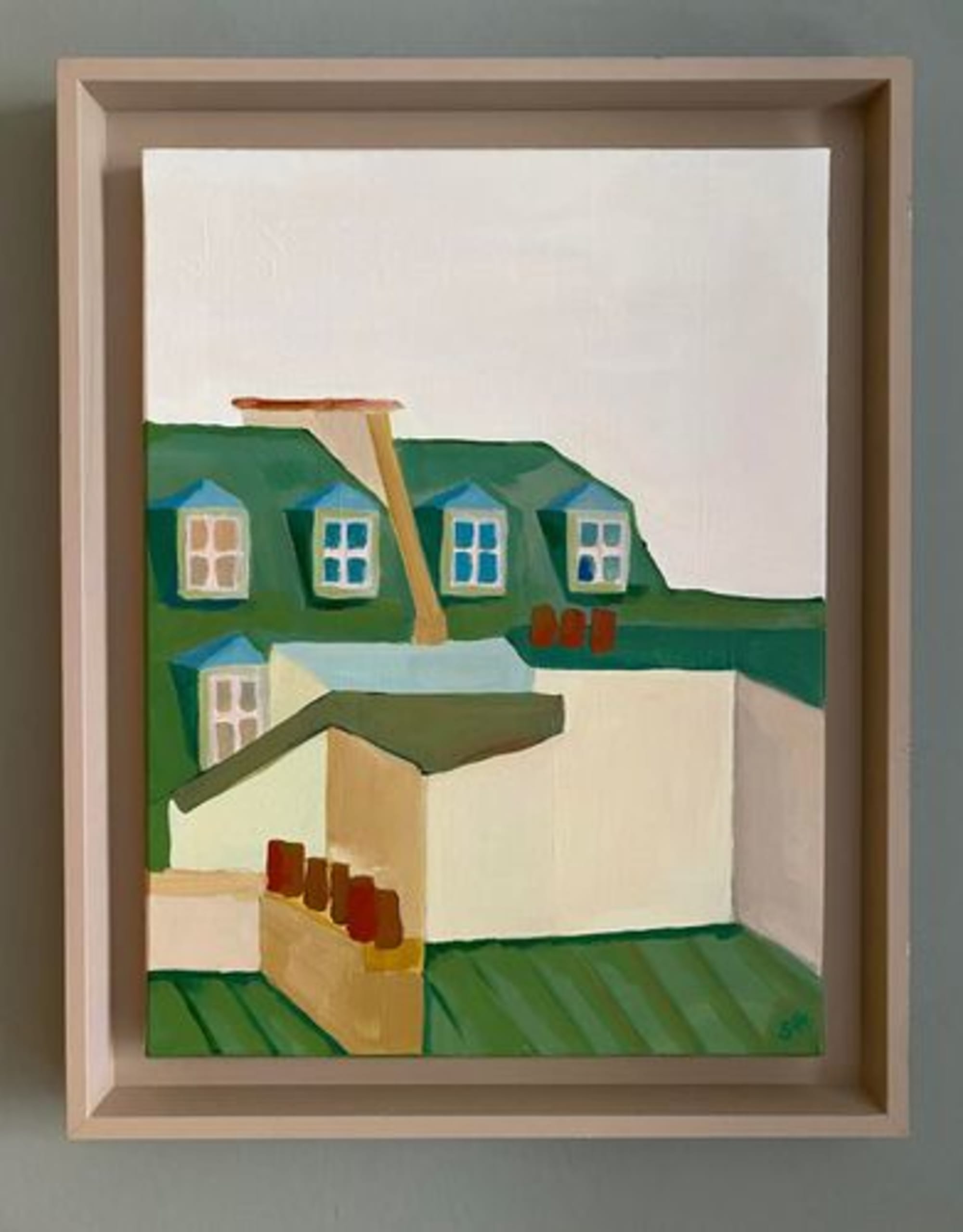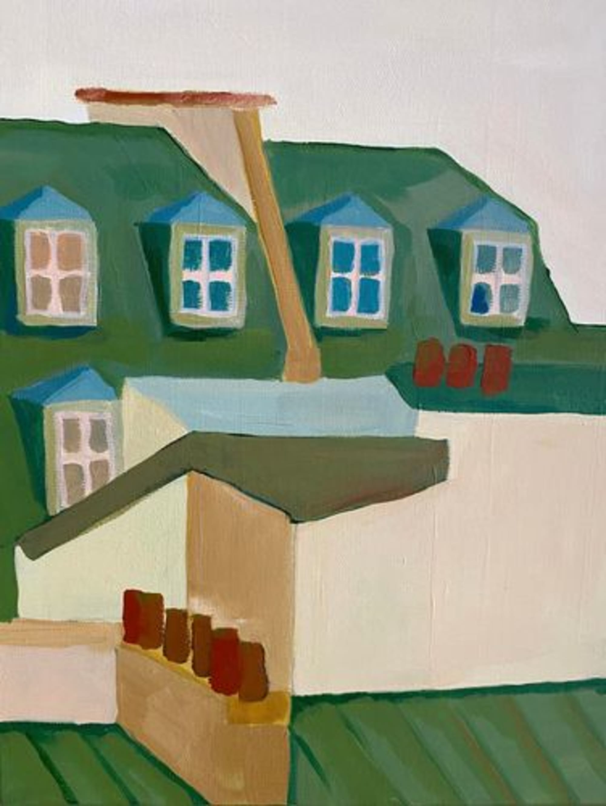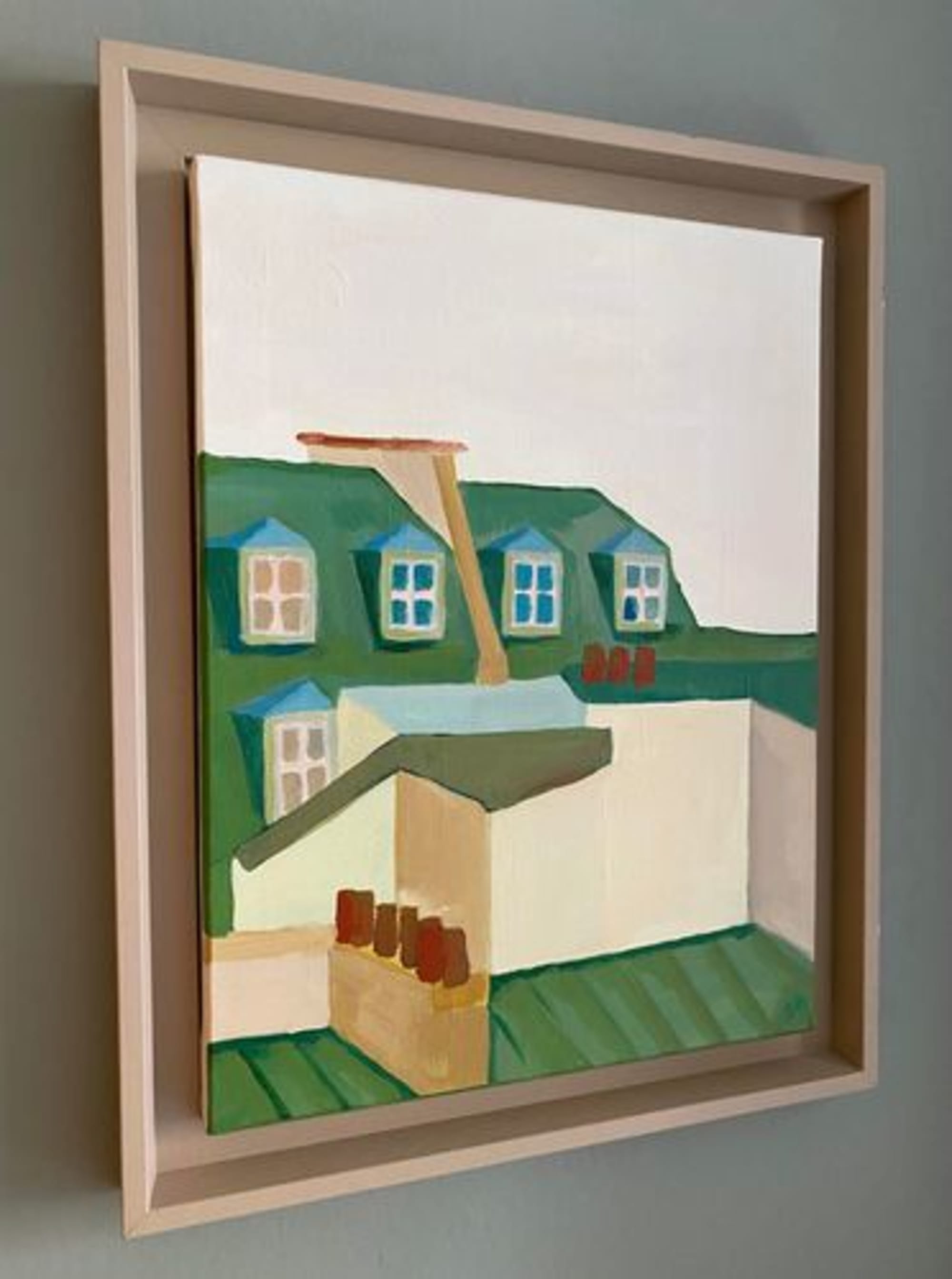 Cette toile fait partie d’une collection sur les toits de Paris. Une histoire où le regard passe de plan en plan; j’ai décliné plusieurs toiles dont celle là dans des teintes de vert, beige, terracotta et rouge brique.é