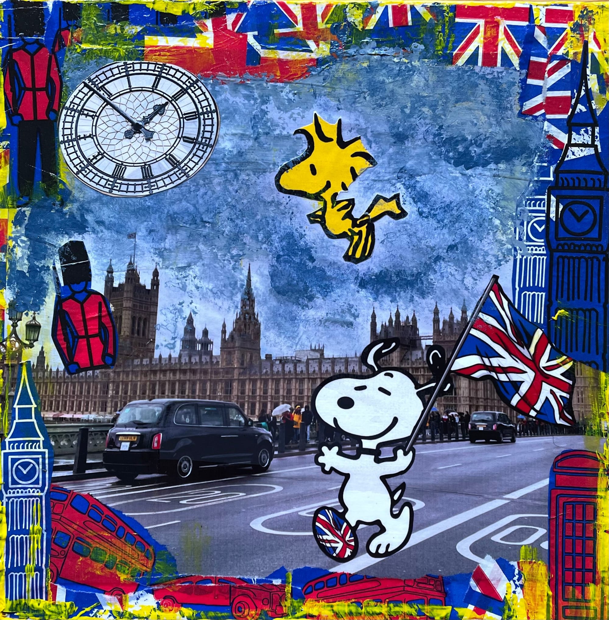 Ce collage unique fait partie de la série Snoopy en voyage, où le célèbre beagle explore le monde. Ici, tout sourire, Snoopy traverse le pont devant Big Ben et Westminster, brandissant fièrement le drapeau britannique. À ses côtés, son inséparable ami Woodstock partage cette escapade londonienne pleine de charme et de bonne humeur. 🇬🇧✨