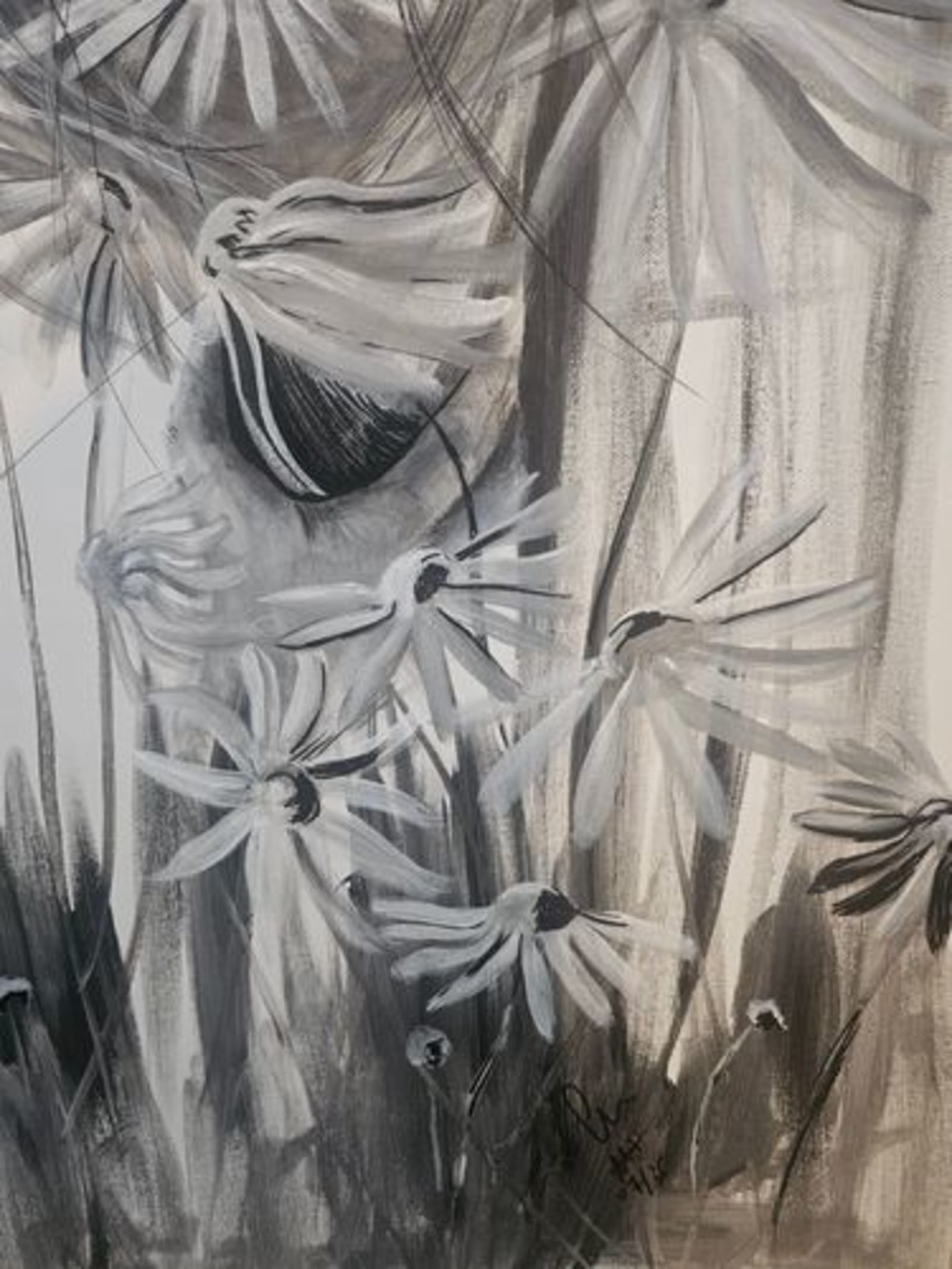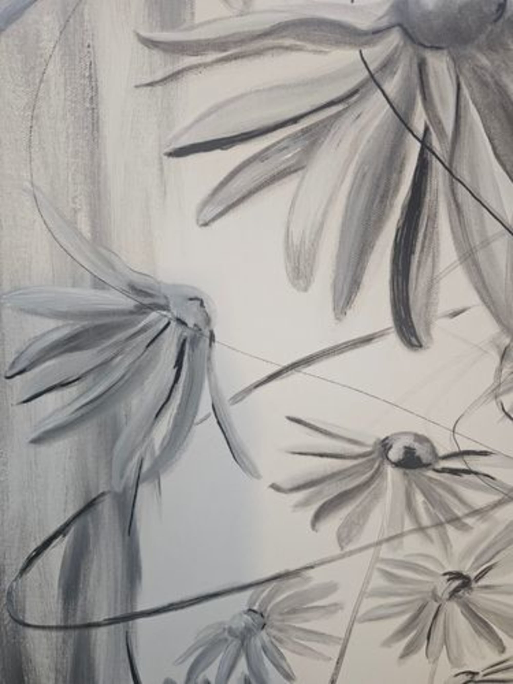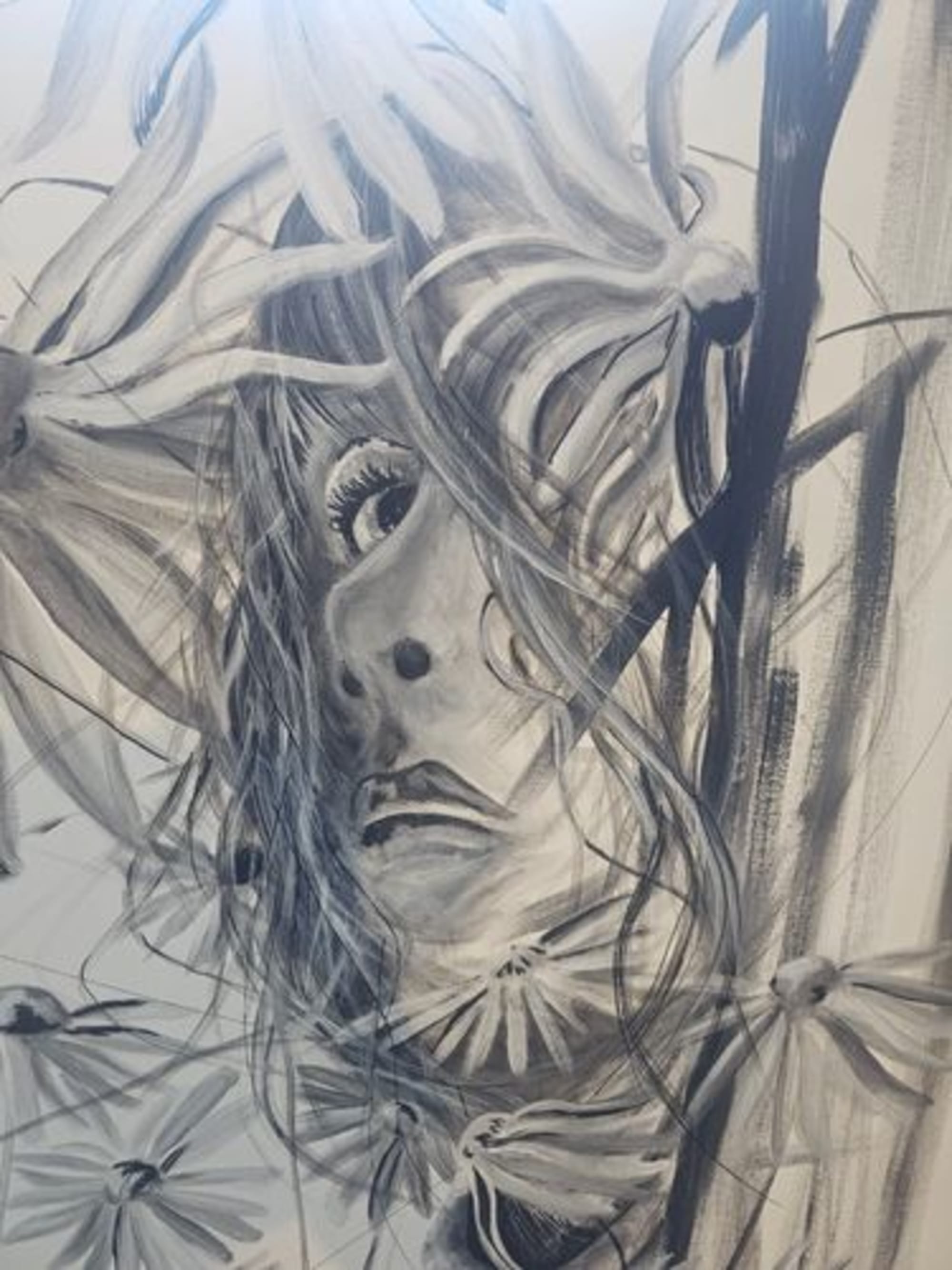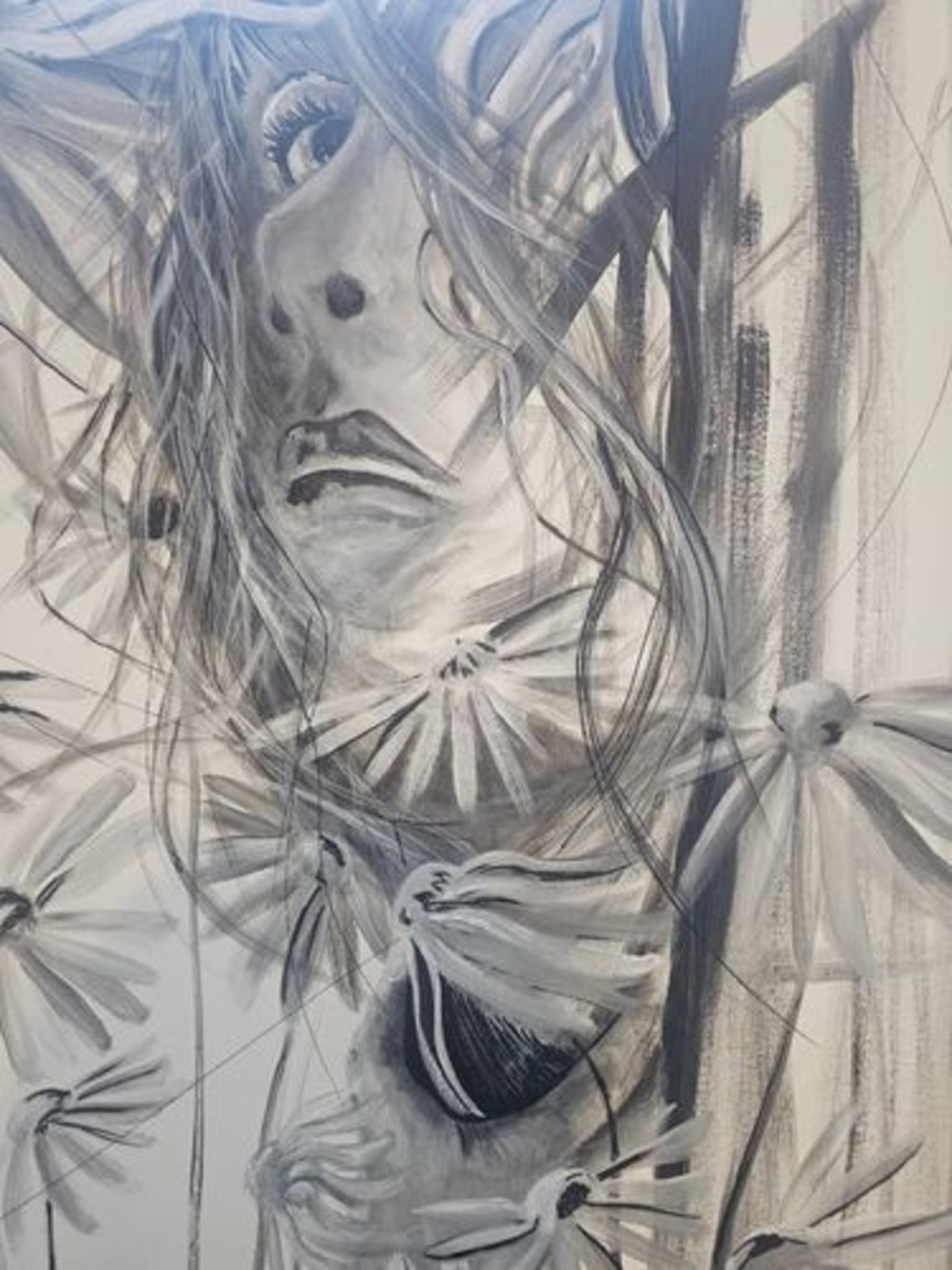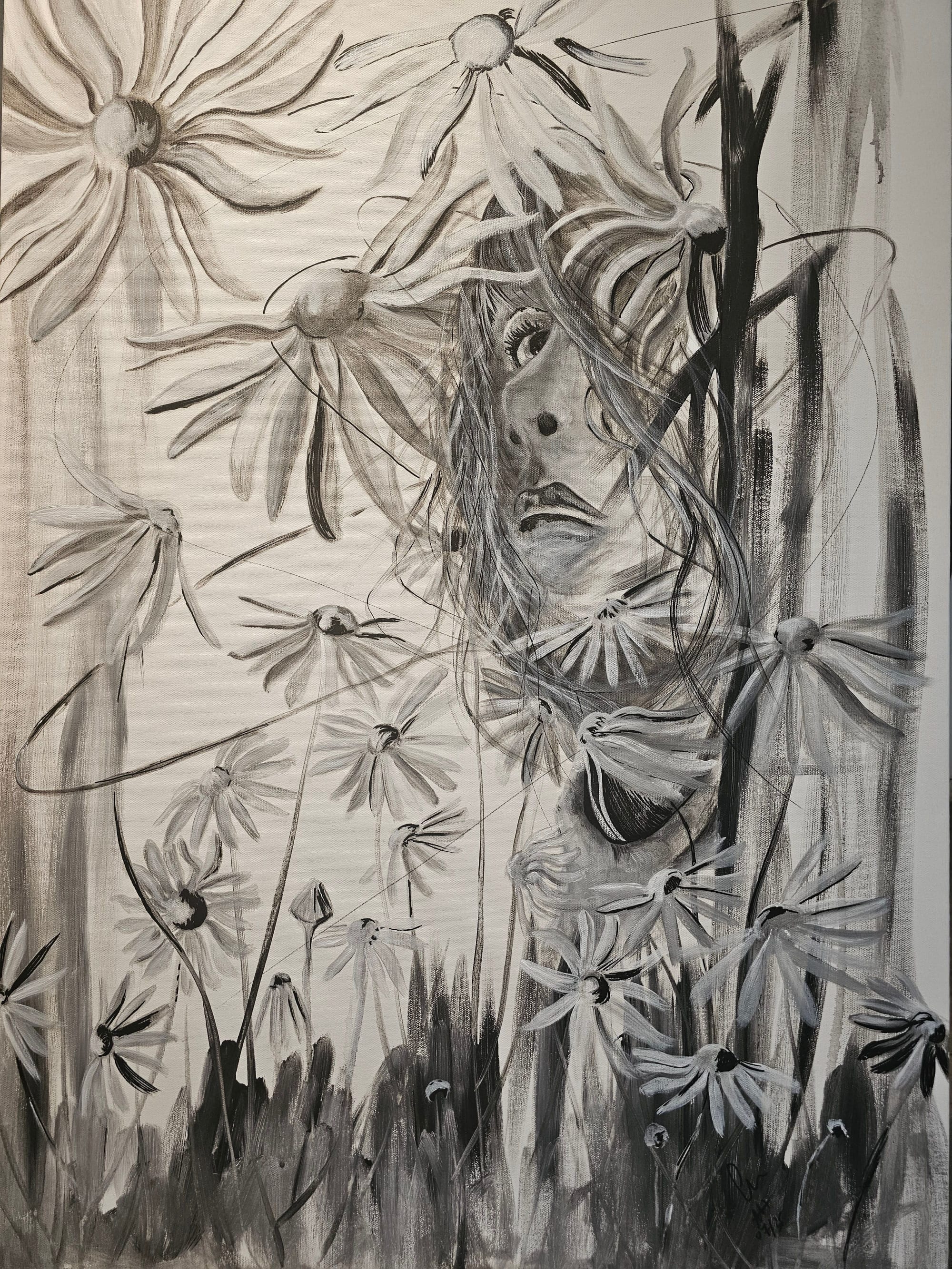 Acrylique sur toile réalisé pour un concours . Le thème etait Marguerite. Je l’ai appelé ELISE pour faire un clin d’œil a l organisatrice et artiste de ce concours. Il représente une femme remplie de desirs inassouvis. Les marguerites représentent ses envies, ses peurs, ses tourments. Mais elles représentent aussi le mouvement, le temps, que tout bouge, tout passe…rien est figé.