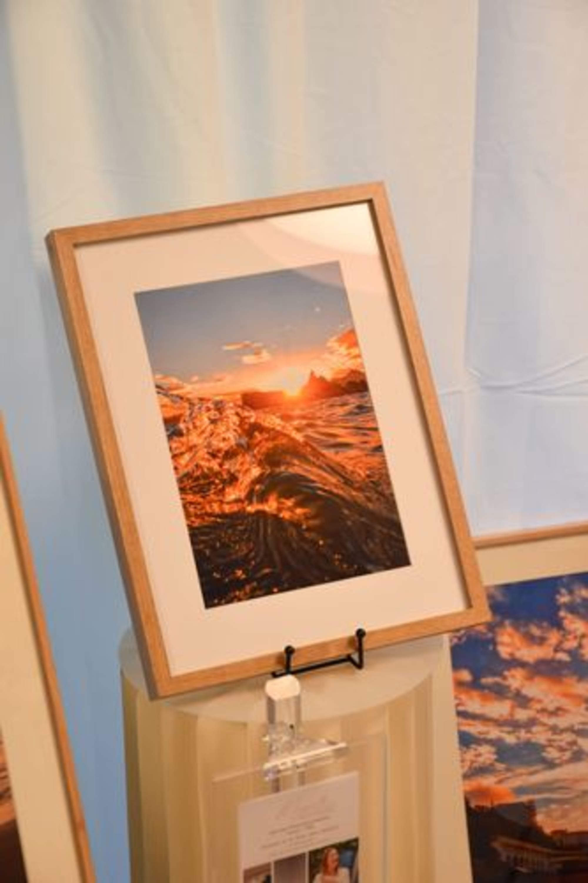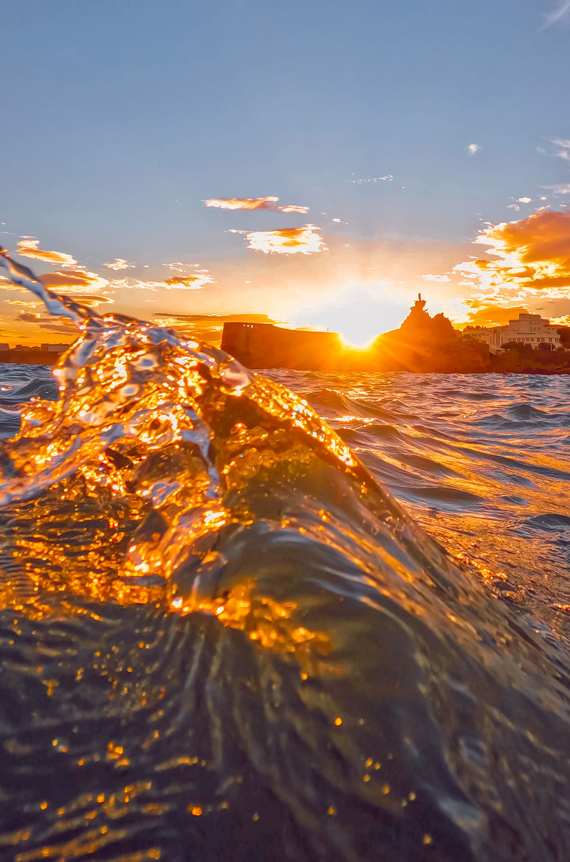 Cette photographie joue subtilement entre abstraction et réalisme, capturant un instant où mer, lumière et architecture se rejoignent dans une harmonie visuelle pure. La scène est saisie à fleur de vague, offrant une perspective immersive et dynamique. Une petite crête liquide, figée en mouvement, capte la lumière dorée du soleil naissant, comme en feu. Les textures de l’eau, nettes au premier plan, contrastent avec les silhouettes lointaines du rivage et du célèbre Rocher de la Vierge en arrière-plan.