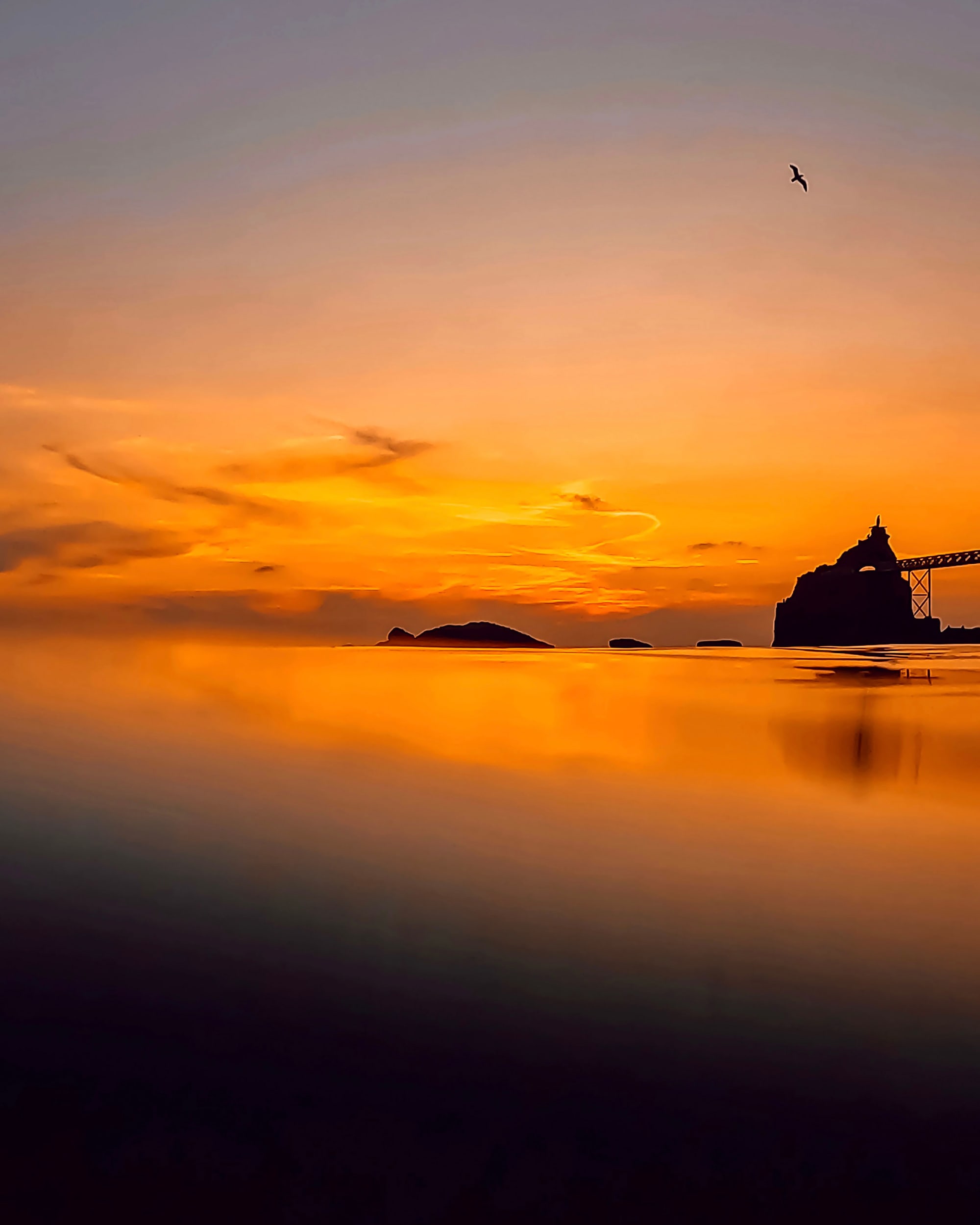 Cette photo évoque un moment suspendu, presque irréel, où la lumière et l’ombre se mêlent dans une parfaite harmonie. Le ciel est embrasé de nuances allant de l’orange vif au jaune doré, se fondant peu à peu dans un dégradé plus doux vers le bleu-gris en haut de l’image. La mer, calme comme un miroir, reflète fidèlement ces couleurs flamboyantes, créant une atmosphère à la fois chaleureuse et apaisante.