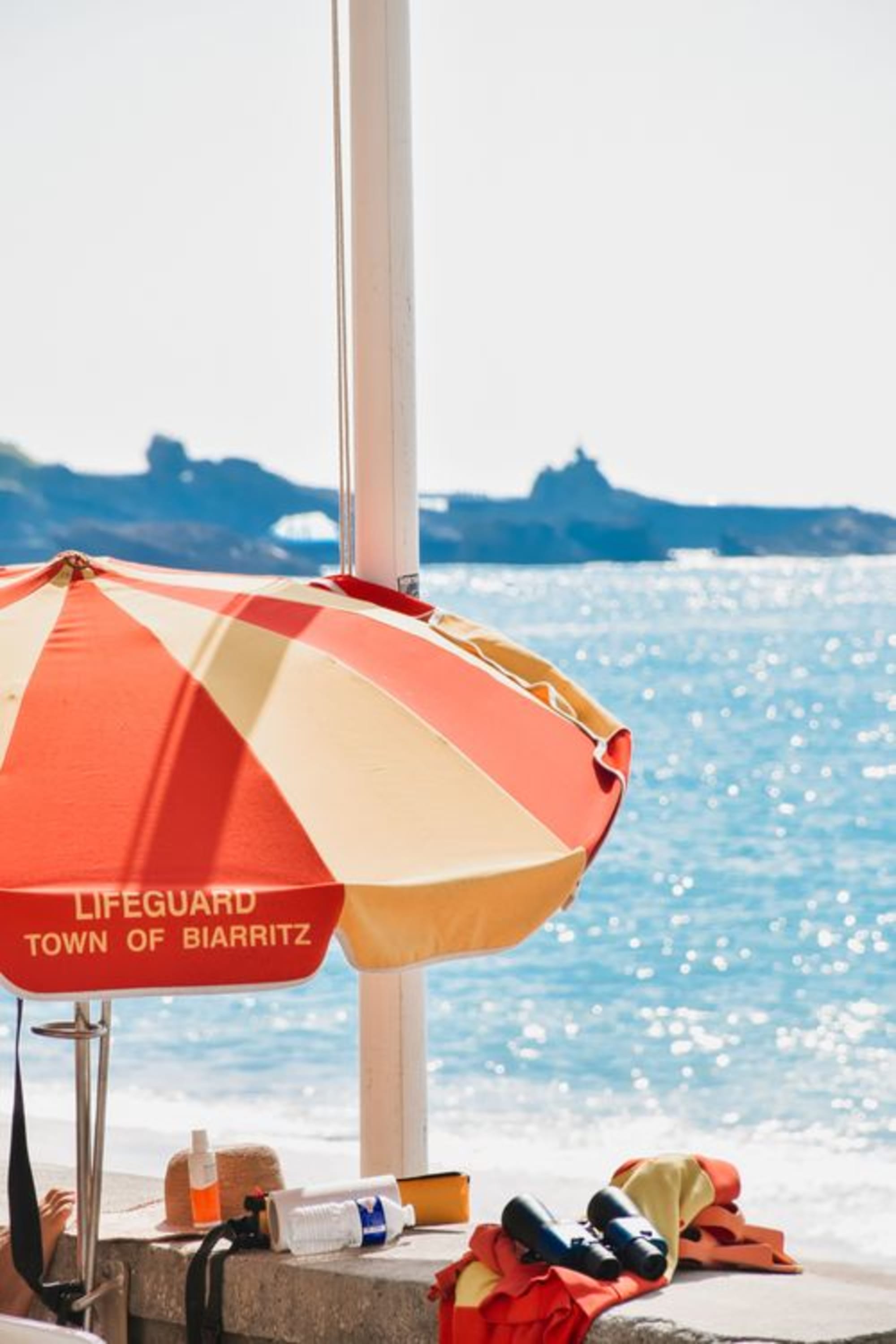 La lumière douce du début d’après-midi enveloppe le parasol, faisant danser les couleurs sur l’Océan et transformant un simple coin de plage en tableau vivant.