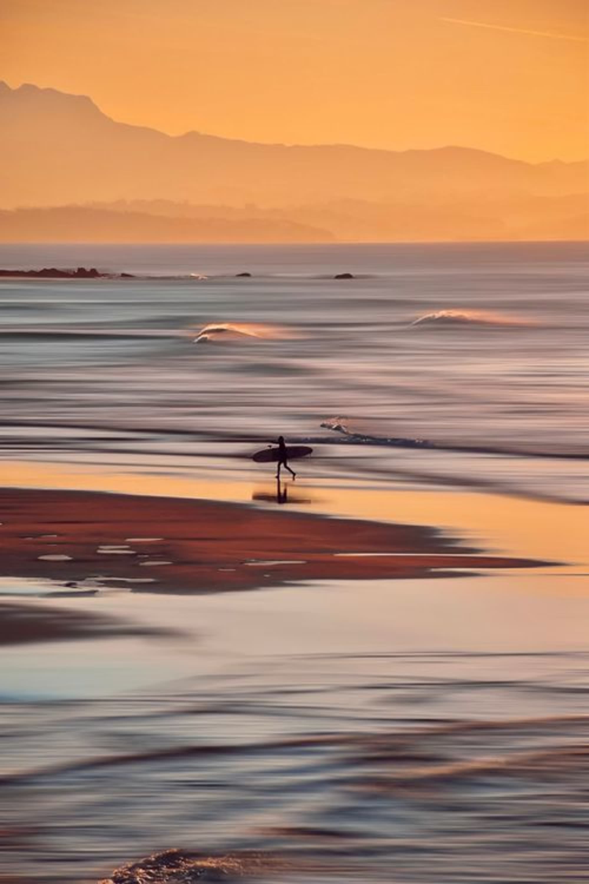 Au centre, un surfeur solitaire semble suspendu dans le temps, fragile silhouette face à l’immensité. Chaque reflet de lumière sur l’eau devient un souffle fugitif, et l’image se fait poème : passage, solitude et éphémère se rencontrent dans cet infini.