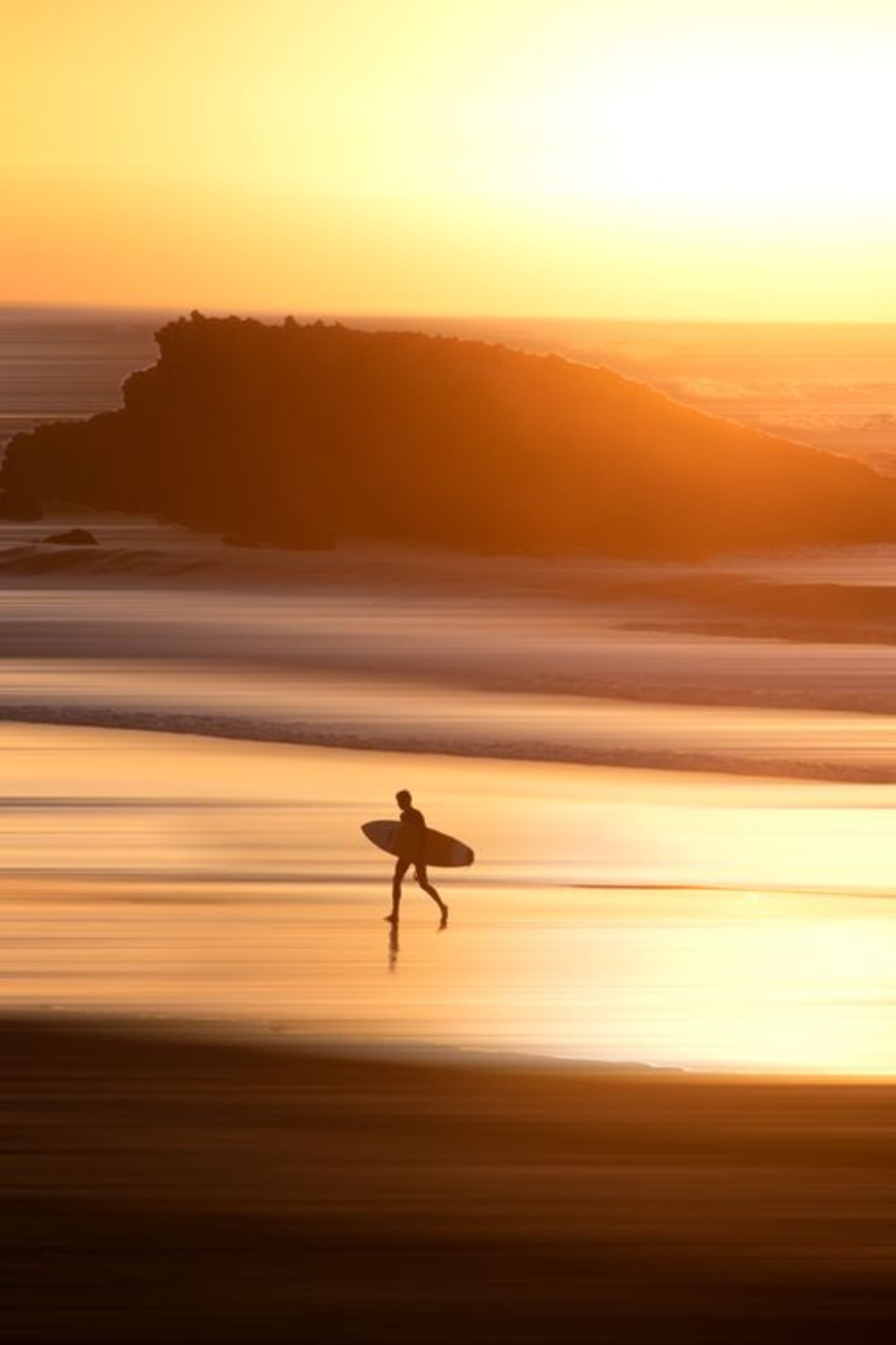 La scène se déploie sous une lumière dorée qui enveloppe l’océan et le ciel, transformant le paysage en un espace presque abstrait. L’image capture à la fois la chaleur, la tranquillité et l’éphémère de ce moment unique, où la lumière semble arrêter le temps.