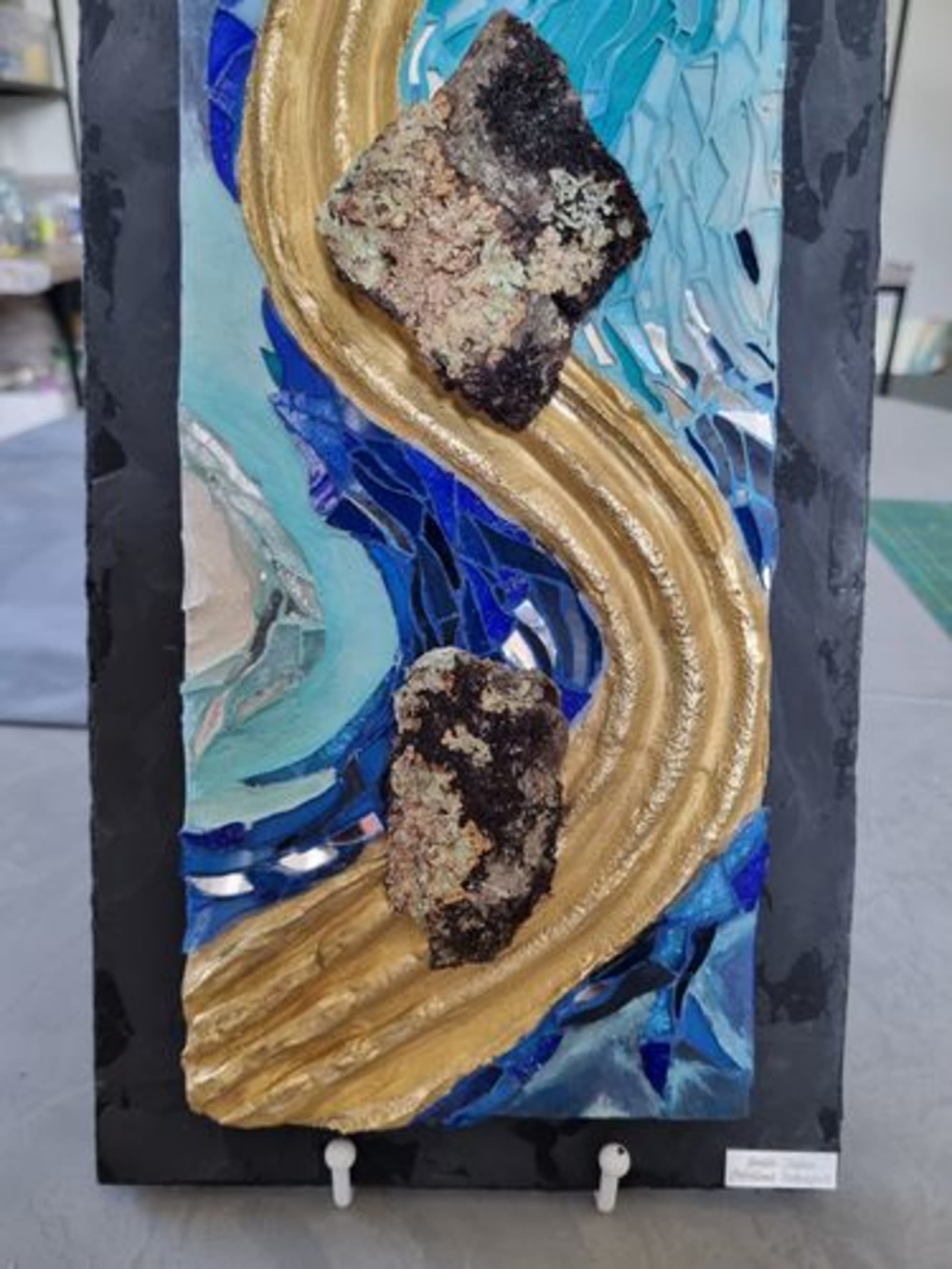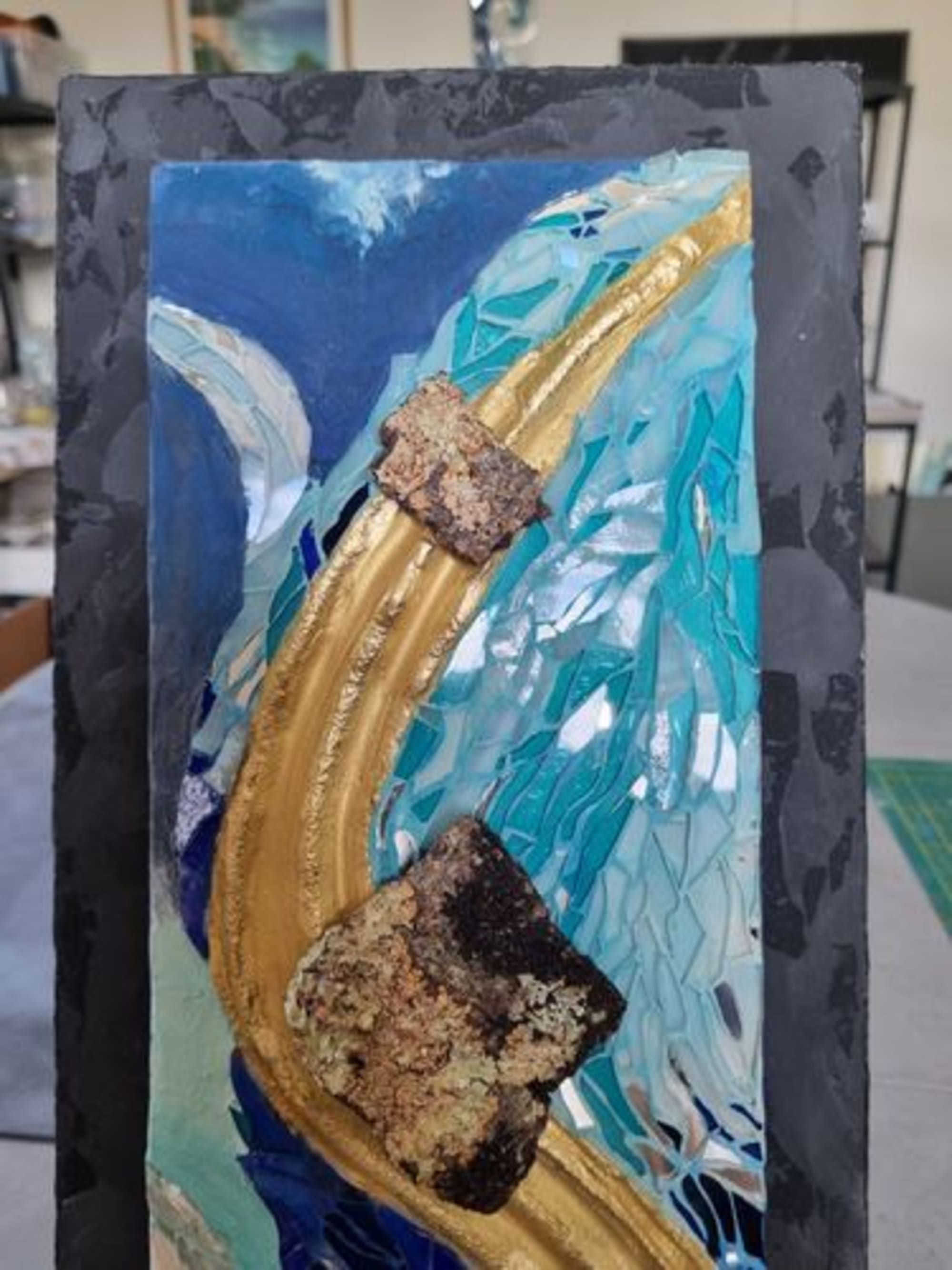 Mosaïque de verre vitrail et coloré, écorces naturelles et feuilles d’or.