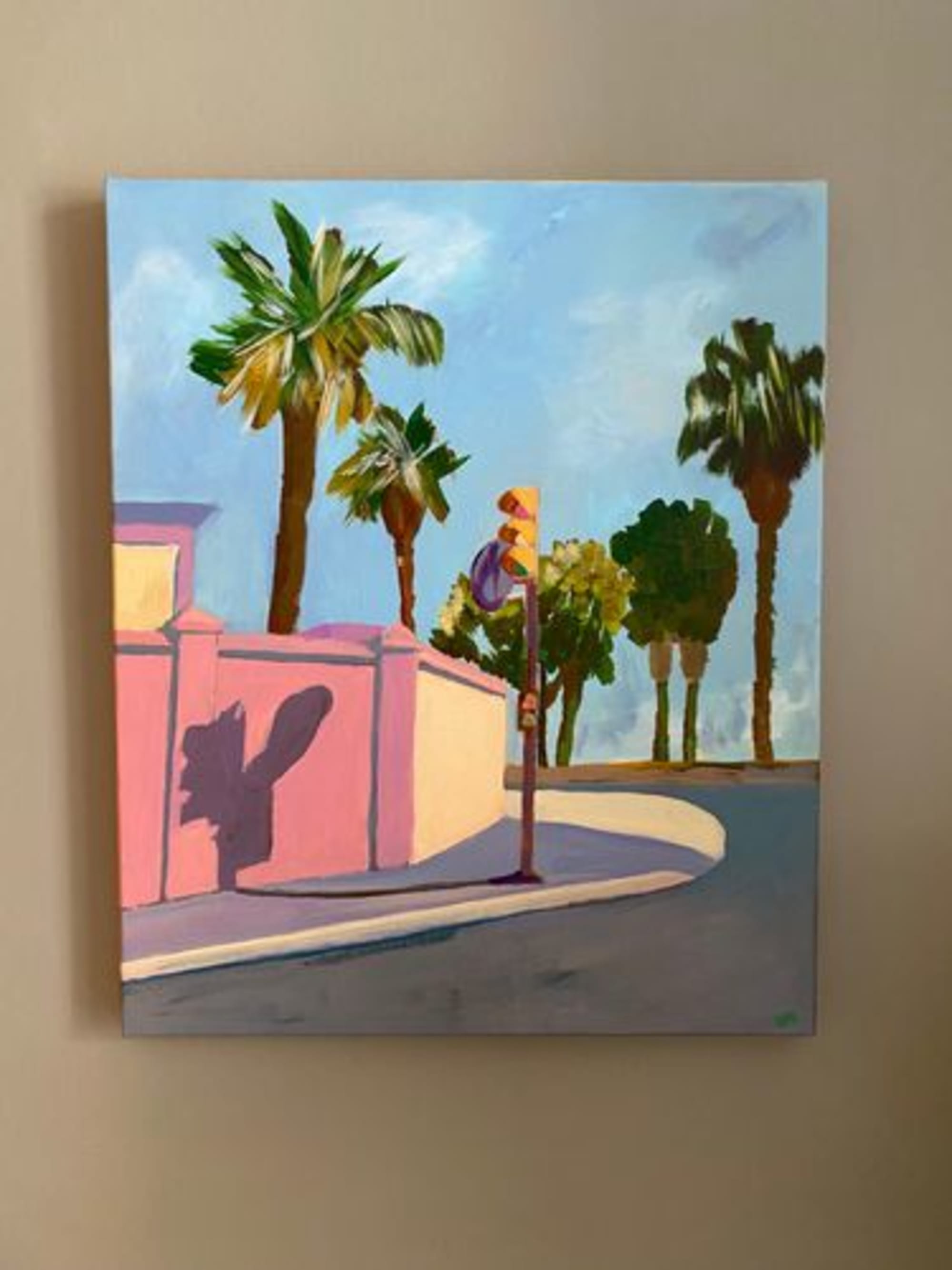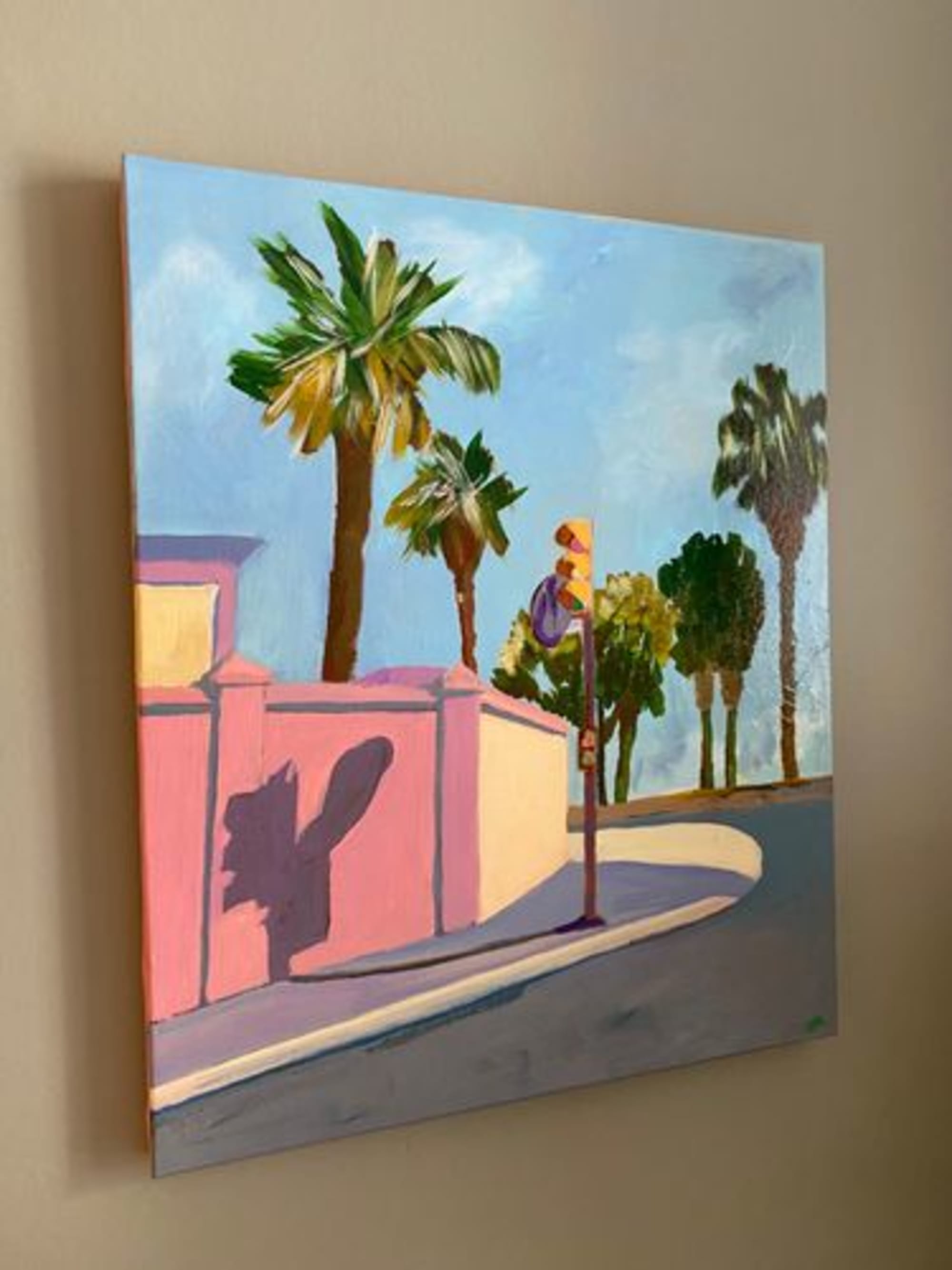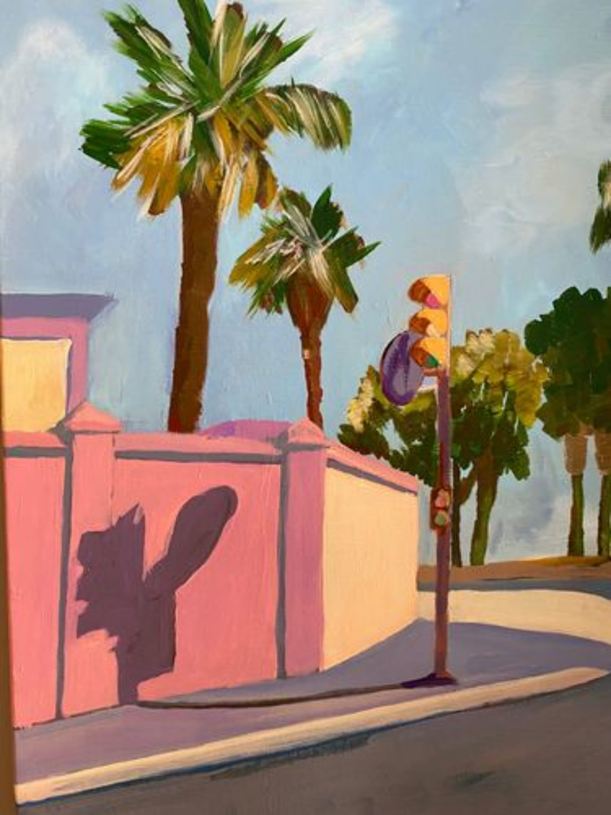A Malaga, ce feu de signalement se reflète sur un mur rose. Il n’y a personne, seuls les palmiers agitent leurs feuillages. On perçoit la chaleur de la journée.
