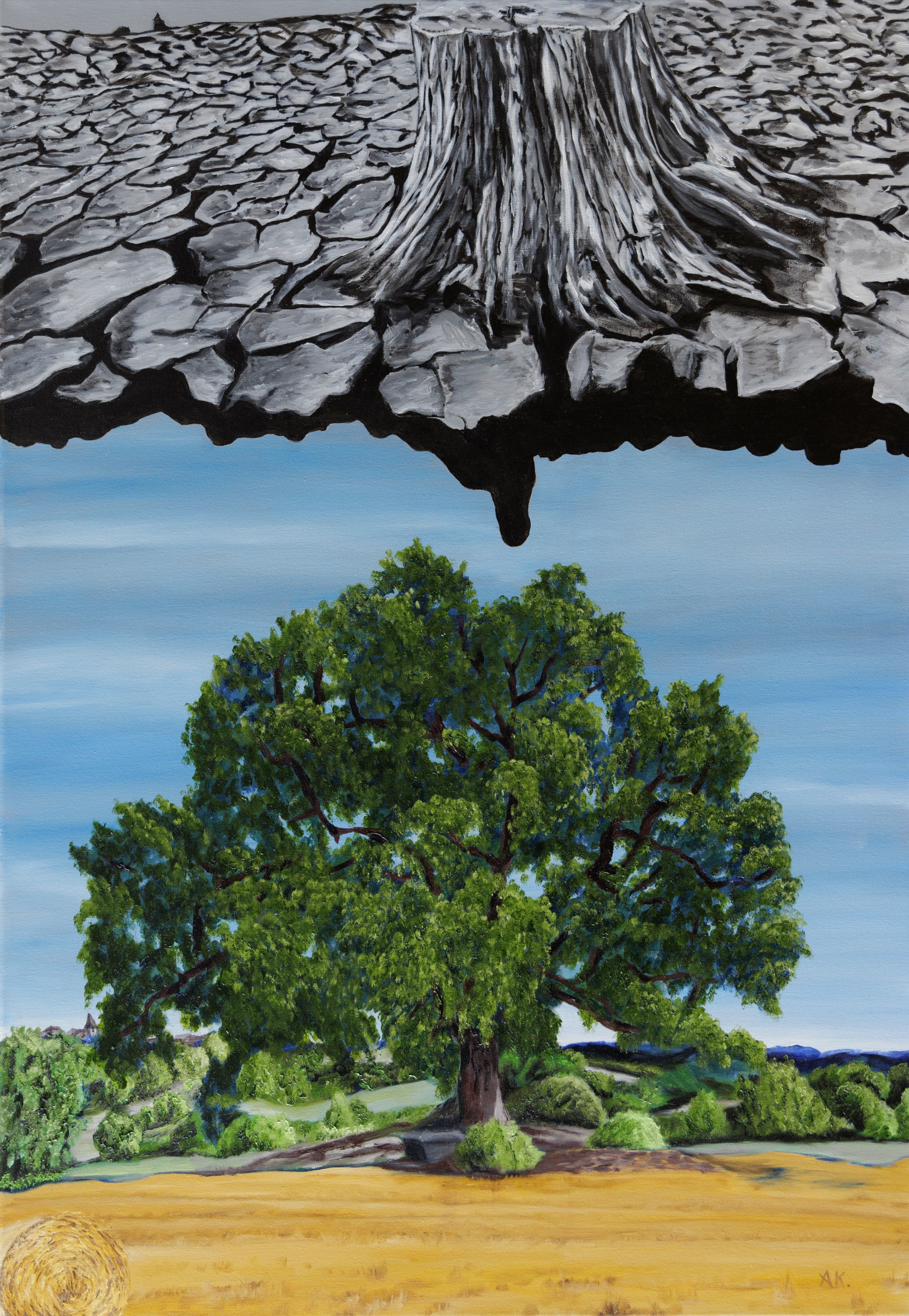 Cette huile sur toile aborde l’impact dévastateur de la déforestation pour des projets d’infrastructure tels que la construction d’autoroutes. Je mets ici en lumière une vérité souvent négligée : ce n’est pas l’absence d’eau qui fait disparaître les arbres, mais l’absence d’arbres qui assèche les terres. En abattant des centaines d’arbres pour gagner quelques minutes de trajet, nous condamnons et stérilisons à court terme des territoires entiers, une aberration écologique aux conséquences irréversibles.