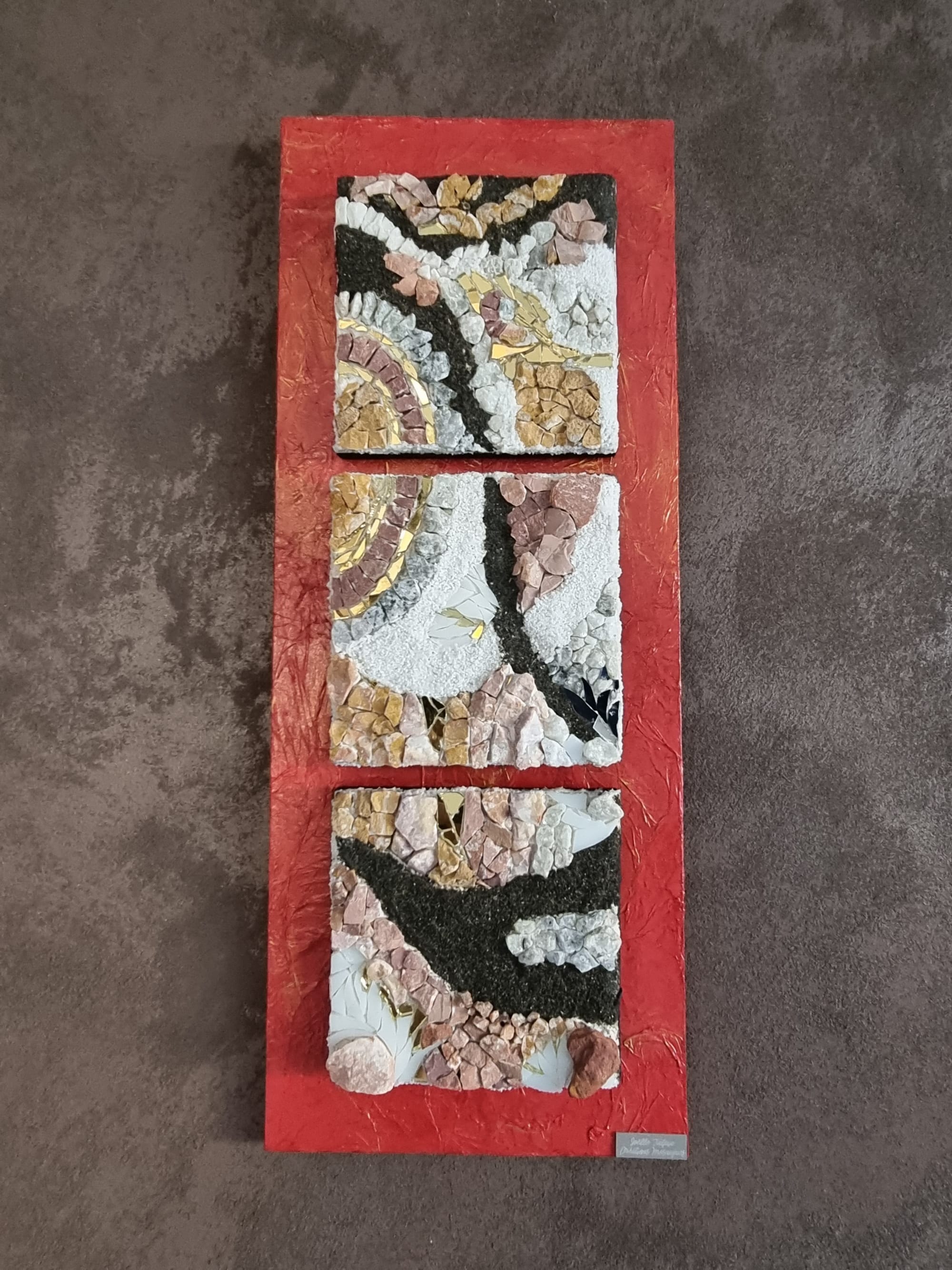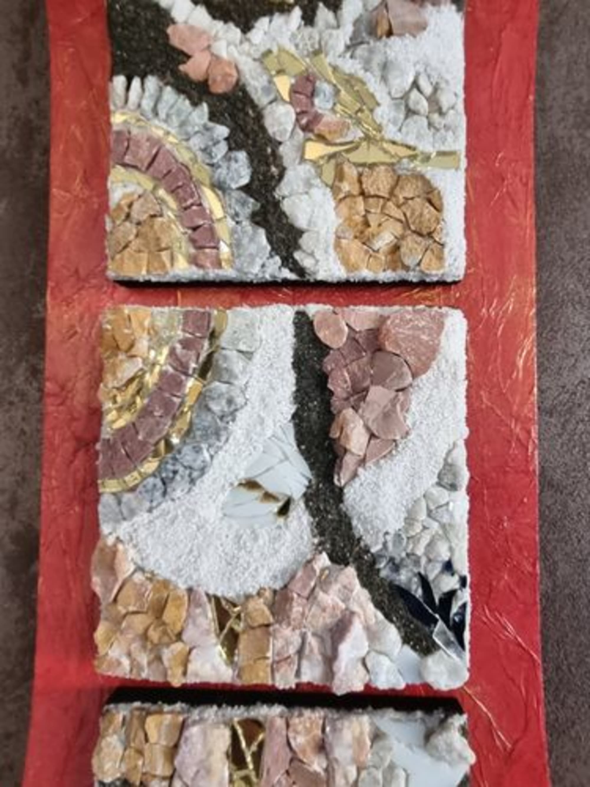 Mosaïque de verre vitrail et opaque, pierre naturelle, sable naturel, feuille d’or