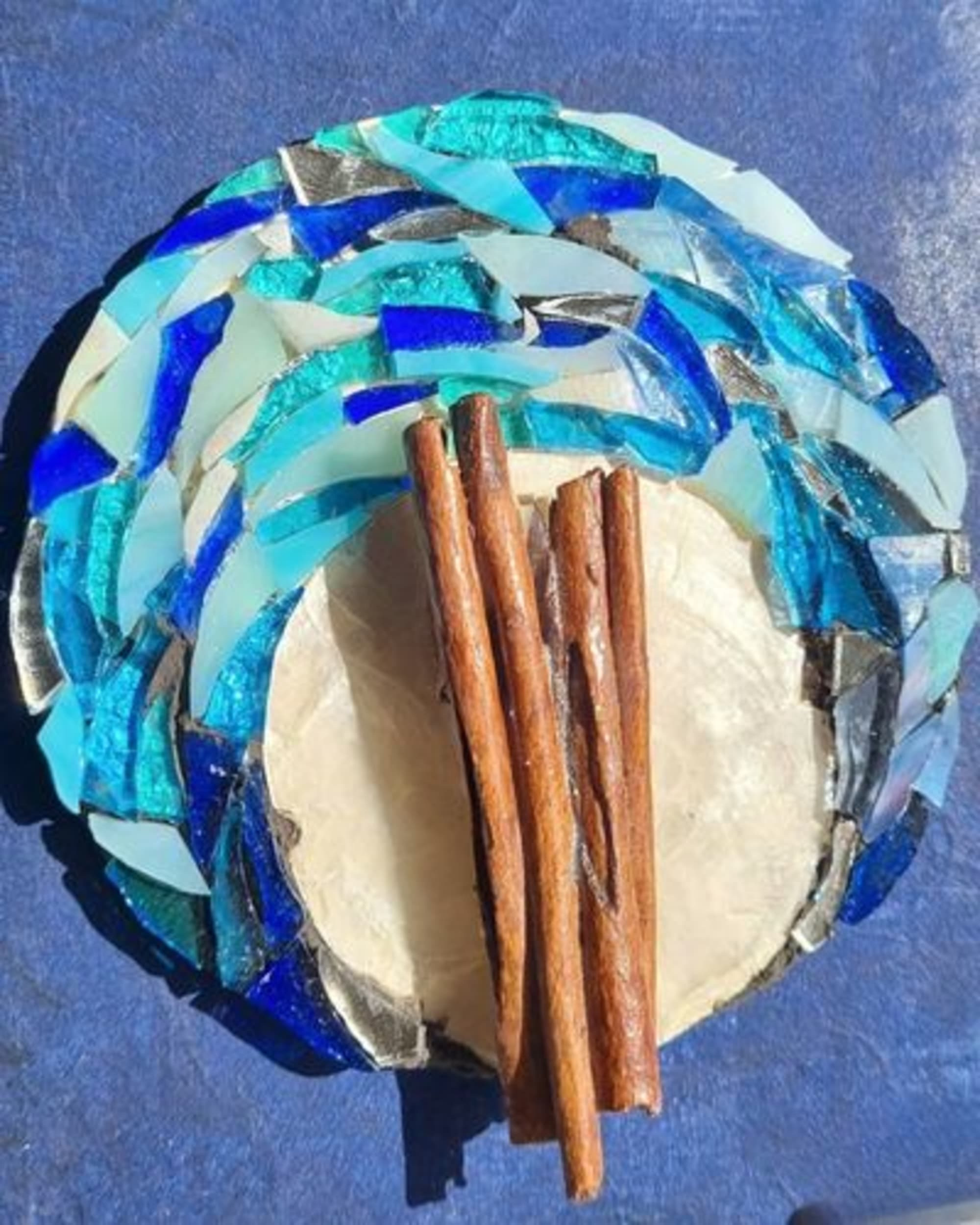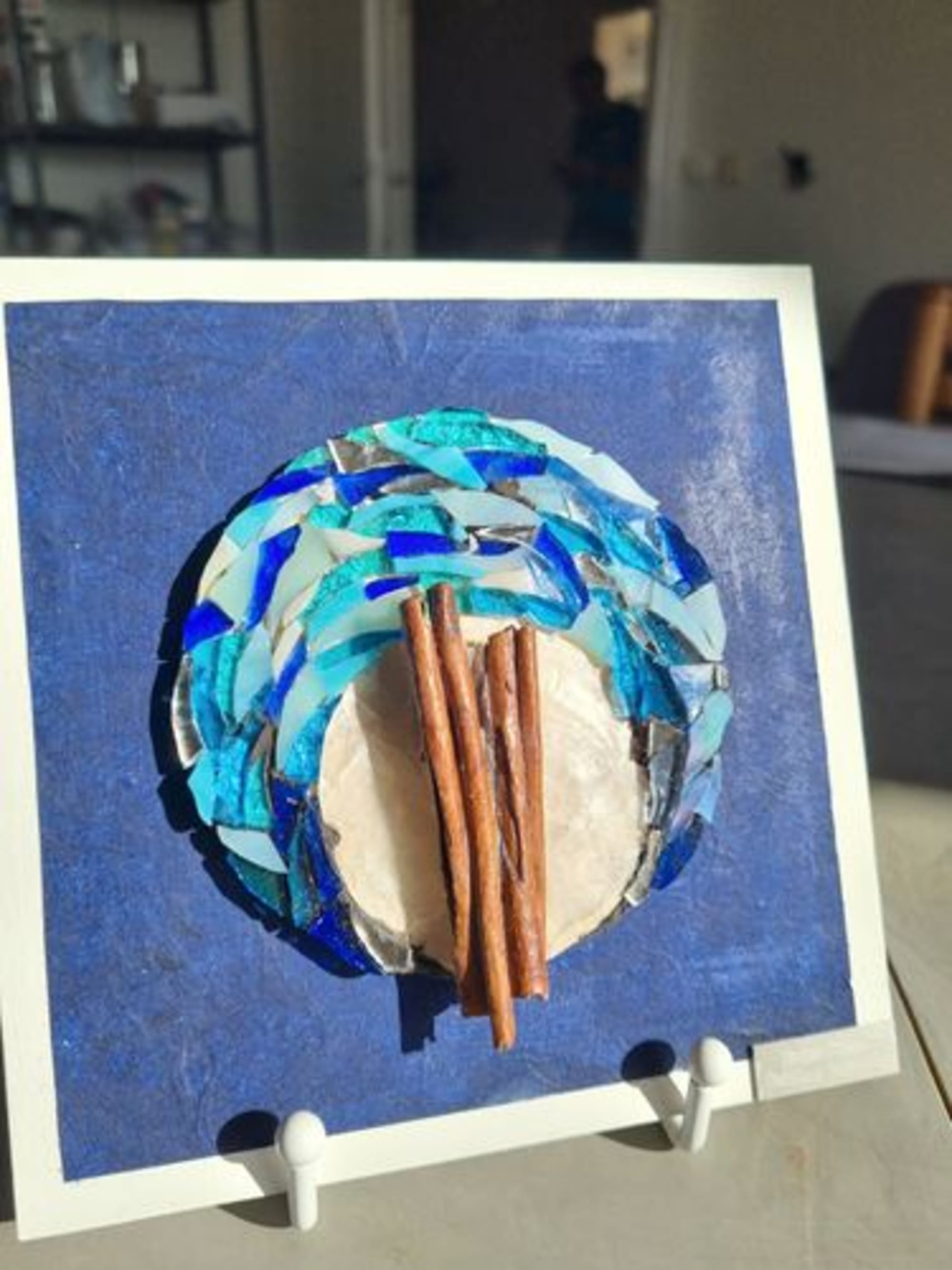 Matières : mosaïque en verre, pâte de verre, cannelle naturelle.