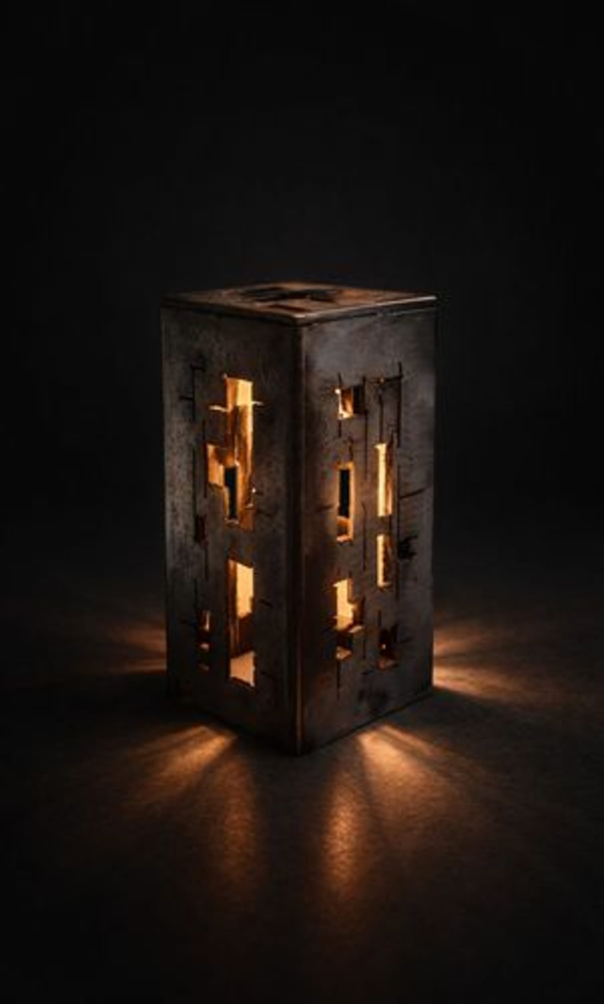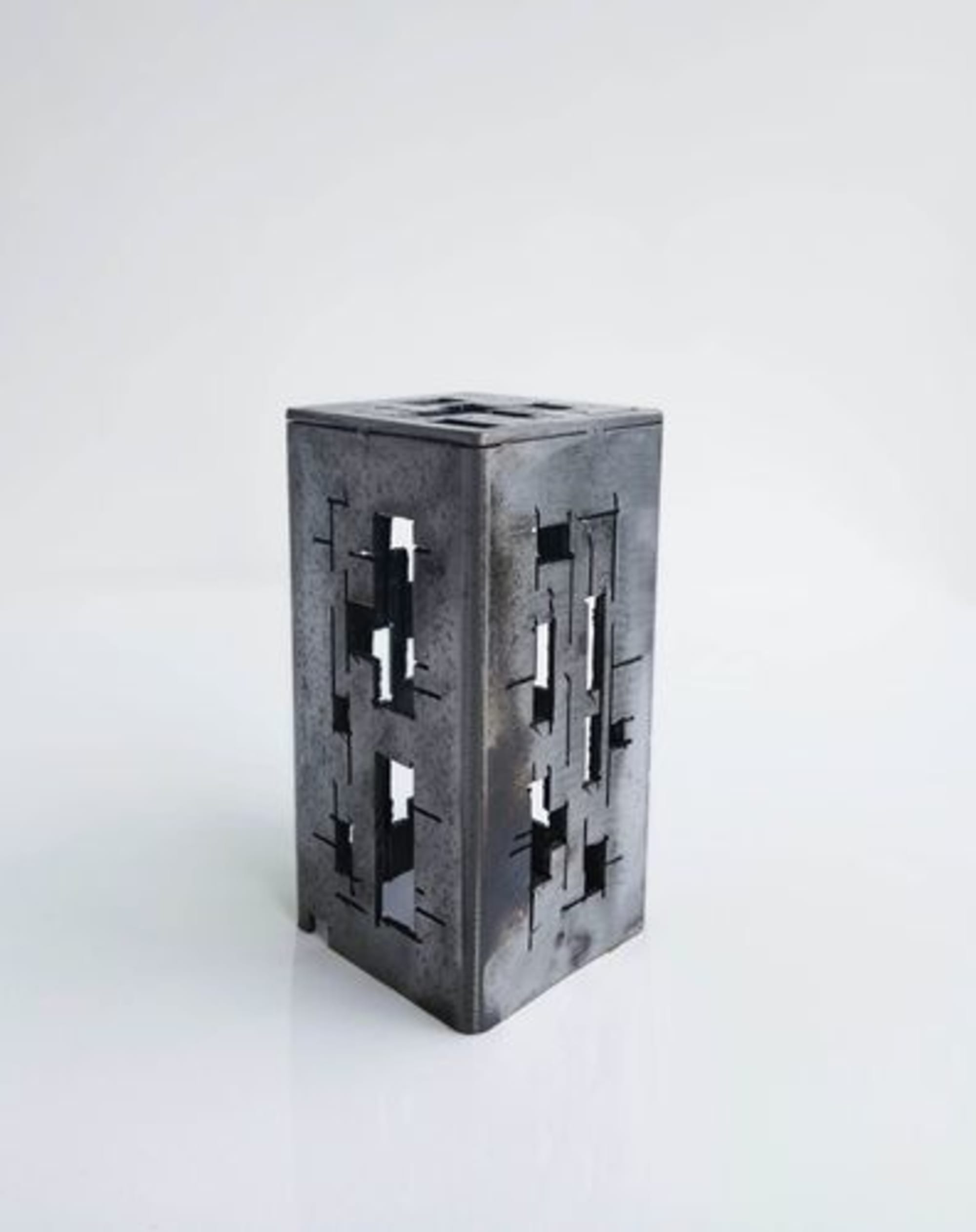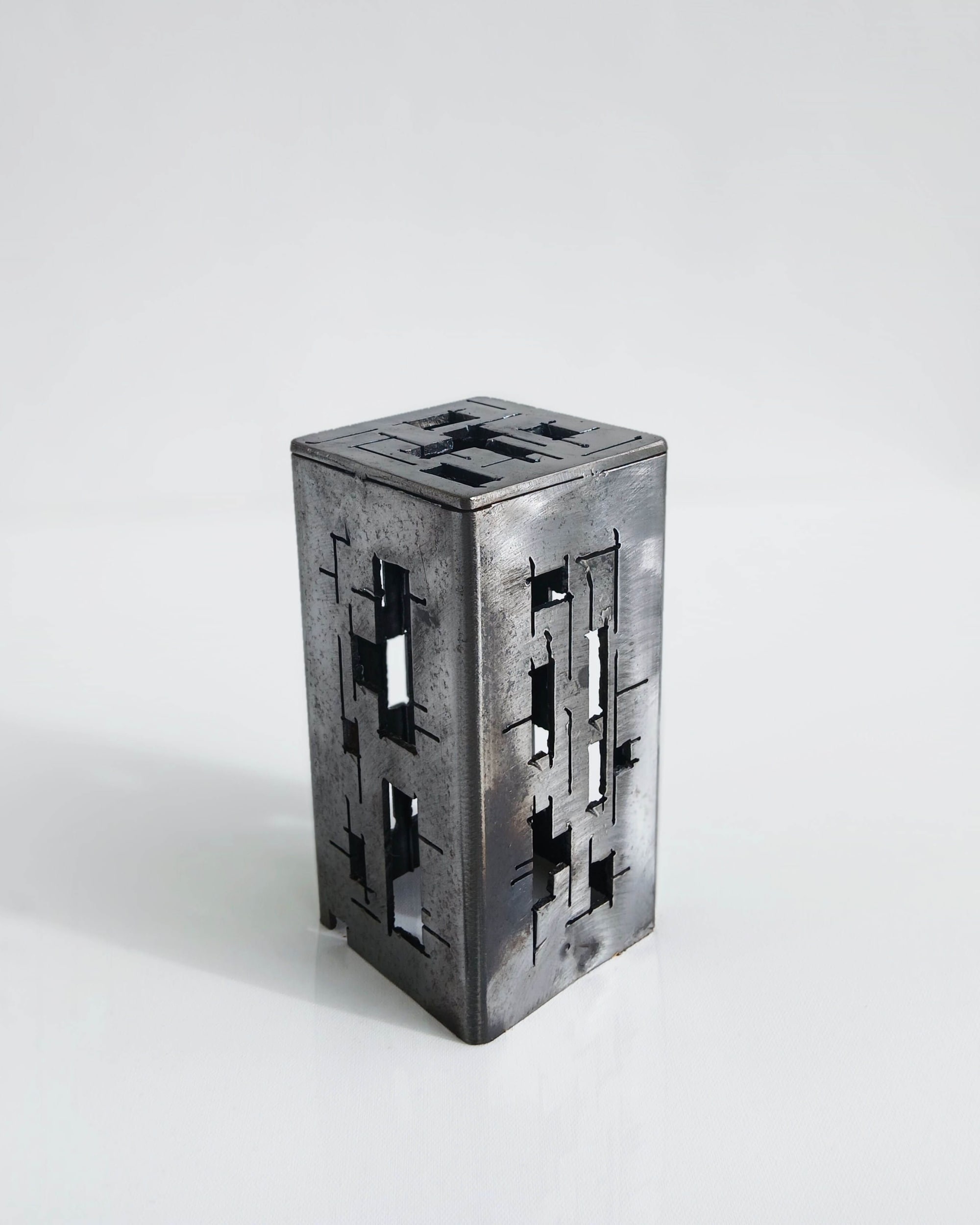 Source d’inspiration : Univers urbain futuriste. Pièce réalisée dans de l’acier de de récupération recyclé en œuvre d’art, dans une démarche “écoresponsable”. C’est une œuvre qui vit aussi bien le jour que la nuit, avec un éclairage intérieur “led” basse tension possible.